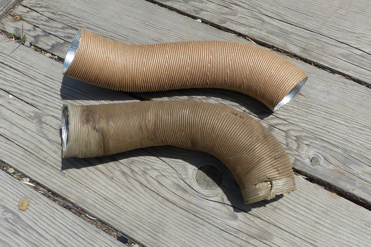 I also received a piece of vent hose from URO yesterday. The hoses from the air mixing controls to the side vents are now NLA but thanks to help from the World, I discovered URO makes a variety of reproduction foil/paper hoses. I ordered this one for the side vents and it was plenty to do both sides. 911 211 274 00: 50 x 720mm (Tan) It's a very nice reproduction of the original. Here is one piece after cutting and pre-bending. And the other side installed. Quite a change handling these hoses without them popping and cracking from becoming brittle as eggshells. Let's not kid ourselves though. This style of hose is way more fragile than the aircraft hoses that 914Rubber sells but they do preserve the original look so I'm going to stick with them. |