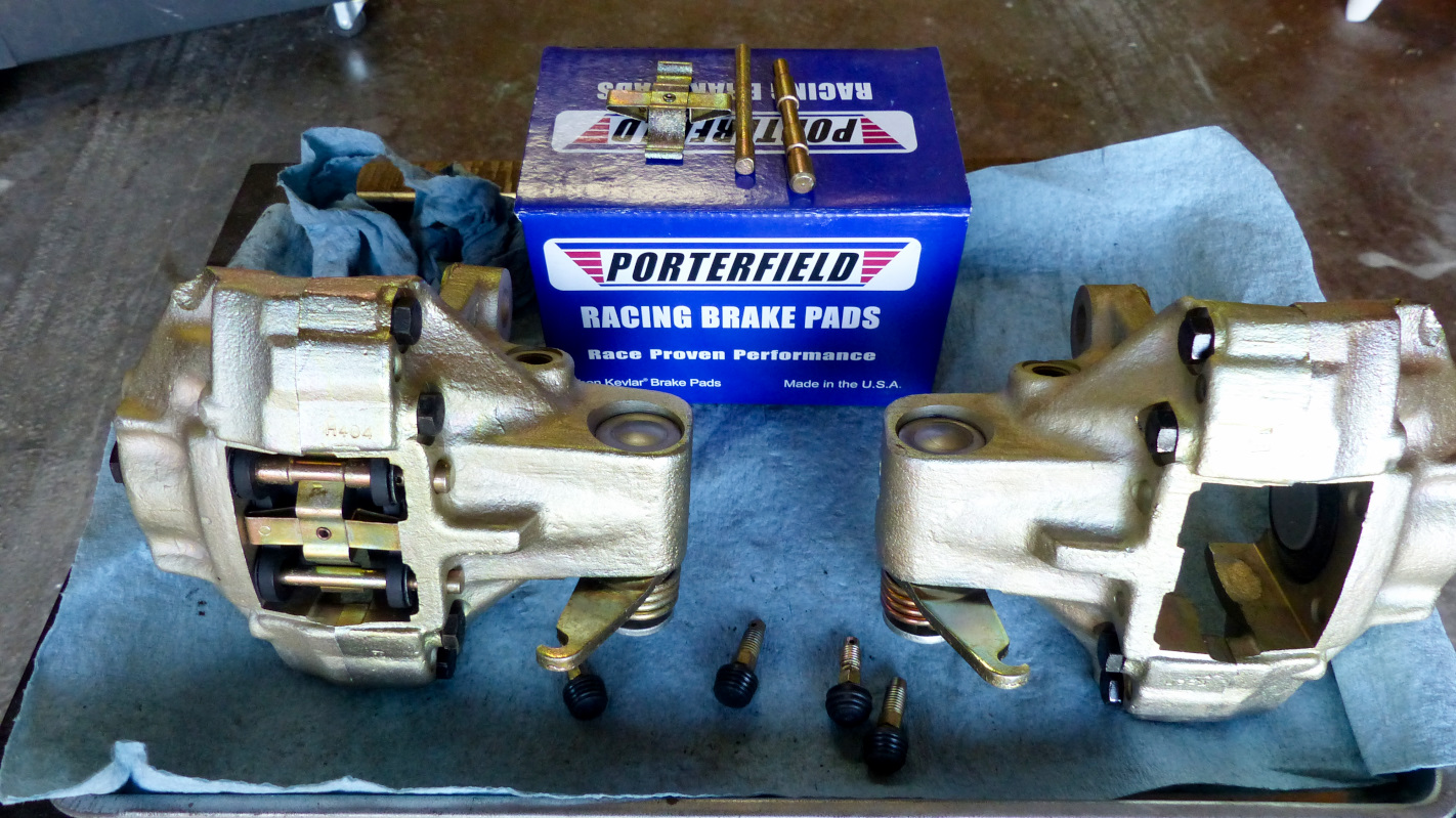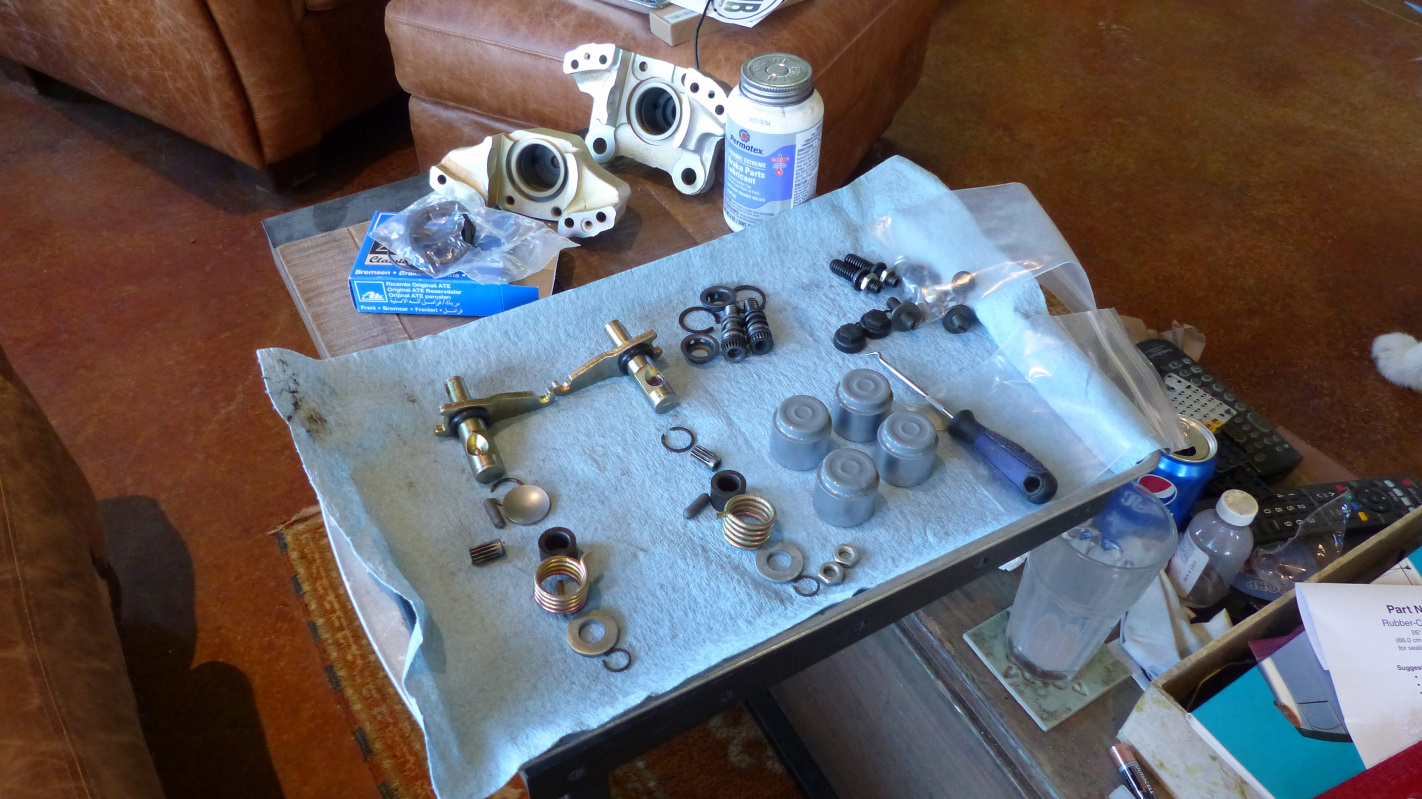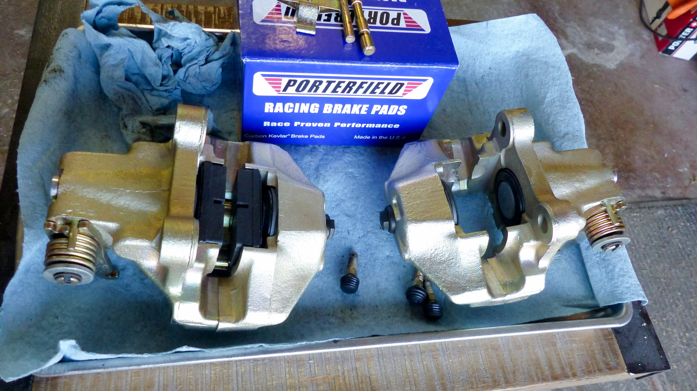 Brent, To the point of our conversation about metal working and shrinking in particular, here is a picture of a little shrinking bowl I made out of scrap Oak. My homemade shrinking tines are sitting on top. These are used to "tuck" the material by inserting the sheet metal between the tines and then giving it a sharp twist to "fold" the material into a small triangle shaped teepee formation. Then use the shrinking bowl to "push" the teepee together and downward. Works miracles for shrinking metal. Thanks for the pics Phil. I will probably follow up with questions. That project is probably going on hold for a few months while I focus on getting the exterior of the chassis painted. Received a set of plated rear caliper housings on Saturday. Apparently USPS does not want me shipping calipers though. I shipped 5 calipers (2 fronts from @sixnotfour , 2 rears from @mb911 , and my 1 early rear that I think is still good). Only 4 calipers arrived at PMB... (IMG:style_emoticons/default/WTF.gif) They were double boxed in a large flat rate box, packed tight, and wrapped with fiber reinforced tape. Package was 34 lbs. 14 oz. when weighed at the Bozeman post office. Half the max weight for allowed for a flat rate box. Calipers weigh about 6.5 lbs each so there is little question there were 5 of them in that box but then I got a call from Eric saying only four arrived. Regardless, Eric gave me a generous credit for the calipers so I wound up breaking even after the USPS insurance payment for the other lost caliper and generous donations of cores. I'm going to call it good. Enough complaining. On with the show. Here's one of the housings ready to receive the pile of parts to make it a caliper again. Assembling calipers is a breeze thanks to @Eric_Shea 's great tutorial vid. And on the car almost ready for action. Just need to set vent clearances before putting the wheels back on. Should have the fronts before too long and then I get the scary job of getting the car back on the ground. |