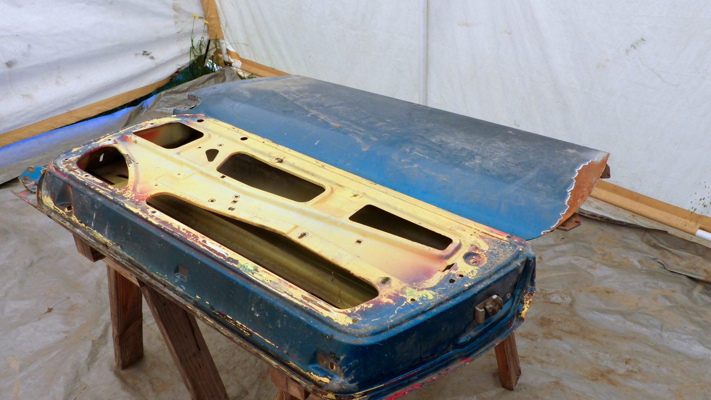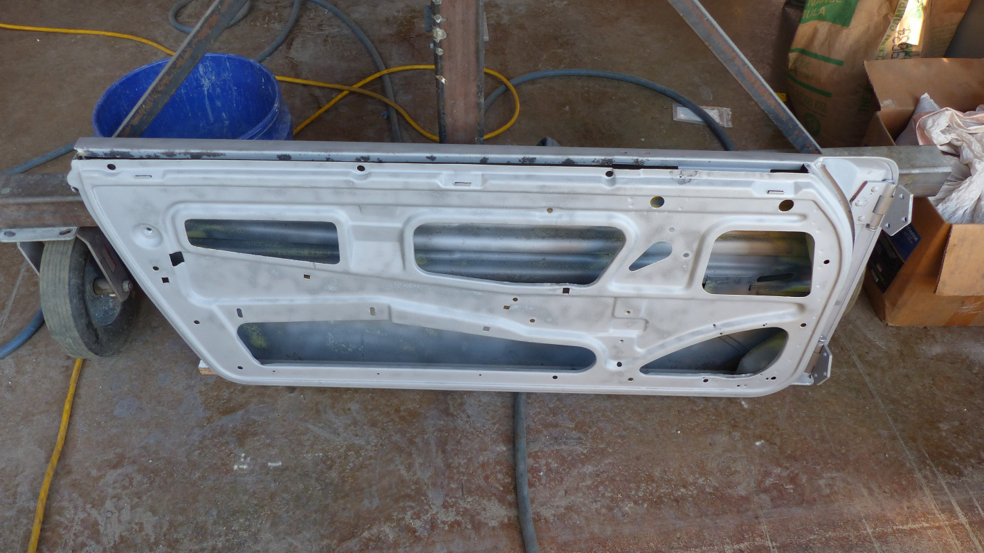Brent, I’m loving every minute of this thread. Sorry bout the snow, we’ve had a month of rain. “Waiting for the sun” cue the Doors..... That coil set-up. Very slick! Keep at it. Doors – Waiting For The Sun Lyrics At first flash of Eden, we race down to the sea. Standing there on Freedom's Shore. Waiting for the Sun (3x) Can you feel it now that spring has come. And it's time to live in the scattered sun. Waiting for the Sun (3x, pause, again slower) Waiting.... Waiting.... Waiting.... Waiting.... (2x) Waiting for you to - come along Waiting for you to - hear my song Waiting for you to - come along Waiting for you to - tell me what went wrong This is the strangest life I've ever known. Yeah! (Riff 8x) Can you feel it now that spring has come. And it's time to live in the scattered sun. Waiting for the Sun (3x) Waiting... For... The suuuuun. (Riff 2x) Speaking of The Doors... I finally got around to cleaning up the doors I got from @914work that @Kelty360 delivered last year. Multiple coats of paint in every color to remove. These doors have had non-stock mirrors on them. Creative mountin on the passenger door to be fixed. Luckily, they didn't mess with the hidden mounting nuts. The drivers door got a set of rawl plugs jammed into the mountin holes. That's right, I said rawl plugs you wankers. (IMG:style_emoticons/default/biggrin.gif) I started with chemical stripper to get most of the paint off. Of course, that revealed a hidden surprise on each door. Looks like they got the old slide hammer treatment to pull a couple creases. That might be typical sloppy body work from the 70s or 80s, but I have to cut them a little slack because that 2-ton crash bar is right behind these blocking access to the back side for a dolly. I'll see what I can do with a shrinking disk and spoon but will probably wind up having to put filler back in. Then to media blasting. Only got one door done. Blasting sure is fun... NOT! |