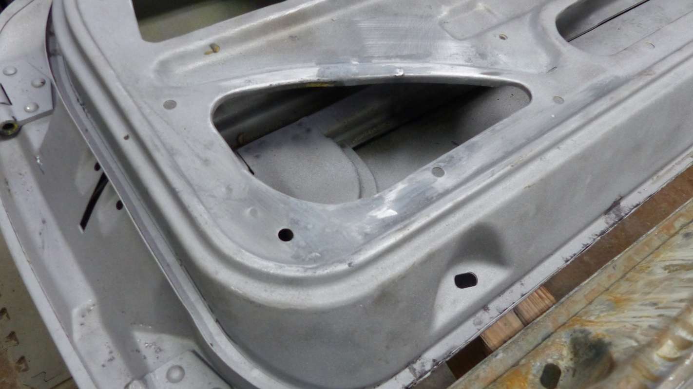 Someone had also drilled the door for an after market mirror so a couple more holes to fill. Happy to post intermediate progress shots if someone is dying to see them, but I think the pics of filling holes gets repetitive. Skipping to the finished shots. These doors also apparently had speakers in them at some point. Luckily, they didn't cut the doors - just drilled a bunch of screw holes and mangle the flanges a bit. I straightened out the flanges with hammer and dolly and welded the holes shut. Again, straight to the finale. The driver's door had this nasty corrosion and split in the channel that needed to be fixed. I decided to try just welding it shut. It is a PITA location that is tight and hard to position the welding nozzle, and I'm still a crappy welder, but I think I did a fair job of it. And finished with a little bit of reinforced filler. |
