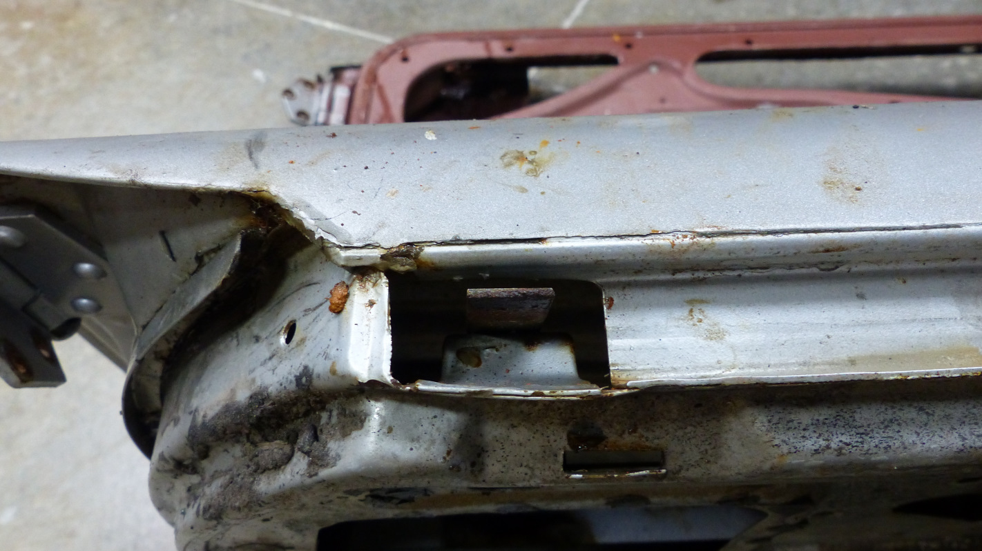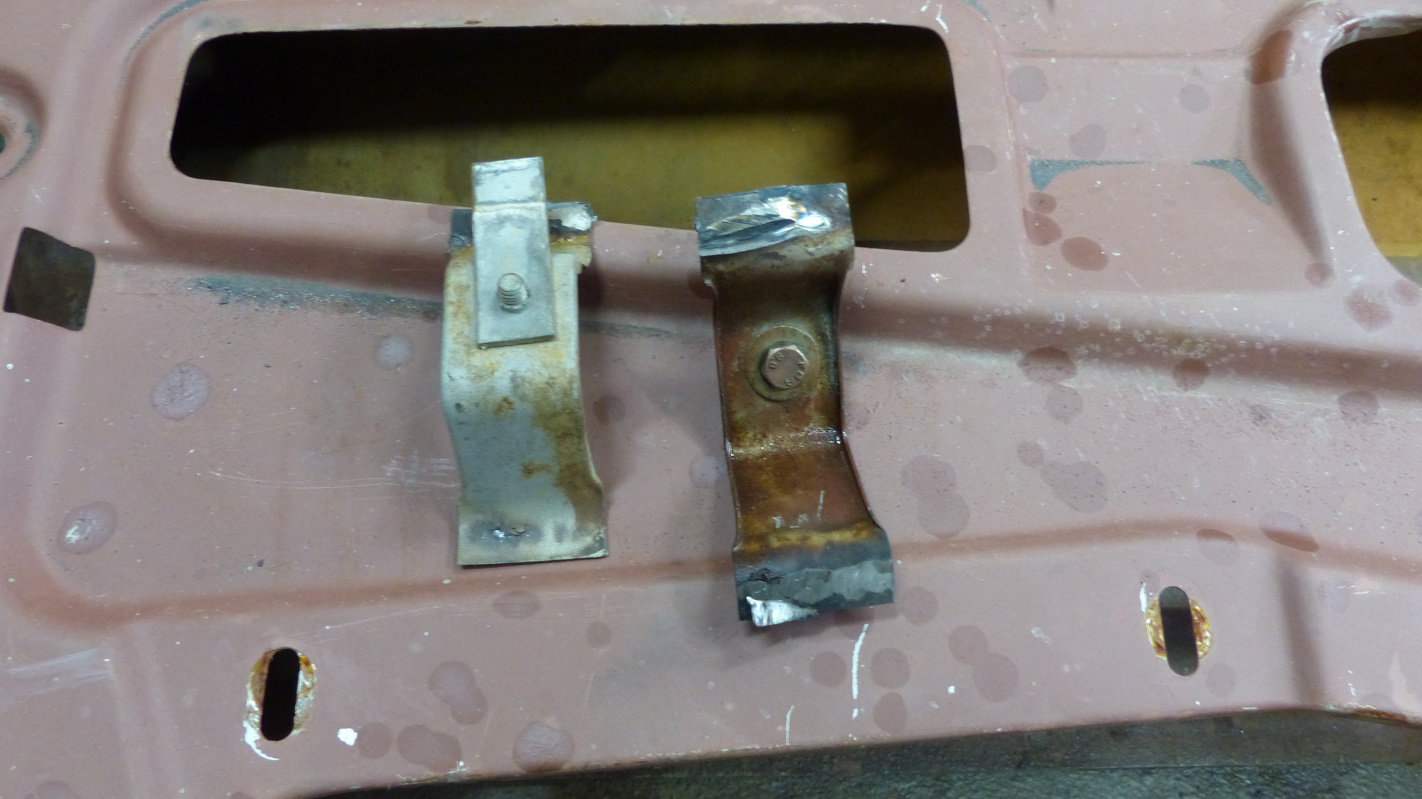 Here was the most interesting part of the doors. Both my original and replacement donor doors are late style. Trust me, I have the hernia from lifting them to prove it. My original doors had these brackets with metal tabs bolted to them that were missing from replacements.