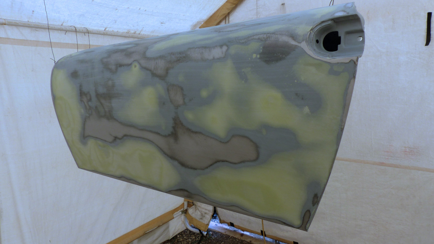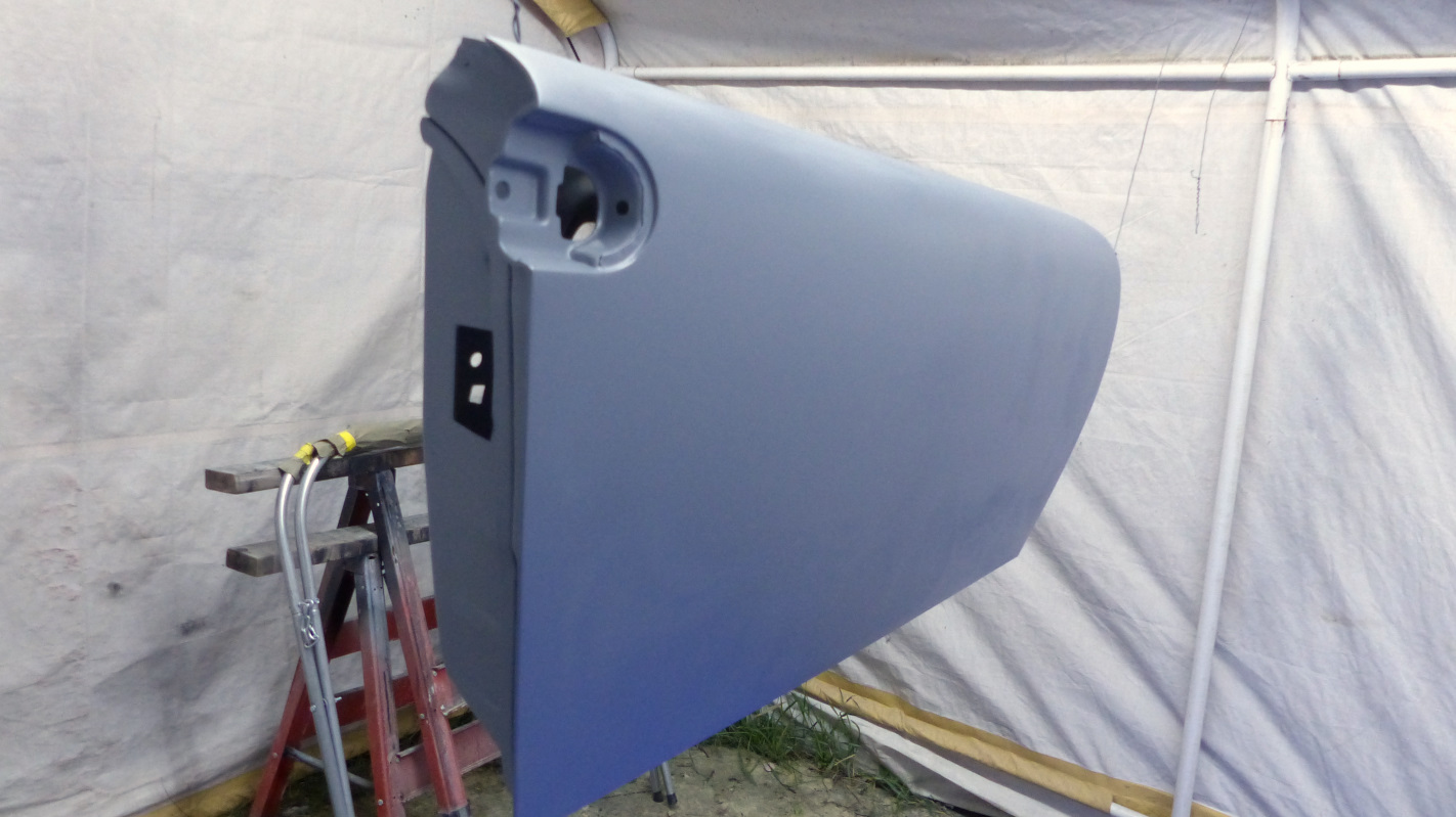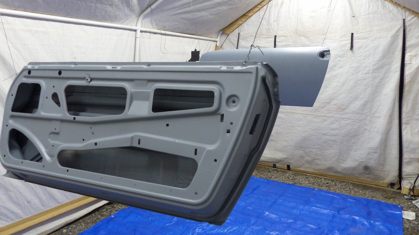 Then I coated all the internals with Eastwood Internal Frame Coating. Here's a tip when using this stuff, wipe up runs and drips right away. It does not sand easily. It's like sanding gummy bears. I spent all day Saturday re-configuring for paint. I hosed down the inside of the tent and gave the shop a thorough cleaning and reorganization. Plating buckets were temporarily stored out of sight, and painting materials took their place. By the end of the day, I was able to stow panels in the tent ready for final cleaning. Got the panels cleaned and hung on Sunday with the hope of spraying primer after work on Monday, but the weather turned to shit and I didn't want to spray while it was raining. Today was cloudy and cool but around noon, temps crept into the 60s, so I knocked off work early and shot the panels. With the cool temps, I doubled induction and flash times. Tomorrow is supposed to be sunny and warmer so the paint should cure nicely before skim coating with filler to block them straight. |