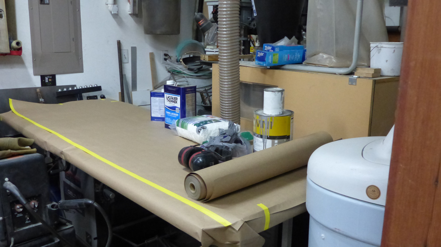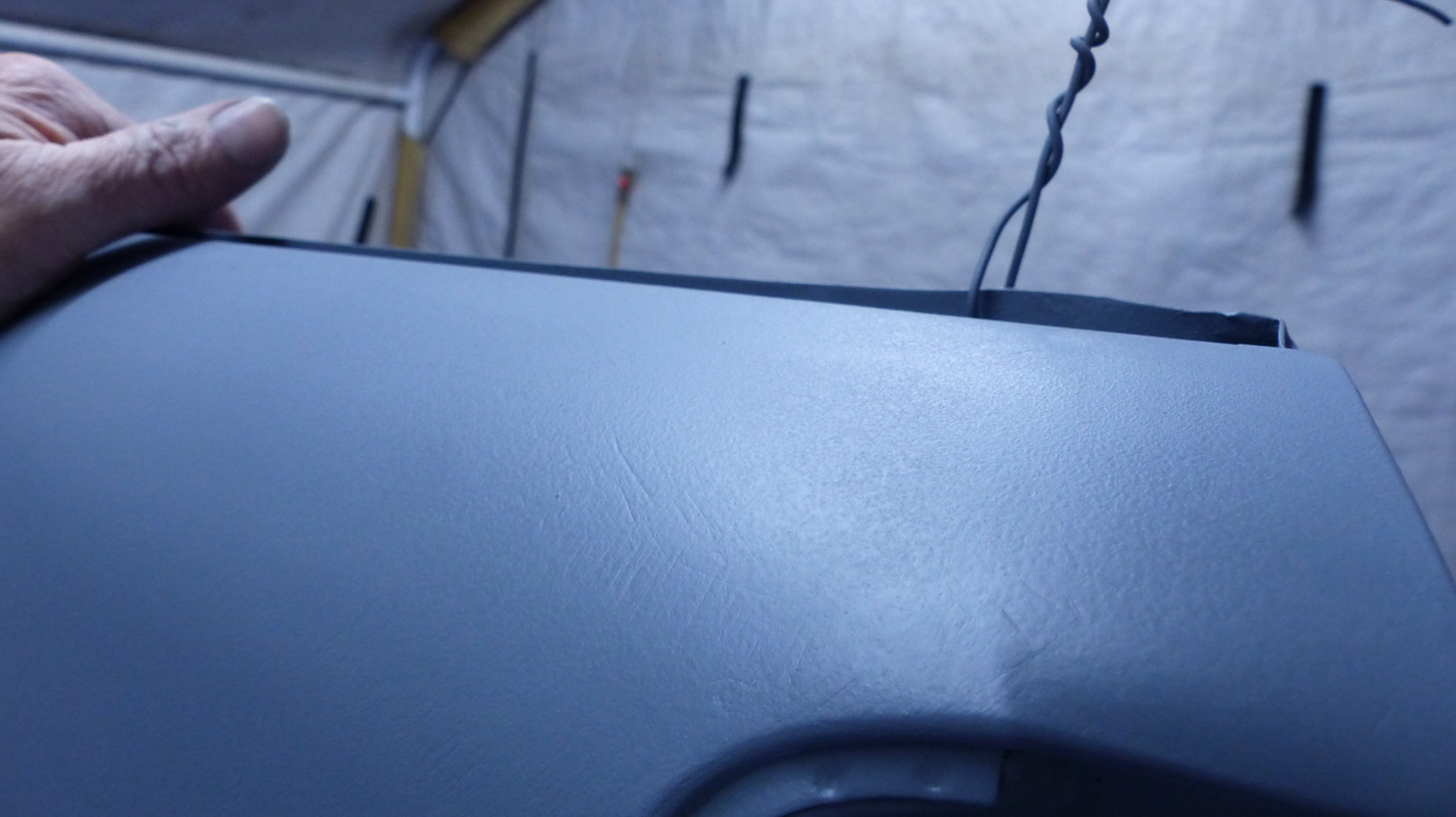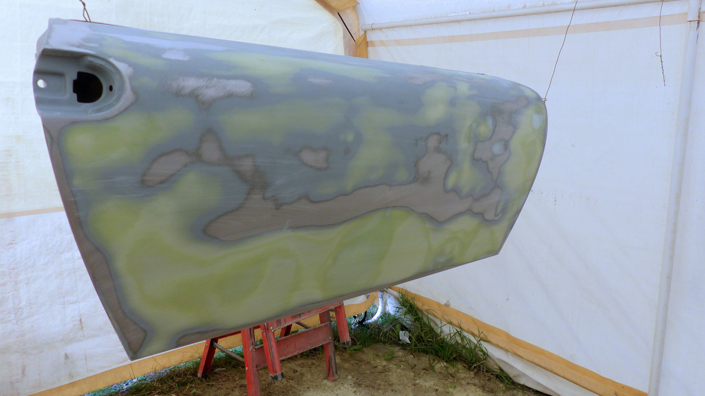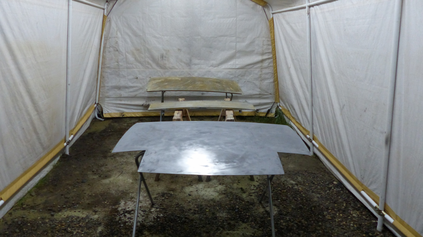 Then I coated all the internals with Eastwood Internal Frame Coating. Here's a tip when using this stuff, wipe up runs and drips right away. It does not sand easily. It's like sanding gummy bears. I spent all day Saturday re-configuring for paint. I hosed down the inside of the tent and gave the shop a thorough cleaning and reorganization. Plating buckets were temporarily stored out of sight, and painting materials took their place. By the end of the day, I was able to stow panels in the tent ready for final cleaning. Got the panels cleaned and hung on Sunday with the hope of spraying primer after work on Monday, but the weather turned to shit and I didn't want to spray while it was raining. Today was cloudy and cool but around noon, temps crept into the 60s, so I knocked off work early and shot the panels. With the cool temps, I doubled induction and flash times. Tomorrow is supposed to be sunny and warmer so the paint should cure nicely before skim coating with filler to block them straight. |