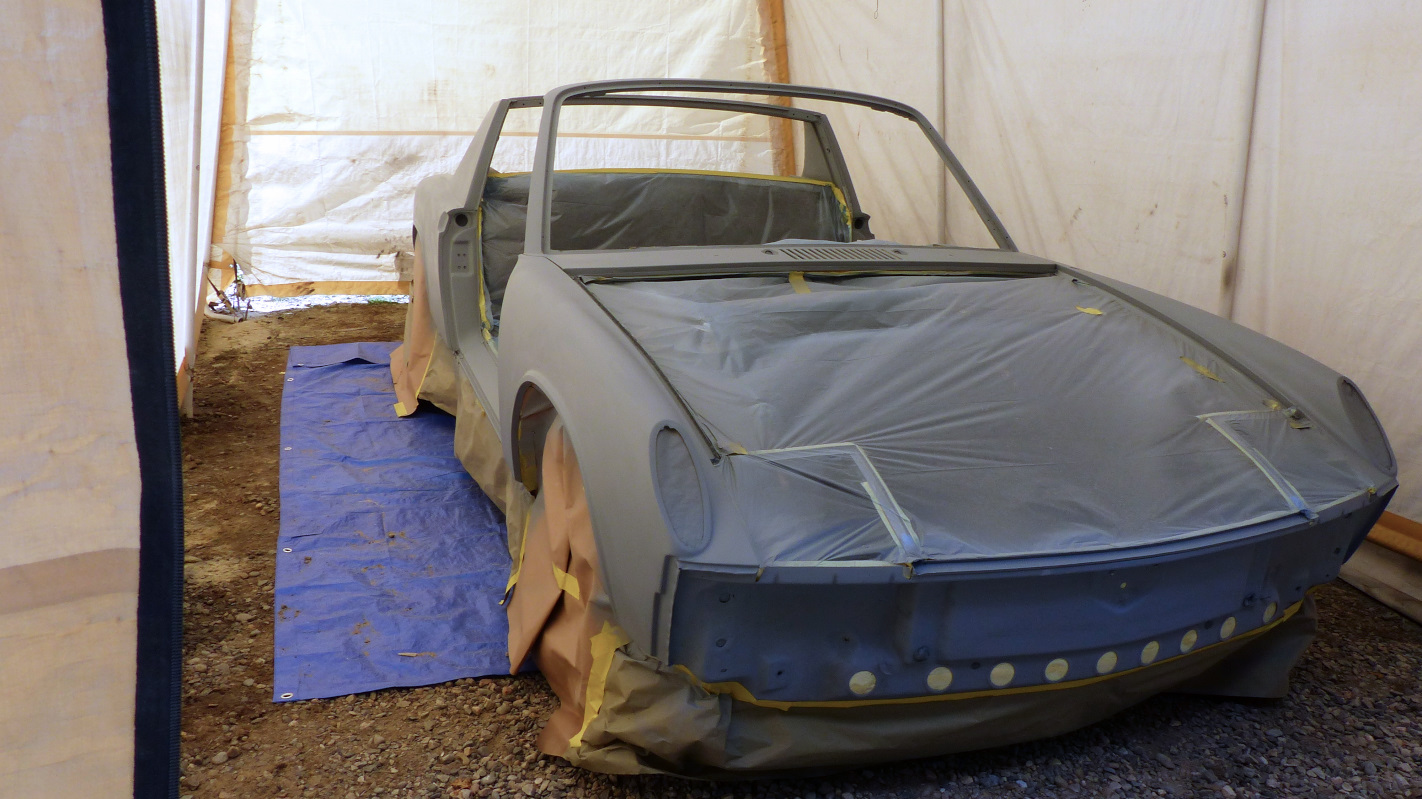After getting the doors in primer, I applied some Noico sound deadener to the insides where the factory had sprayed tar stuff. I added some to the top too because, you know, those doors aren't heavy enough (IMG:style_emoticons/default/huh.gif) It makes a huge difference in silencing those doors though. Then I skim coated the outer skins with filler and block sanded them flat. Here they are ready for final epoxy primer. Then it was short work to shoot primer. No shiny tin foil inside these doors. I found a spot with a few 80 grit scratches I missed. I guess I'll fill those with a spot of glazin putty before shooting surfacer. Next, the chassis got a very careful inspection to tidy up any pinholes, scratches, imperfections, and those plug welds you all complained about. This took a LOT of time but paid off. After primer, I've found just a couple of spots that will need glaze but that will wait for another post. Here she is yesterday, several hours after primer. I'll take a better shot later. In case you are wondering about that gravel floor, that will be covered and sealed before spraying color. I got the shit scared out of me when I walked by the zipped shut tent and this popped out. That's where I stopped clicking pics. I got both deck lids skim coated and blocked down to 320 grit last night and around mid-morning today, I reshot them with primer. Spent tonight adding additional masking in prep for surfacer. The weather forecast is giving me two more partly sunny days in the upper 60s. I'm hoping to get surfacer applied by the end of Thursday. Our first winter storm is predicted to start on Sunday. If I can get the surfacer on this week, I can use the bad weather time to prep the tent for the grand finale while the surfacer rests, then block the whole car down to a perfect surface, and hope I get another window of good weather to finish this job. (IMG:style_emoticons/default/unsure.gif) |