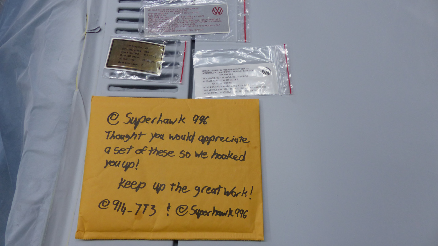 Well, another example of the help I've gotten on this project. Was surprised to find this waiting in my mailbox yesterday. Many thanks @914_7T3 and @Superhawk996 ! You know how I love stickers. I owe you again! (IMG:style_emoticons/default/beerchug.gif) Glad you like them. There will be another version of the expansion tank decal on its way to you with the correct yellow background. They ended up printing this one on gold foil (similar to the ones in a 911 engine bay) instead. (IMG:style_emoticons/default/rolleyes.gif) And thanks again! I wondered about the expansion tank decal. I thought maybe they had used a couple versions. It all makes sense now. |