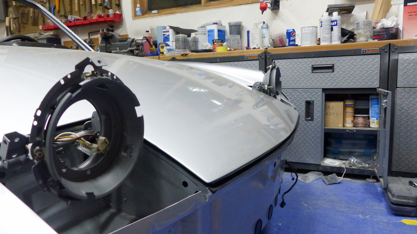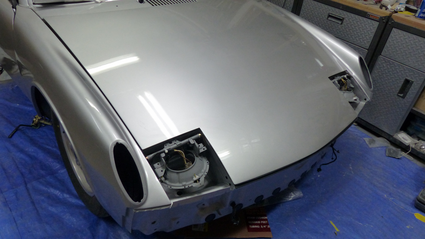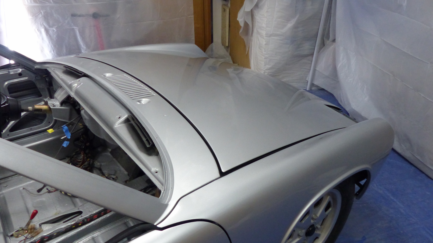 The hood is just resting on a new 914Rubber seal without hinges or latch. That's why it looks misaligned. Spent Saturday finishing the sanding, then cleaning, masking and prepping. I reshot the hood, cowl, and windshield frame with silver base followed by one wet coat of clear. Then I unmasked the left fender and shot two more wet coats. I did it that way because there was still a good amount of clear left on the fender after sanding, so I guessed it was about one coat's worth and made up the difference. I'm not sure these are in focus, but here's a couple shots after reshooting base before the clear went on. I know the flaws in the paint looked kind of minor in the pics, but trust me, they weren't. You could easily tell it was an amateur paint job from 10 feet away because of all the trash on the hood and cowl. I'll follow up with more about that, but I didn't spend the last two and a half years putting the body back together to settle for a half-assed paint job. There's no chance that Allah will be offended, but I'm MUCH happier now. I'm actually glad I spilled the paint because it force me to fix what would have been a very disappointing paint job. I still have some spots that got dry overspray in the chaos following the spill, and there are plenty of dust nibs. Yesterday I ordered this kit to correct those issues. (IMG:http://www.914world.com/bbs2/uploads_offsite/images-na.ssl-images-amazon.com-20845-1573523184.1.jpg) |