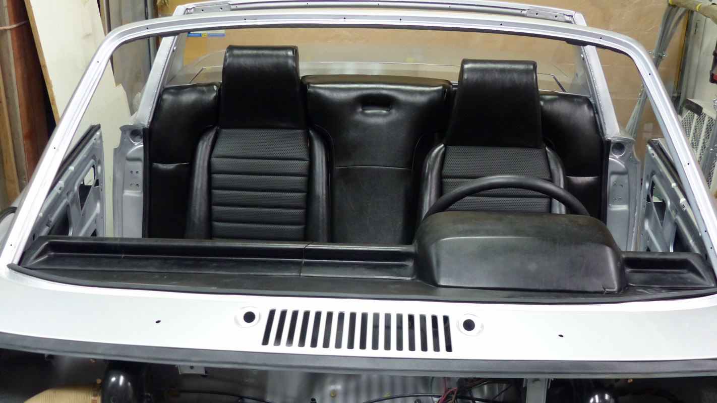 Okay, back to business. After the paint, I was eager to clear all the crap piled up in the family room out so that dictated what I did next which was to put the dash and seats in the car. Yes, the seats will come out again to install carpet, but at least they are out of the way for now.