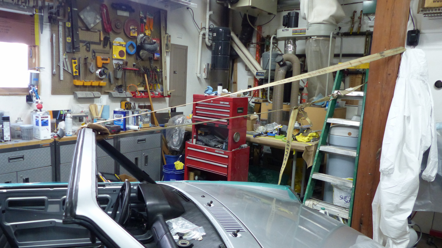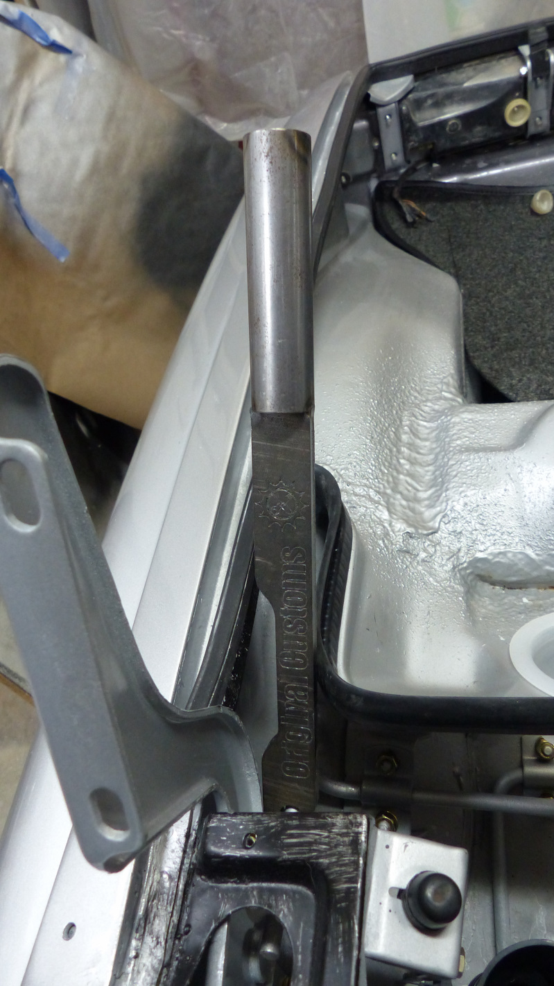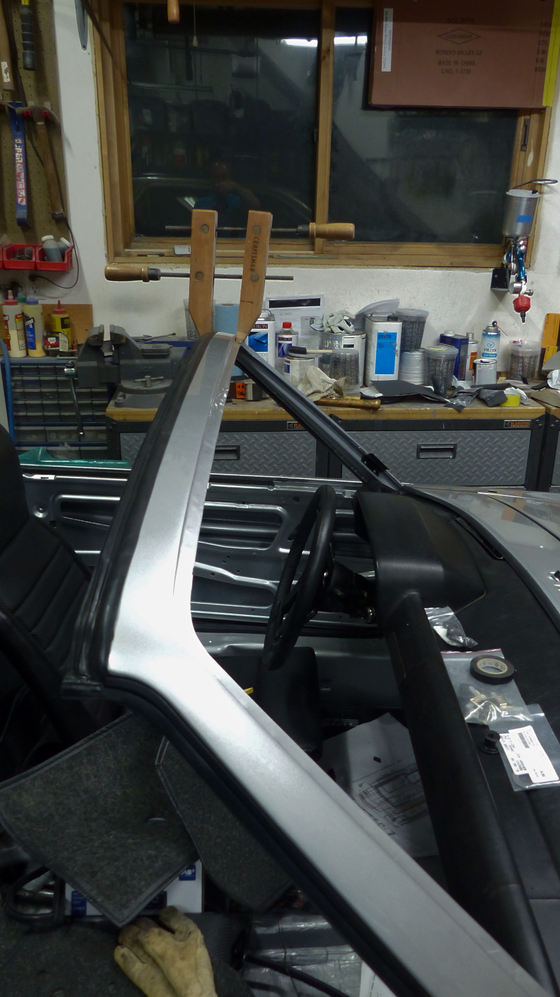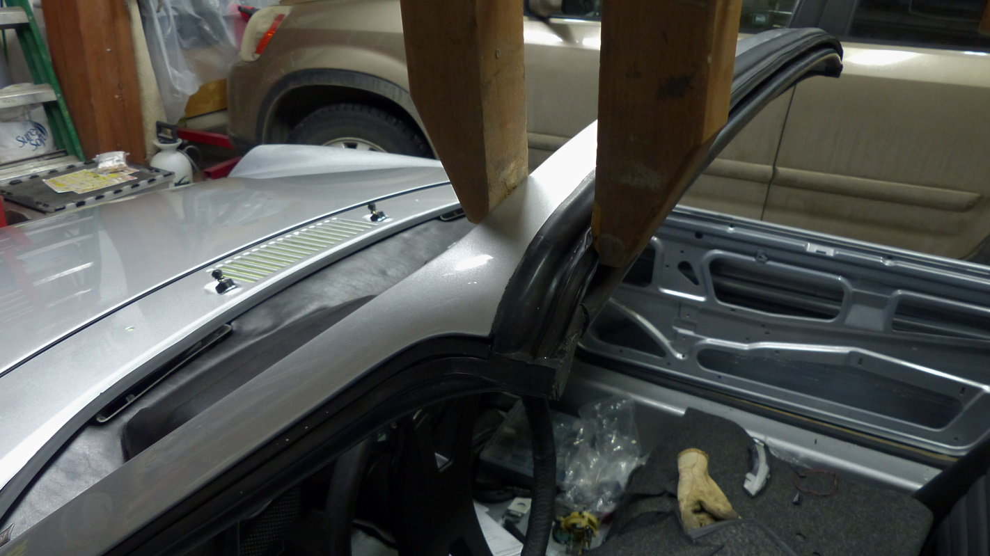 Final install of the rear lid is a bit trickier because it has to be done with torsion springs installed so the hinges are point up. Same drill though except you have to muscle the lid over the hinges and then down behind to rest on the towel padding. Installing the springs was much easier using McMark's Original Customs torsion bar tool. No broken thumbs! Now my trunk lid stays open of it's own will. Now here's something that takes either huge balls or small brains. I test fit the targa top and found a problem. It's a little hard to see, but the overhang is greater on one side and a tad too shallow on the other. After puzzling over it a bit, I deduced this was caused by many years of pulling on the windshield frame getting in and out of the car which tweaked the frame slightly. Indeed, just tugging on the frame a little corrected the targa overhang. Of course it sprang right back when released so drastic measures were in order. Enter the big ass ratchet strap and timber frame post. Just a little at a time, then remove strap and test. It only took a couple pulls and all was straight. |