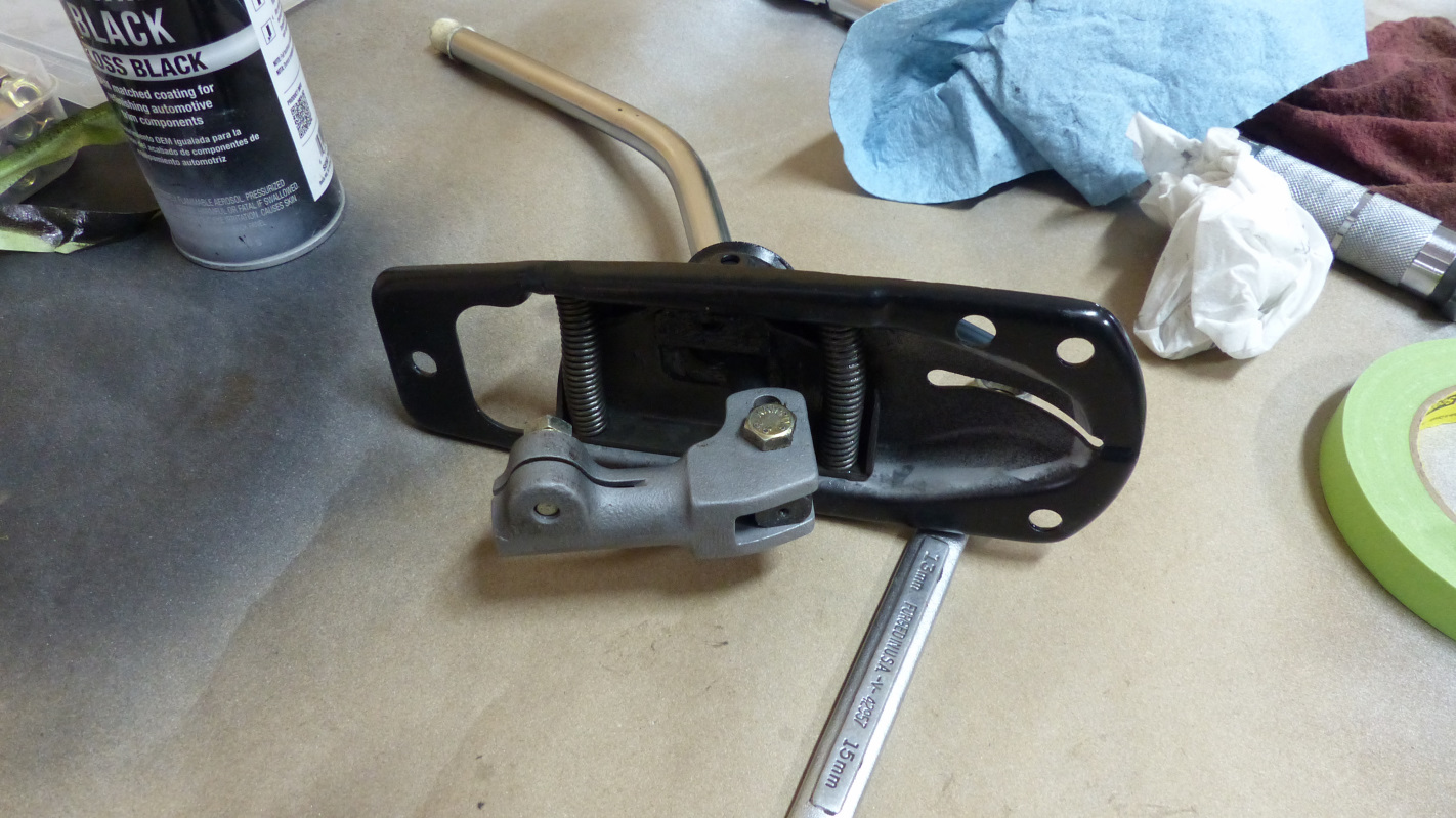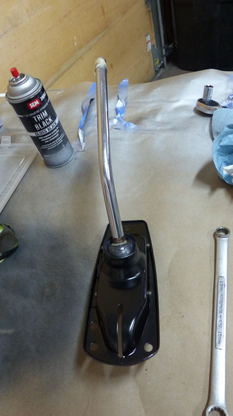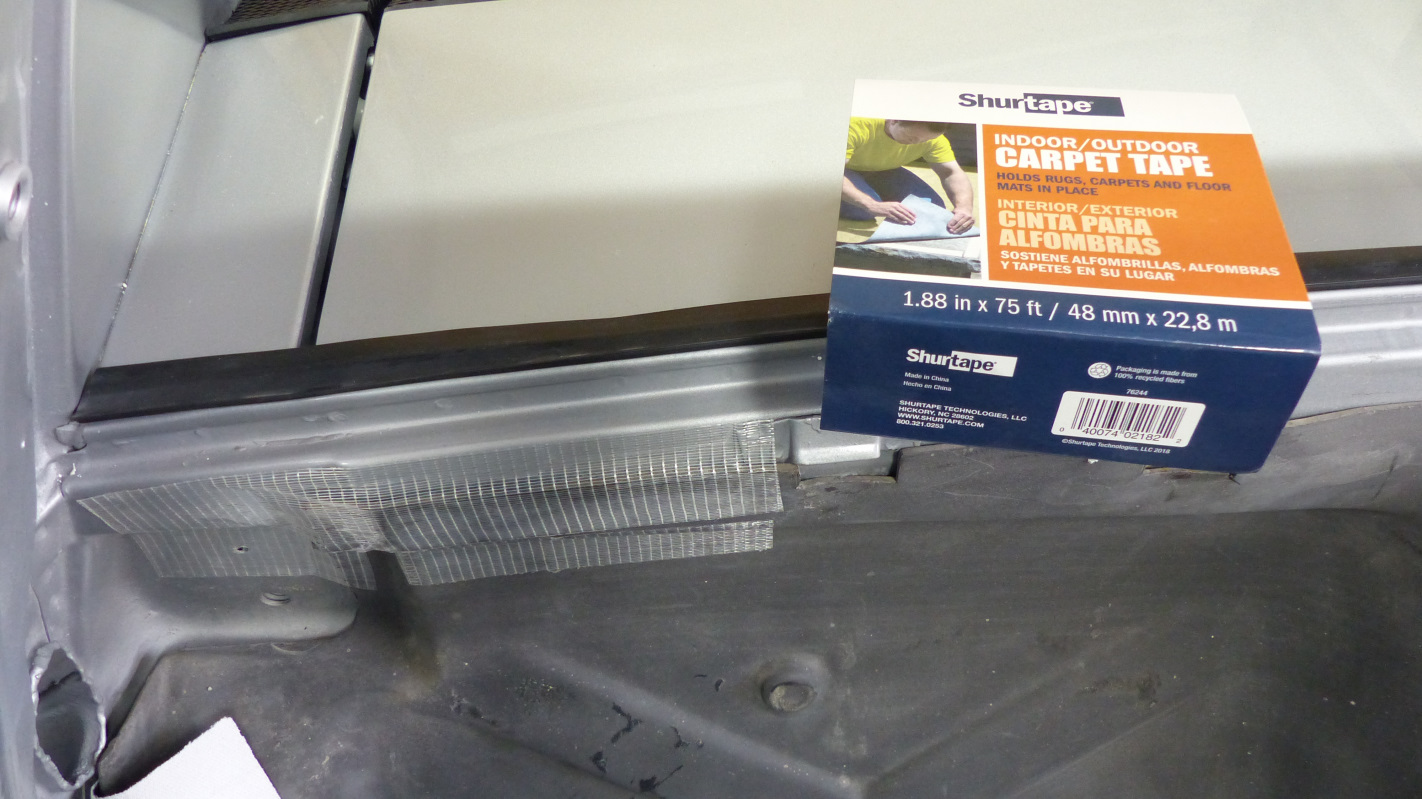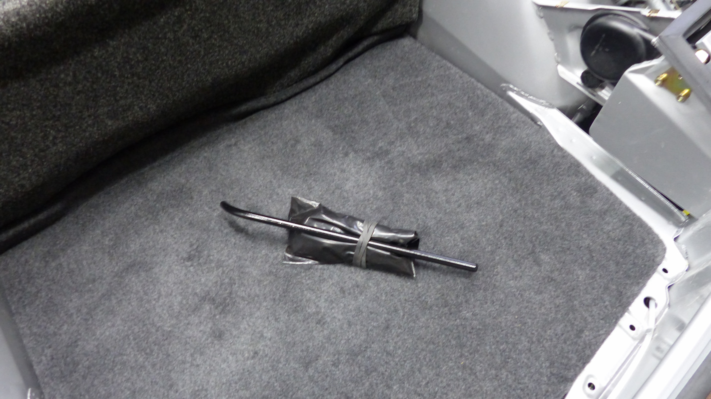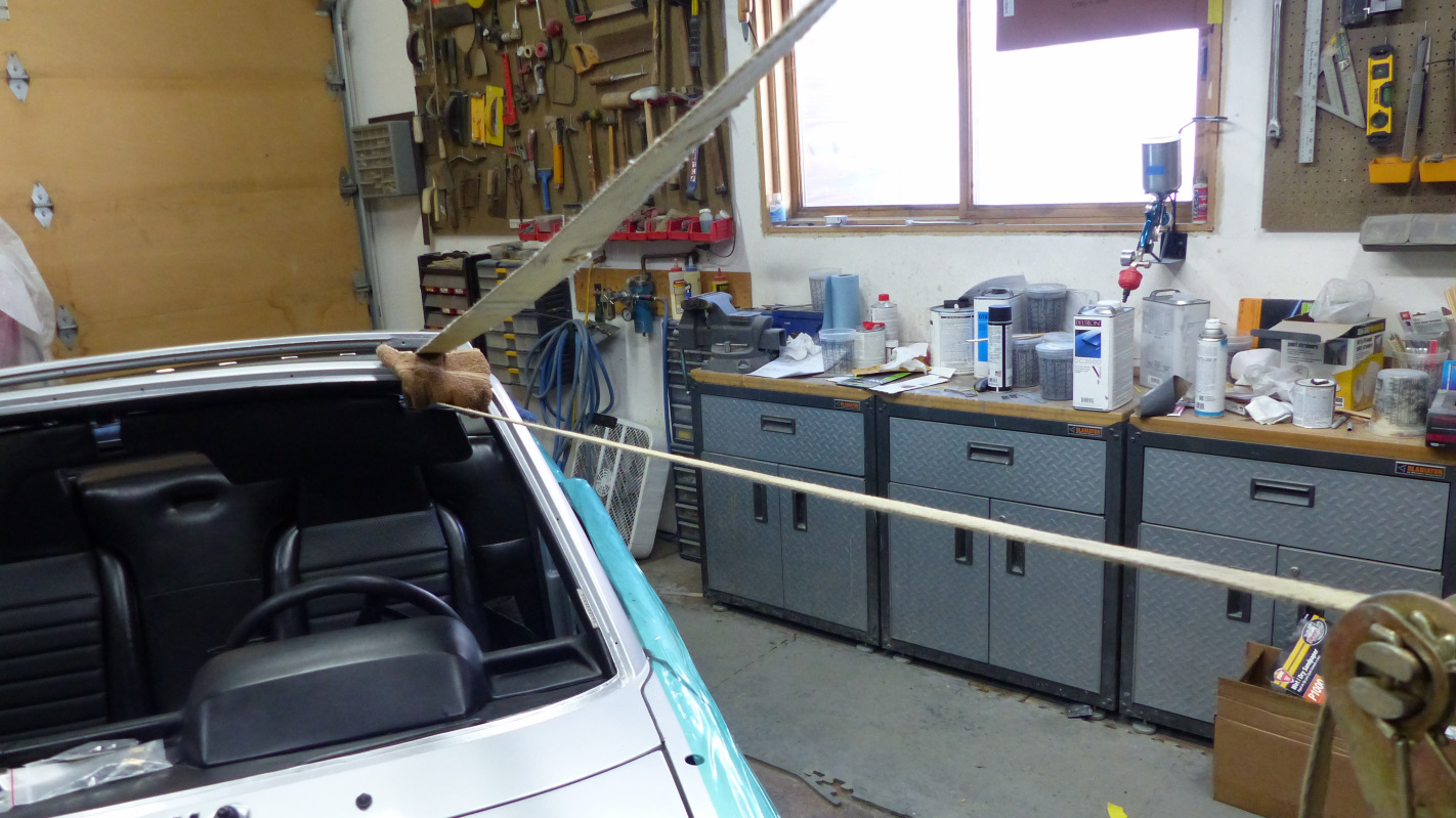 Final install of the rear lid is a bit trickier because it has to be done with torsion springs installed so the hinges are point up. Same drill though except you have to muscle the lid over the hinges and then down behind to rest on the towel padding. Installing the springs was much easier using McMark's Original Customs torsion bar tool. No broken thumbs! Now my trunk lid stays open of it's own will. Now here's something that takes either huge balls or small brains. I test fit the targa top and found a problem. It's a little hard to see, but the overhang is greater on one side and a tad too shallow on the other. After puzzling over it a bit, I deduced this was caused by many years of pulling on the windshield frame getting in and out of the car which tweaked the frame slightly. Indeed, just tugging on the frame a little corrected the targa overhang. Of course it sprang right back when released so drastic measures were in order. Enter the big ass ratchet strap and timber frame post. Just a little at a time, then remove strap and test. It only took a couple pulls and all was straight. |