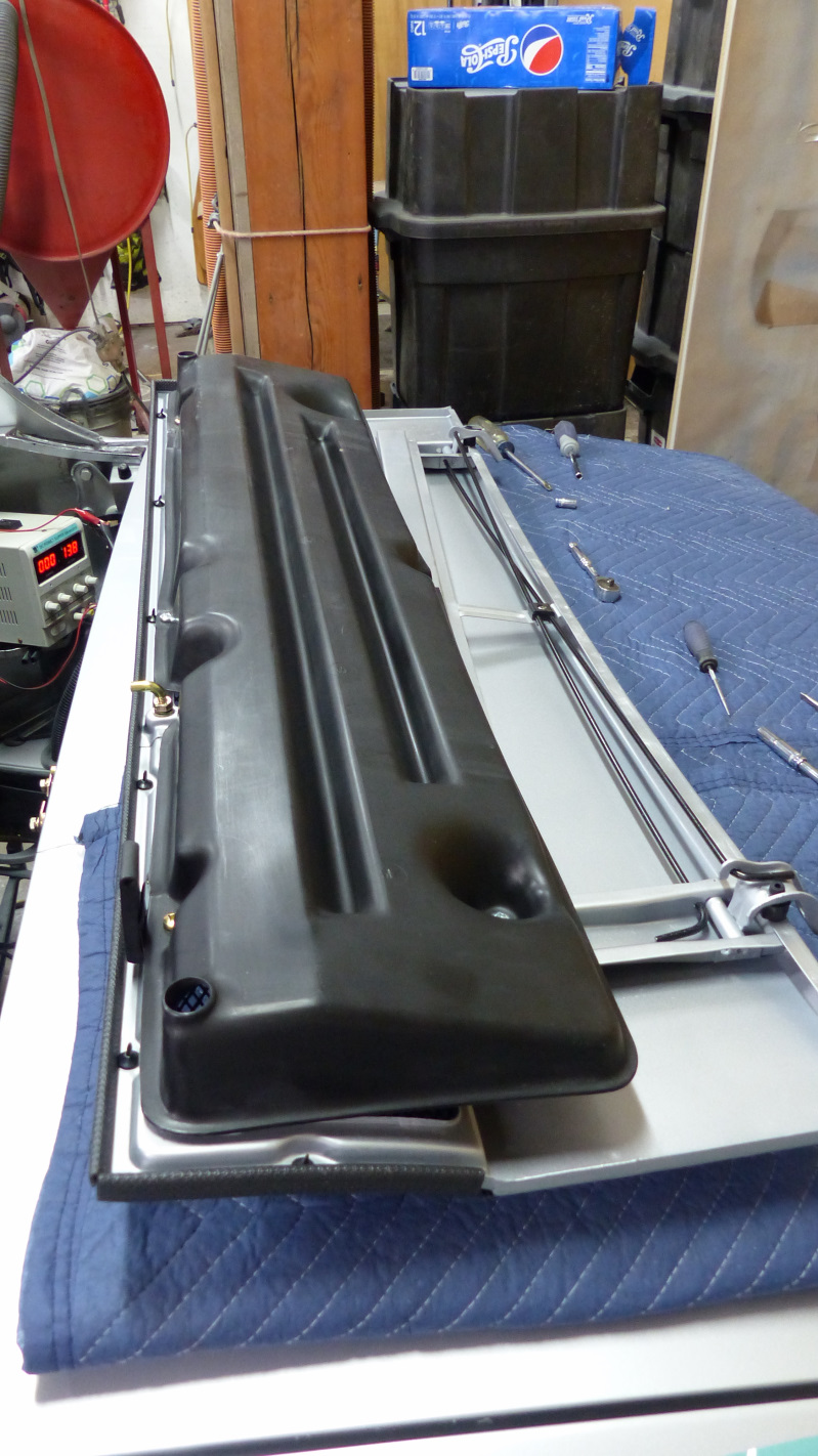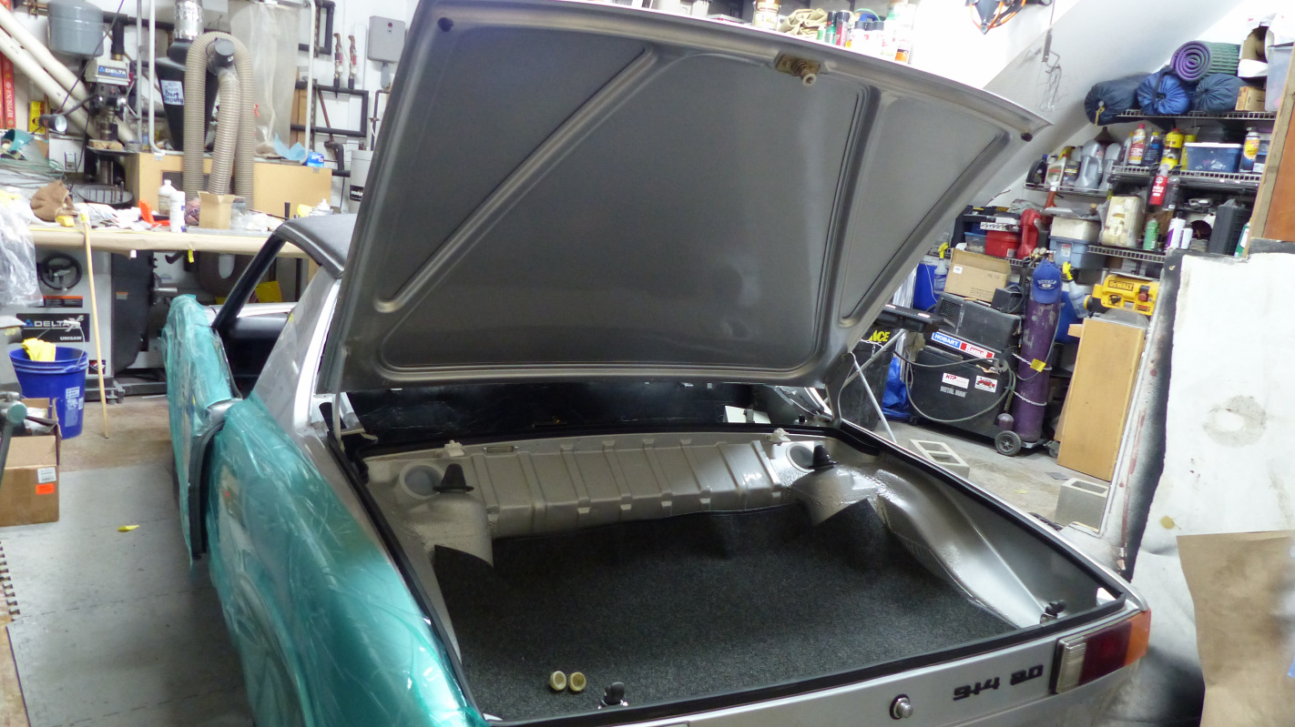 I had to get a little creative to push on the nuts that were hard to access because of the bracing. Here's the assembled lid from the bottom sans rain tray. This little bushing is the reason my rain tray was cracked. It was missing and is a spacer that prevents over tightening and stressing the tray. The part is NLA but I picked up a 5mm deep with 6mm hole black nylon bushing at the local Ace Hardware that fits perfectly. And the rain tray installed. Anyone know the point of the L-shaped bumper on the rear? I figured it could be adjust to catch on the front edge of the trunk lid when the lid was release to prevent it slamming up and stressing the hinges. But there is no way to adjust it out far enough to do that. Lid installed. That doesn't look too bad. Only thing I don't like is that the 914Rubber edge welting is deeper than the original so the top edges show when the lid is closed. I might see how well my originals clean up and switch back if they pass inspection. |