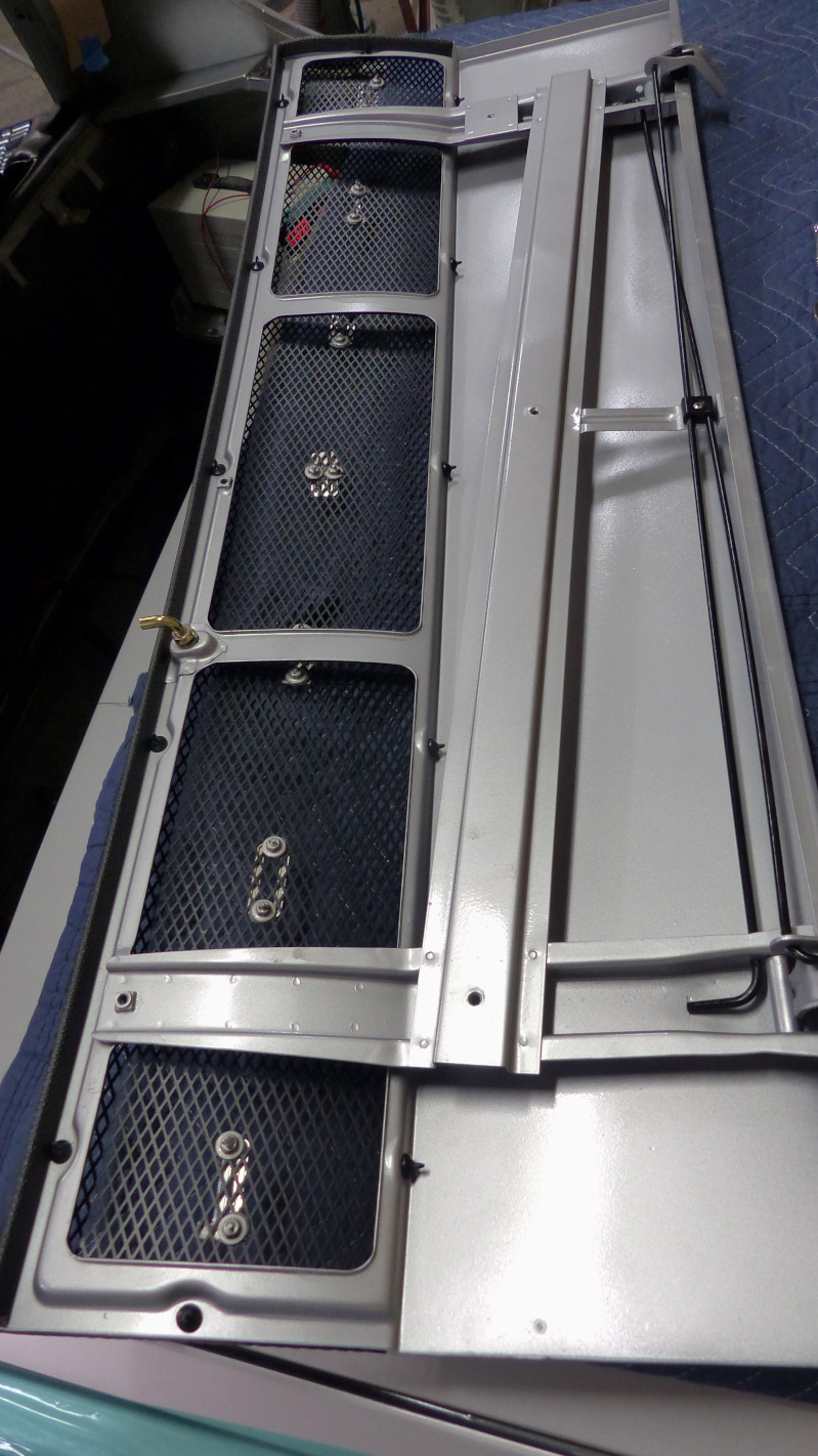 Next up was assembling the engine lid. I found this task pretty fun as it's a pretty complicated piece. The rain tray was in great shape except some overspray from the old paint job and on crack at a rear mount point.