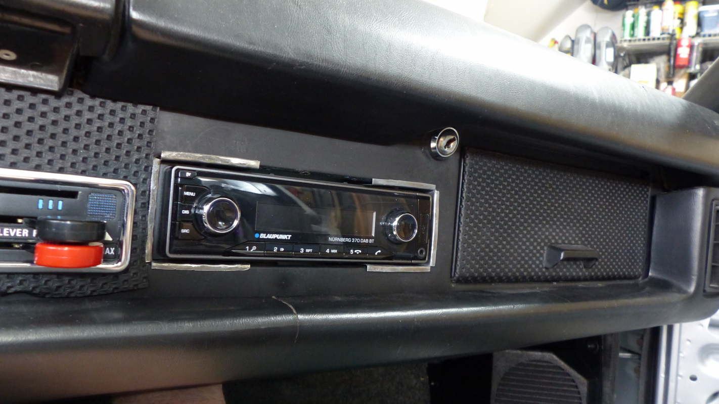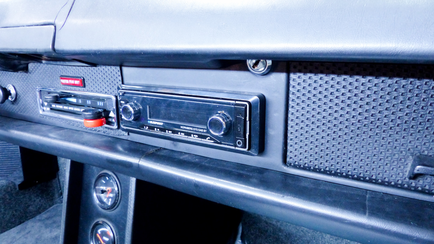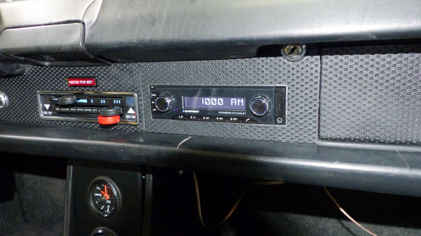 As usual I've been juggling several projects on the car with plenty of progress but few at an interesting stage to share - except one. It was time to add some tunes to this tub. I spent a LOT of time trying to figure out a head unit that suited me. For months I had a search alert for vintage Blaupunkt and Becker radios to see if I could snag a bargain. No luck. As everyone knows, those radios have become quite spendy and in the end, I simply couldn't justify if for 1970s electronics and, at best, a clunky interface for incorporating bluetooth and digital streaming capabilities. Next up was looking at the retro style modern radios. The best seem to be from Woody's Custom Radio. Still, they are not cheap and specifics on what you are getting are kind of vague. So what about a modern head unit? Well - they are almost all ugly as shit. The look like the spawn of hip hop and disco on crack. Things were looking bleak. What about the Blue Dot? I'm not sure how many know that Blaupunkt really no longer exists. It is now owned by an investment conglomerate that simply licenses use of the name and logo. Still, I was curious so checked out their offerings. Nope, I found some of the most hideous looking POS radios yet. Then somehow I discovered the "International" region website for Blaupunkt and finally found head units with much more subdued styling and a bonus of the blue dot logo that looks at home in our cars. They are still made in China radios but I found one that had the features I wanted and styling that didn't make me want to hurl. It isn't going to pass as period correct by any stretch, but it looked like it would fit into the interior without being a glaring eyesore. (IMG:http://www.914world.com/bbs2/uploads_offsite/www.blaupunkt.com-20845-1581109456.1.jpg) I'm not crazy about the blue ring lights on the knobs when the power it on, but otherwise like the style. I didn't, however, like the stock mounting which leaves the nose sticking too far out of the dash with a bulbous plastic bezel. Something had to be done about that so I fabricated a pair of custom brackets that nestle the unit deeper into the dash. I don't have good tools for cutting clean slots in sheet metal so they look pretty amateur, but nobody will see that when installed. I planned to screw the brackets to the chassis but they snap so tightly onto some lugs I decided they weren't needed. Mission accomplished. With the unit mounted just a few mm proud of the dash face, it blends in much better. Next, I built a wire harness to hook it up. I bundled the unused wires near the radio plug outside the main harness so I can access them later if needed. The power antenna wire in that bundle will be tapped for an amplifier turn on wire but I'll wait until I'm certain where the amp will be mounted before adding that. Staying true to the factory radio harnesses, I used AMP dual gender spade connectors so I can plug this harness into appropriate switch terminals on the dash, and plug the original switch wires into the male piggy back spades. Works pretty slick. Finally, I fabricated a custom dash plate using my original as a template. I still had a scrap of the original trunk lid left which is the unobtainable exact gauge as the dash plates. I sure was jealous of @tygaboy 's plasma table while cutting this. I had to do it the hard way with snips, a jig saw, and files. Here's the original plate in the middle, with new plate below and all that remains of the original trunk lid above. Covered in basket weave and installed, I don't think it is too bad. I have one more detail I'll probably add and will update on that later. |