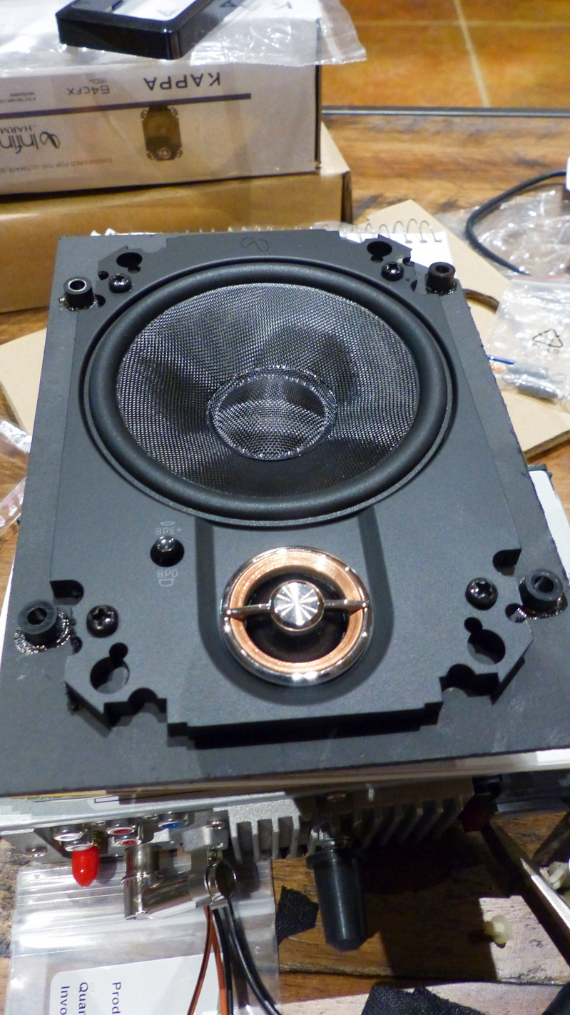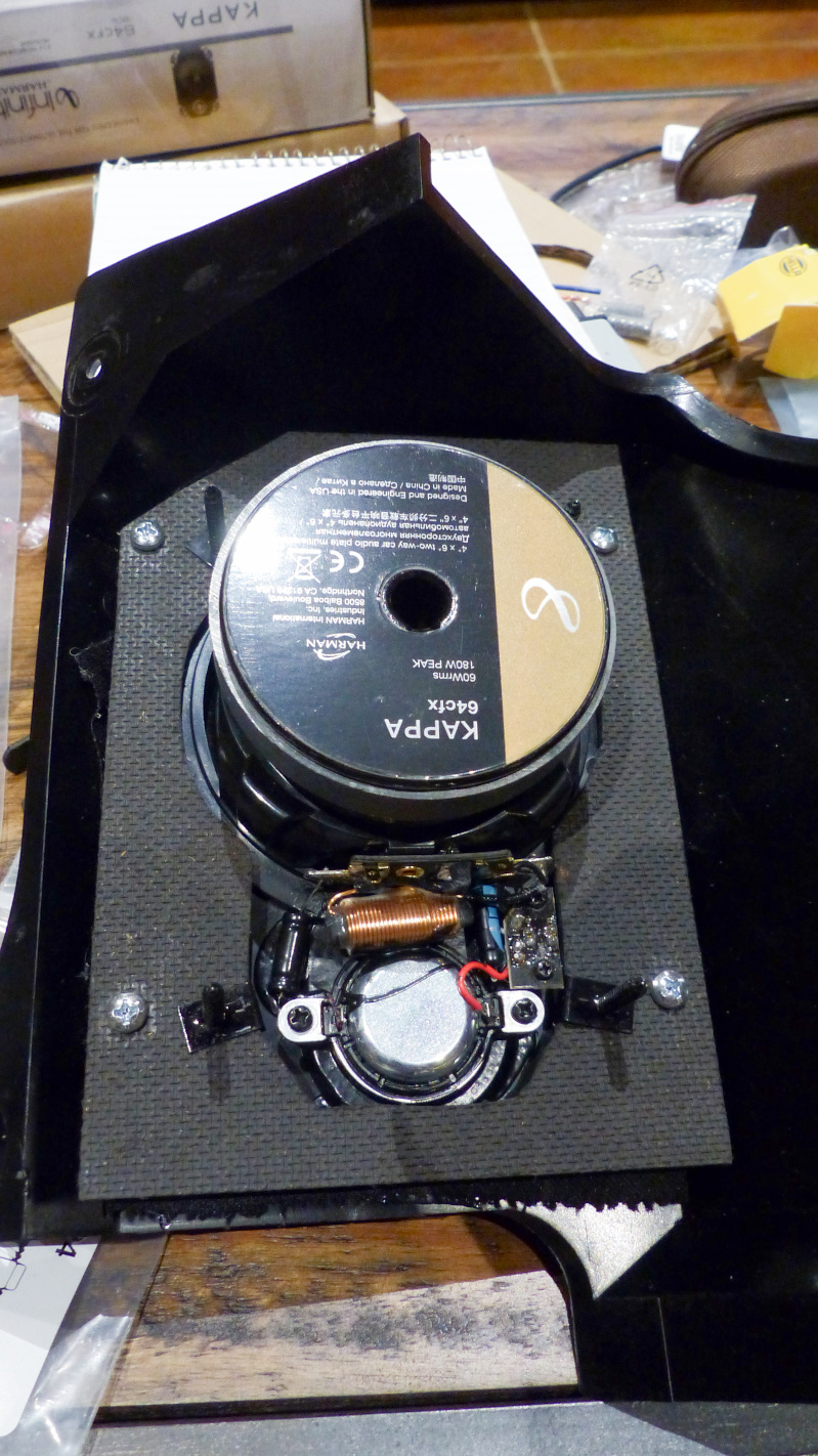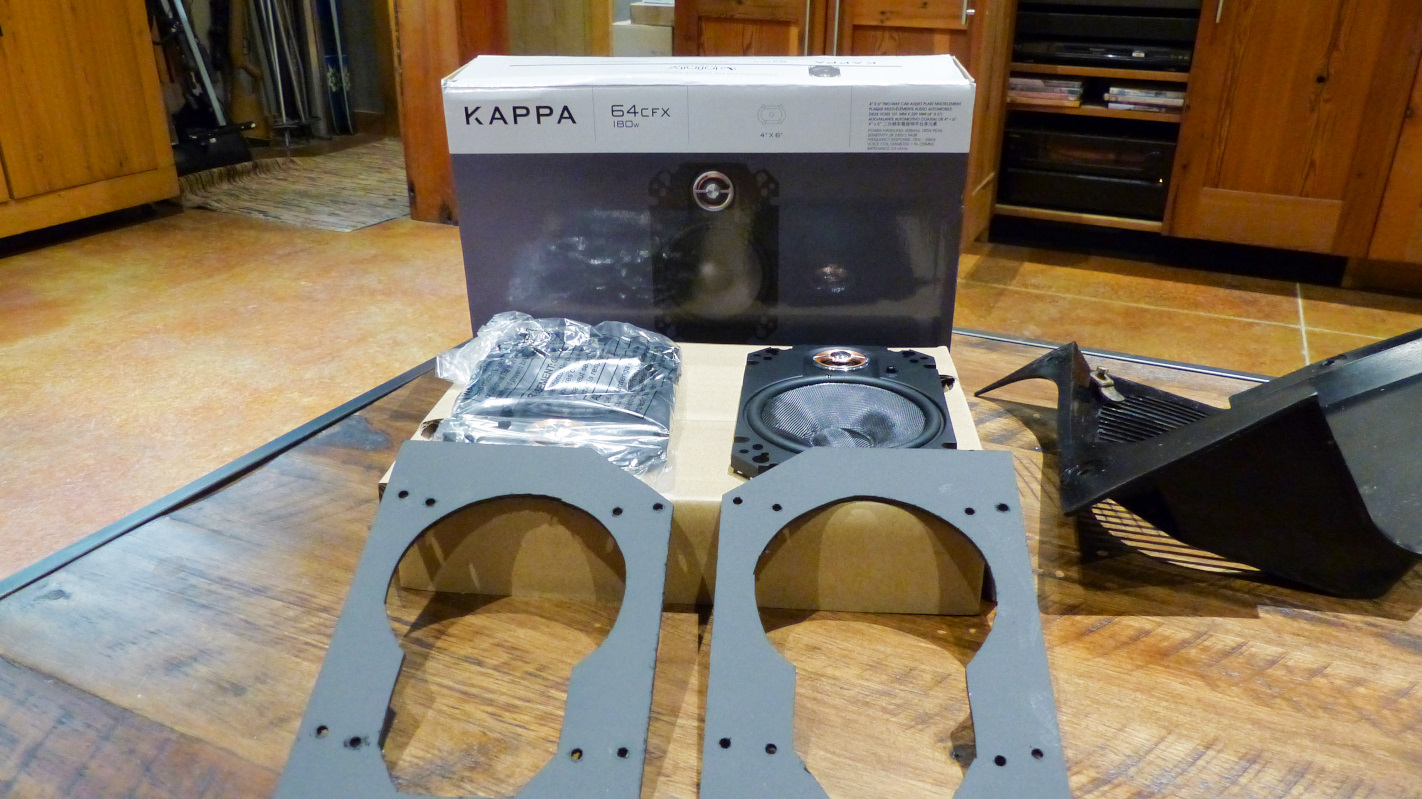 Of course, the radio needs some place to send its signal so I bought a pair of 4x6 Infinity Kappa speakers and cut adapter plates out of some scrap hardboard I had on hand.