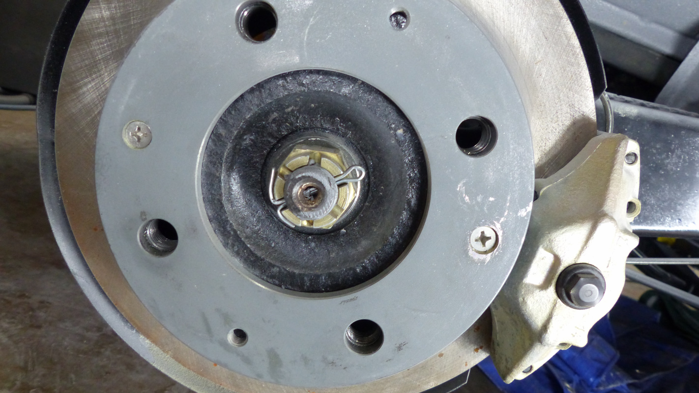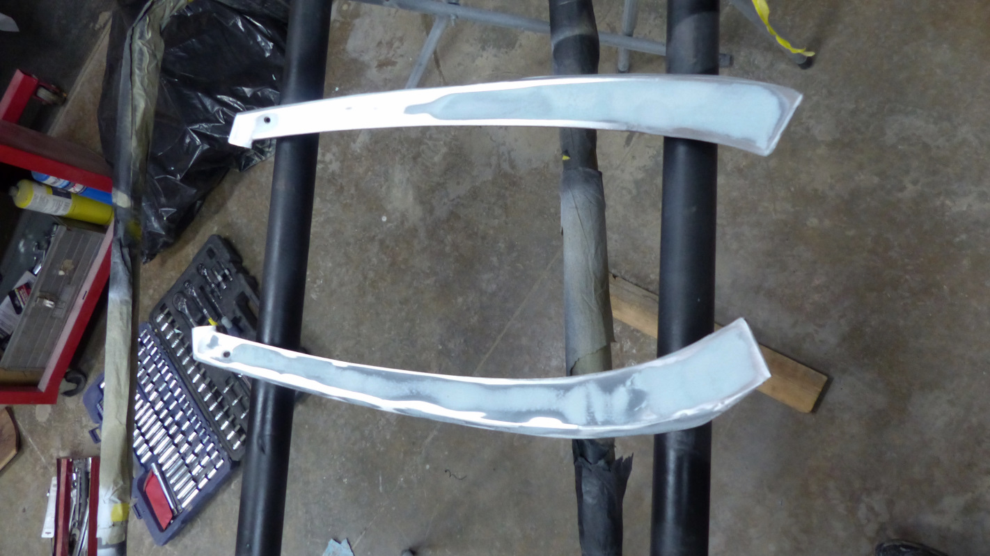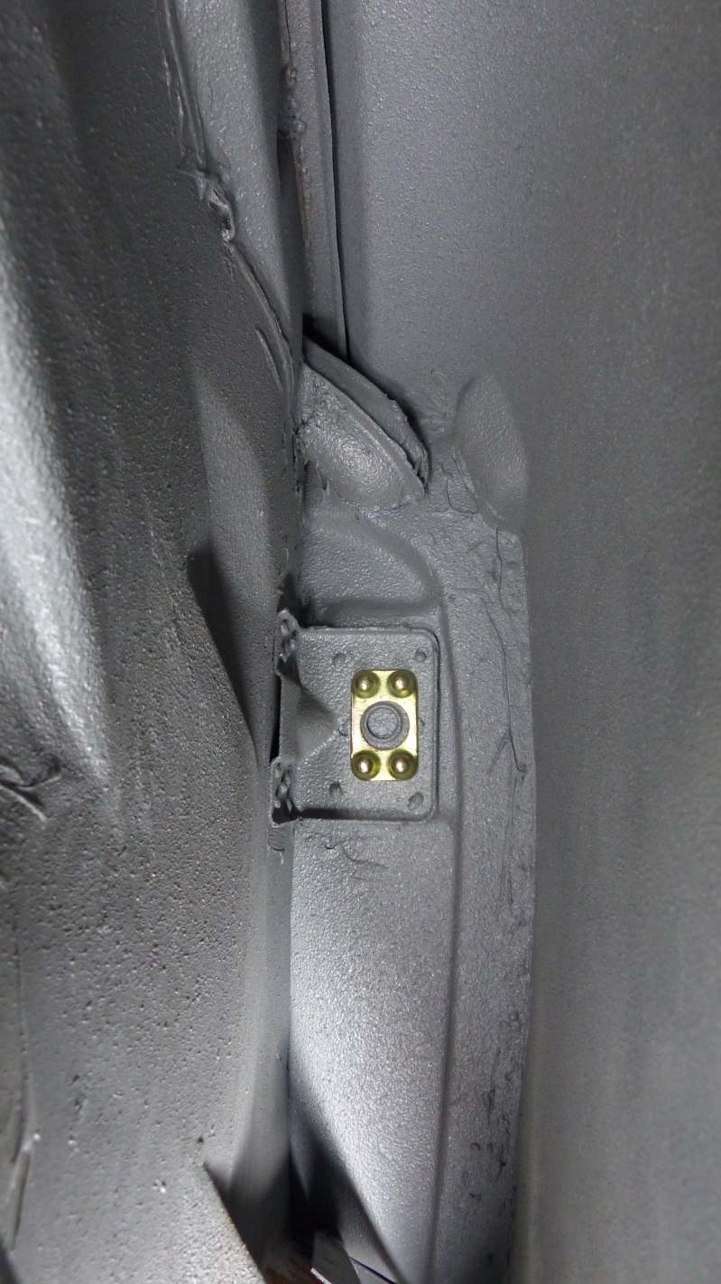 One nice thing about having black targa trim is that it opens more options for restoring. One of these had the ubiquitous hole drilled in the base to replace the special mounting plate with a screw. I had just enough of the fiber reinforced filler to patch these up and a little glazing compound to smooth things over. Mounting these things is no treat. That little 5mm stud for the base bracket is WAY up there in the fender. While I was in there, I had to admire the jewel-like look of the door striker mounting plate from inside the fender. A shame nobody will see it and it will never look like this again. While the wheel was off, I installed the cotters in the axle castle nuts. After a LOT of cussing, I figure out the best way to go at it is to put the bracket on without the trim and just get that little bastard of a nut started so the bracket is loose. Then slide the trim carefully onto the bracket. It isn't without risk though. For some reason the edge of the driver's side trim where the bracket slides in was thin as foil and tore open. (IMG:style_emoticons/default/headbang.gif) That required a bit of in situ repair. Again, I couldn't get away with this with bright work. And an overview of this masterpiece. |
