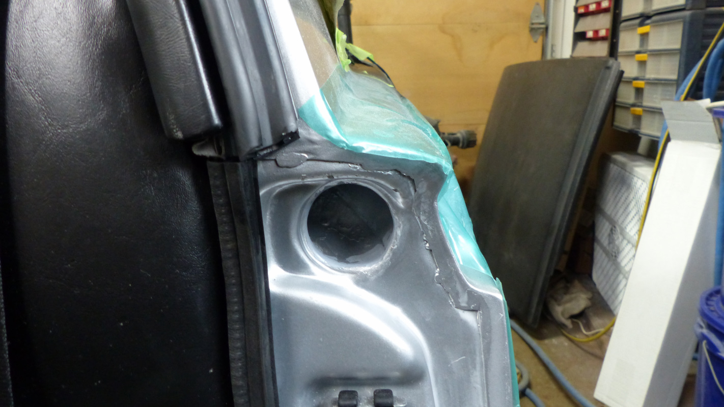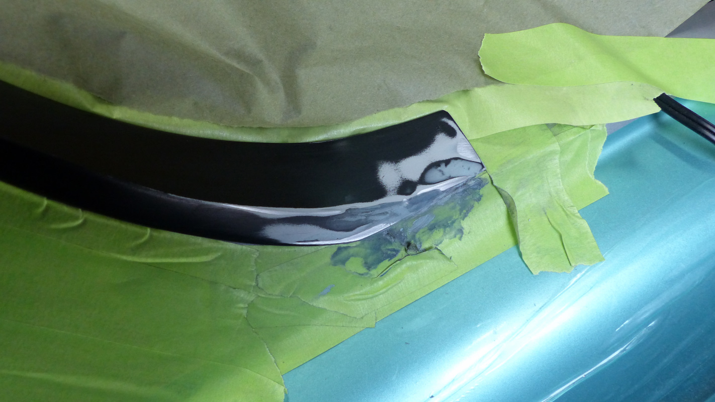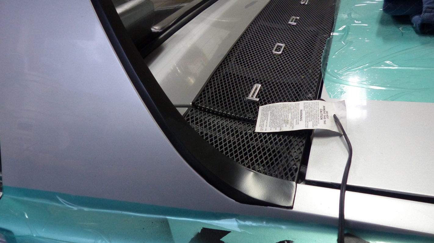 I went through the same drill as before but less of it. Luckily, the inside of the glass was pretty clean so it just got polished and not ground. I also discovered that after grinding with the fine discs, I could go straight to polishing with cerillic oxide and skip the two grades of Chemical Guys polish. Here's a shot showing the difference between medium and fine grind. Cussed the hell out of installing the quarter glass and window again. I'm glad that PITA job is done! Look closely. You are looking through the freshly ground and polished window (IMG:style_emoticons/default/shades.gif) Proof there is a window there. BTW, it took about eight hours for each side to adjust those windows, but they mate with the seals PERFECT. Couldn't be happier about that because I hate leaks and wind whistle. Here's another little item. I mentioned earlier that I'd say more about the fresh air outlet vents in the doors. Lesson learned the HARD way. When you install the RD door jambs, you REALLY need to fit those vent covers BEFORE painting the car. I discovered the lips needed to be hammered back to adjust the opening so the plastic vents would fit. There was not way to do that without damaging the paint. Here's the worst of them. At this point I have coated most of the damage with epoxy primer but remembered to grab the camera to show the chip flaked off that extends beyond the vent cover. I used a touch-up brush to dab on some base coat over the primer, followed by clear. Then the cover pops on. Sure, you can still see it if you look for it, but it won't be noticeable, and if anybody does, I'm going to call them a dick. |