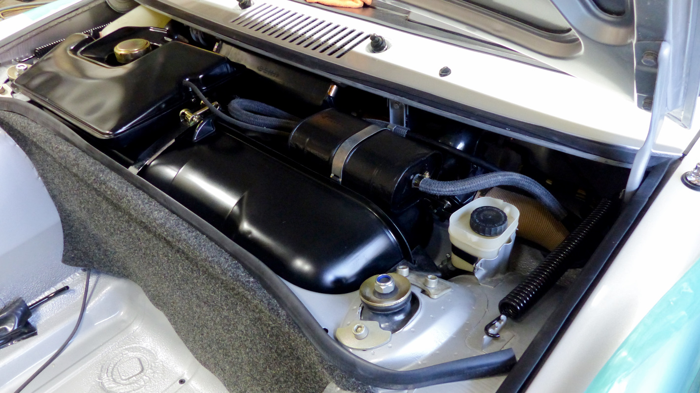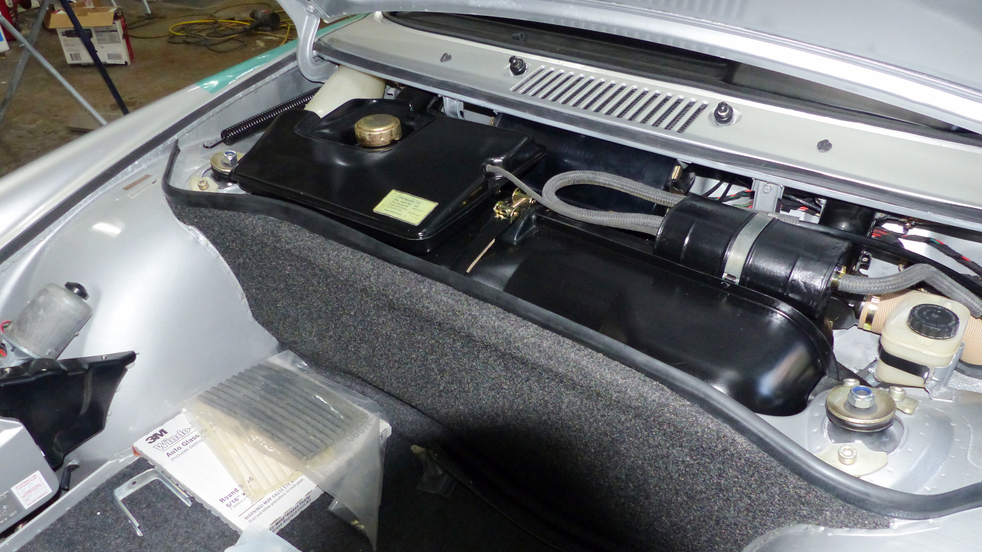 Been working on the fuel tank. I posted this before, but my tank was shocking clean inside. I just gave it a short treatment with muriatic acid and then flushed it with a bit of gasoline to get any loose scale out. While we're looking at this, let's review why I don't think we should be so quick to dump the fuel return when converting to carbs. Notice that the supply drains from the center of the bowl inside the tank and the return refills the bowl.That means as the tank empties, the system continuously scavenges fuel from the tank and concentrates it in the reserve fuel bowl. That's how the system is able to use all the gas. Without the return, the supply would start sucking air before the tank is really empty. Something to think about... I didn't take any pics of the tank prep. I wound up media blasting everything to bare metal and painting with VHT epoxy paint. Installin this thing was a much bigger PITA than I expected. Tip: make sure to turn the wire hose clamps on the fresh air box to the side and tape the tank straps. Neglecting to do so will get you nice scratches down the backside of your freshly repainted tank. Ask me how I know. (IMG:style_emoticons/default/headbang.gif) I know the felt pads under the tank are controversial but I don't like the idea of neoprene because I think it would trap moisture against the tank even worse than felt. So I had an idea. I don't know if this is a good idea or bad but I soaked the pads with fluid film anti-corrosion spray. It is just lanolin like what is in wool so I can't see that it will do any harm. Maybe a little extra protection where the tank rests on the pads. Another tip: Don't be a dumbass like me. Install the filler and expansion tank before putting the tank in. Giant PITA to install them afterward. I thought I'd spend an hour today putting the tank in and take the rest of the day off working on the car. Nope. Anyway, I finally got the bastard in. One last thing, @Superhawk996 and @914_7T3 very generously pitched in and bought me a set of decals for the car from Carbone. This included an expansion tank sticker. Actually two because their first attempt was quite far off the mark and Jeffrey had them try again. I don't want to look a gift horse in the mouth, but neither version is very close to the original. So I have three choices, the original sticker (lower right) which is showing its age but factory correct, or one of the two replicas that look new, but are not correct. Curious what you all would do? |