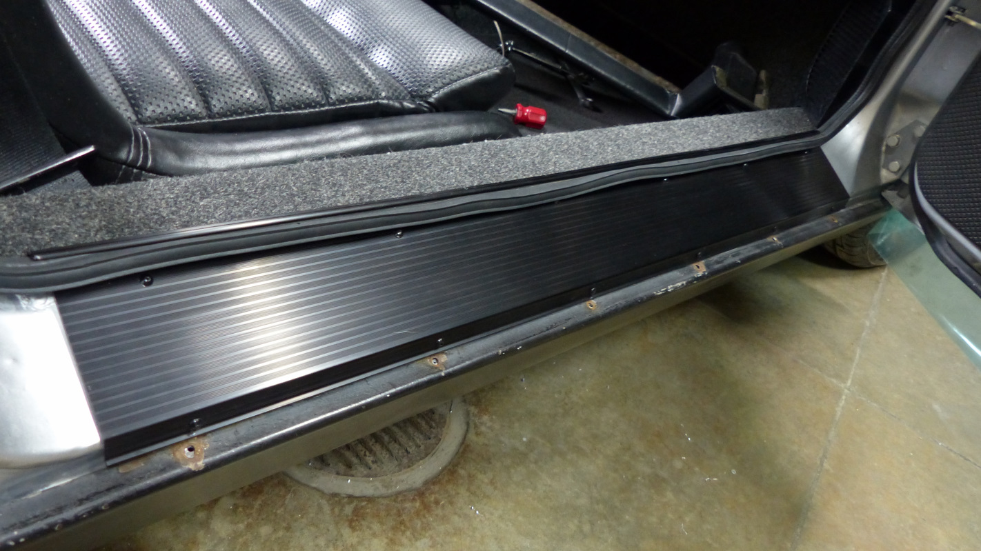Temporary attachment after all holes drilled. Then I got to drill out the pop rivets, dab the fresh holes with epoxy primer to seal them and install the plates with the correct plastic rivet fasteners. I'm skeptical those plastic fasteners will hold up over time but we'll see. If they start falling out, I'll replace with black aluminum pop rivets. Please ignore the ratty rocker covers. I'm also just now noticing the warble in the door seal. Will fix that pronto. These 914Rubber plates are really nice repros and a nice upgrade to the warped plastic originals. I've noticed a couple small scuff marks on the weatherstrip trim strip just from getting in an out of the car so wondering about how thick the anodized coating it. Time will tell. |