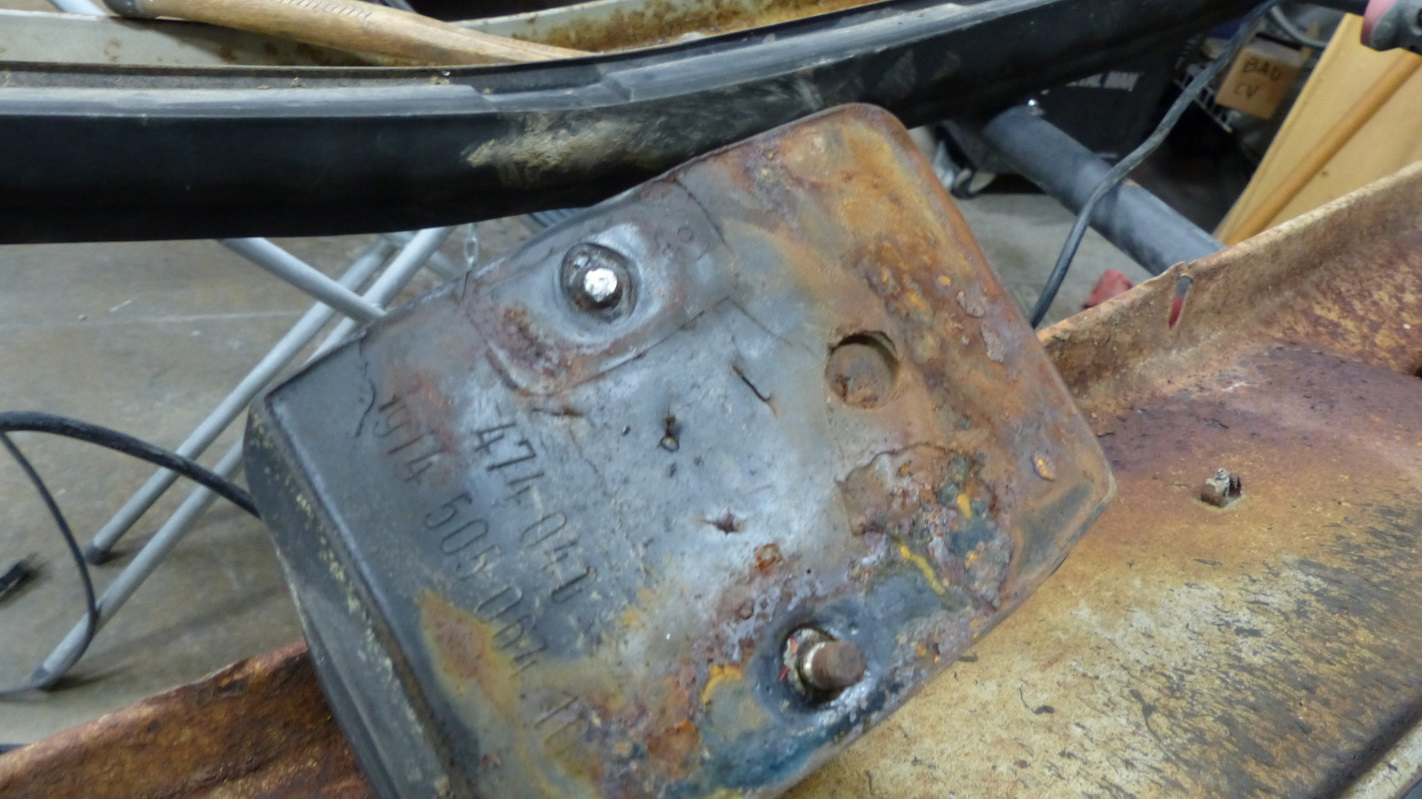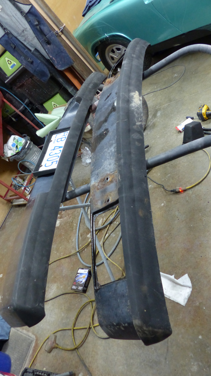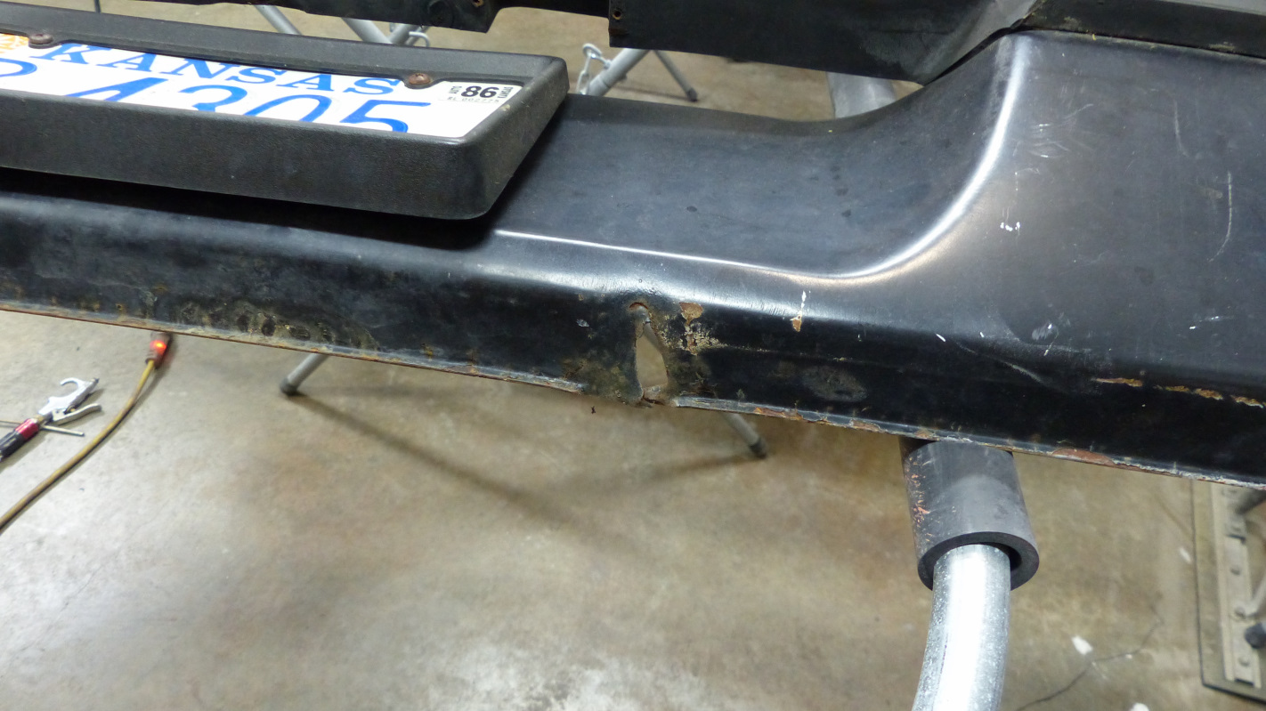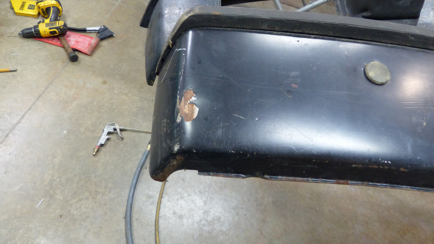 I know some of you don't like the bumper tits on 73/74 cars but I think a nice set looks good on a lady. Besides, how else are aficionados to know I'm driving a a coveted model year? I pulled my bumpers out of the storage shed to start the resurrection. I knew those tits were going to fight me so three nights in a row I've soaked them down with penetrating oil and let them soak. Tonight I hit them with an impact wrench to try to break them loose quick without twisting anything off. Three nuts spun off like charms, but there's always that one little fucher. I'm not sure when the tits got used as a parking brake. Probably sometime in transit hauling this tub across the country. The broken tit is also mushed in. Anyone have suggestions on getting that boob to to pop back out? Figure I should see if it can be salvaged before even thinking about fixing the broken stud. Might as well show the general condition of the bumpers while I'm here. The rear is in pretty good shape. The front bumper looks like it's been to battle from the aforementioned parking brake service. Mostly pushed in at the tits but several other dents and dings to fix. Just a couple things to fix on the rear. A mystery tear under the lower edge (crowbar?). and a ding in the corner. I've never tried to straighten a bumper before so not sure what I'm up against. Check out this vintage tag documenting the last time this crate was on the road. The bumper tops look salvageable. The rear just needs a clean and probably paint. The front looks like a pecker that's been slammed in a car door. I think that's because the bumper is bent so hoping it will straighten out. There is also a tear that was there when I got the car. I have a link bookmarked to an awesome repair a member did so I'll be digging that up. So that's a preview of what's ahead. |