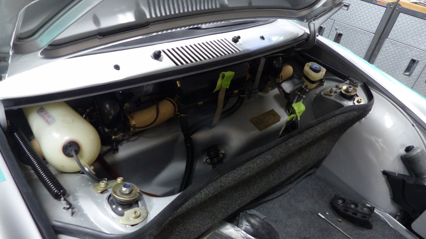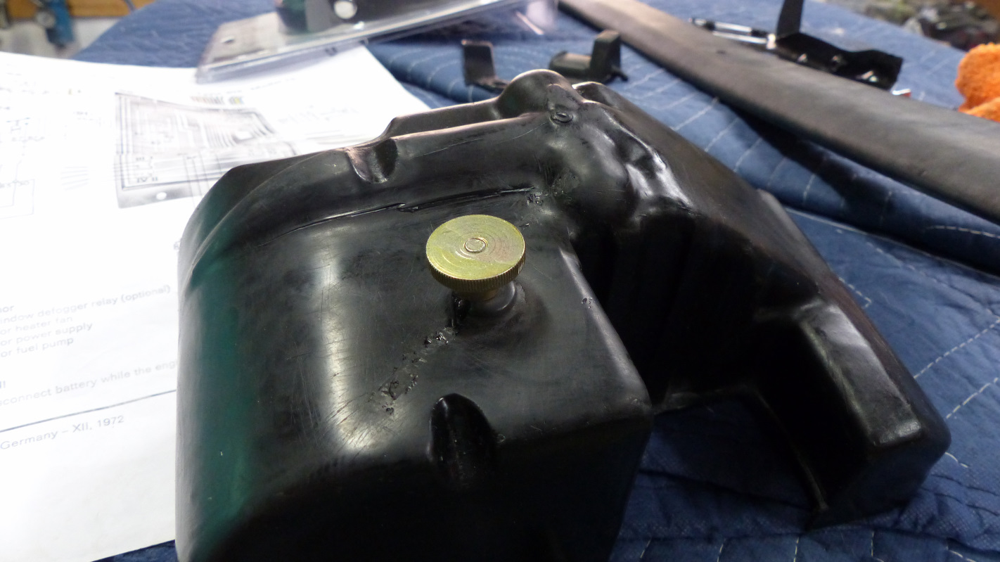 It's a Gas Been working on the fuel tank. I posted this before, but my tank was shocking clean inside. I just gave it a short treatment with muriatic acid and then flushed it with a bit of gasoline to get any loose scale out. While we're looking at this, let's review why I don't think we should be so quick to dump the fuel return when converting to carbs. Notice that the supply drains from the center of the bowl inside the tank and the return refills the bowl.That means as the tank empties, the system continuously scavenges fuel from the tank and concentrates it in the reserve fuel bowl. That's how the system is able to use all the gas. Without the return, the supply would start sucking air before the tank is really empty. Something to think about... I didn't take any pics of the tank prep. I wound up media blasting everything to bare metal and painting with VHT epoxy paint. Installin this thing was a much bigger PITA than I expected. Tip: make sure to turn the wire hose clamps on the fresh air box to the side and tape the tank straps. Neglecting to do so will get you nice scratches down the backside of your freshly repainted tank. Ask me how I know. (IMG:style_emoticons/default/headbang.gif) I know the felt pads under the tank are controversial but I don't like the idea of neoprene because I think it would trap moisture against the tank even worse than felt. So I had an idea. I don't know if this is a good idea or bad but I soaked the pads with fluid film anti-corrosion spray. It is just lanolin like what is in wool so I can't see that it will do any harm. Maybe a little extra protection where the tank rests on the pads. Another tip: Don't be a dumbass like me. Install the filler and expansion tank before putting the tank in. Giant PITA to install them afterward. I thought I'd spend an hour today putting the tank in and take the rest of the day off working on the car. Nope. Anyway, I finally got the bastard in. One last thing, @Superhawk996 and @914_7T3 very generously pitched in and bought me a set of decals for the car from Carbone. This included an expansion tank sticker. Actually two because their first attempt was quite far off the mark and Jeffrey had them try again. I don't want to look a gift horse in the mouth, but neither version is very close to the original. So I have three choices, the original sticker (lower right) which is showing its age but factory correct, or one of the two replicas that look new, but are not correct. Curious what you all would do? I had a real problem when I had the tank "professionally" cleaned and recoated. In the process they used the mounts for expansion tank and canister were removed, apparently soldered on as originally made. I also saturated my felt pads with good ol' WD 40, hoping to reduce amount of moisture retention and abrasion. |
