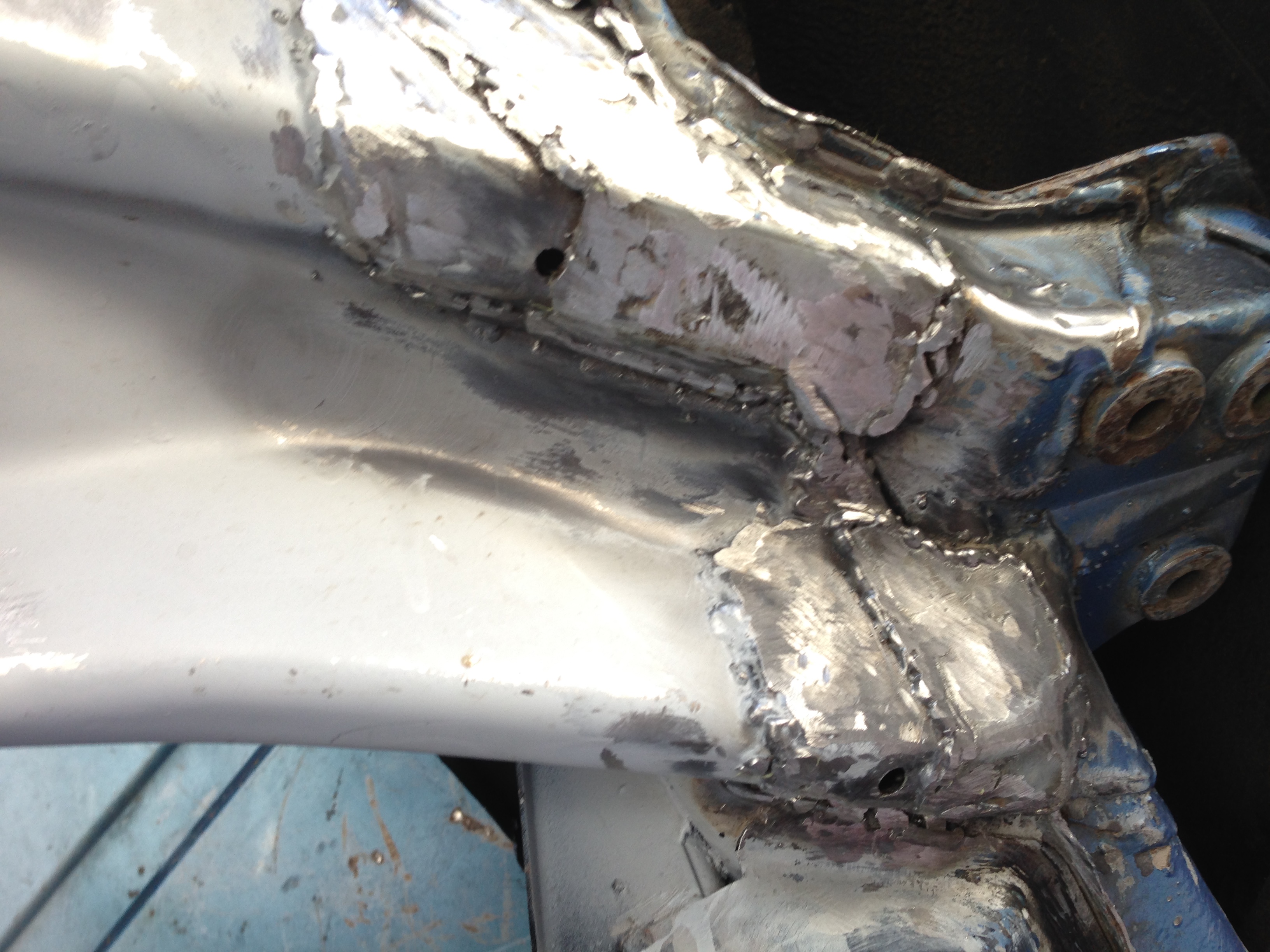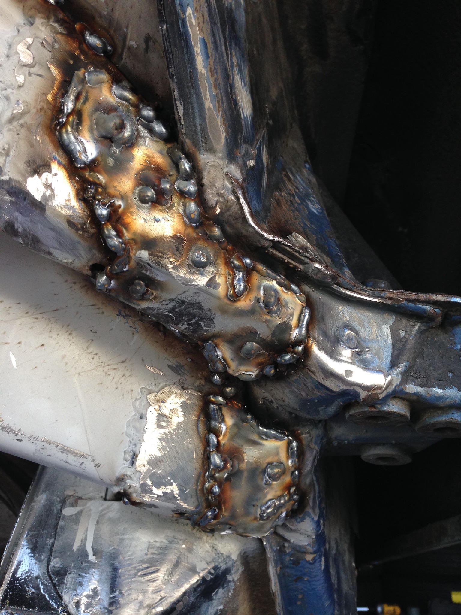 Had a very satisfying weekend working on the car. First up was some house keeping in the engine bay. I reworked the butt weld for the RD inner wheel well patch to make sure there was complete weld penetration along that seam, and fill any pinholes. I also replaced a couple hold down straps that had seen better days. ![]() I also smashed a piece of copper pipe flat to use as a welding backer so I could clean up the edge of the passenger side engine lid brace that looked like a shark had taken a bite out of it thanks to some clumsy use of a 7" grinder when a younger me hacked in a new trunk hinge pivot oh so many years ago. ![]() Then it was time to have some fun by installing the new RD engine shelf piece. It took some time to get the piece adjusted for a good fit, but not too bad. Sadly, I forgot to take a pic at this stage, so that will have to wait. Now it was time to prep for the battery tray. You'll be shocked to learn there was metal corrosion on the wall behind the battery tray (IMG:style_emoticons/default/lol-2.gif) So a patch had to go in. The pitting was restricted mostly to the flat area where the battery shelf attaches, but it did extend downward where the wall bends. I decided to clean up the area below the bend the best I could and just zap a couple of the worst pits with the welder. I didn't think the pitting was bad enough to justify the added work of trying to form a new patch to match those curves and risk not getting it right. You can see the outline of the new patch here. ![]() ![]() I welded the patch from the outside. It went well except a little blowout at the bottom where I ran into some of that oxidized metal. I ran out of 40 grit grinding discs which I like to use to knock down the welds before finishing with finer grit, so I'll save grinding of the outside for later. ![]() The inside got cleaned up though to make ready for the batter tray. ![]() ![]() Now the battery will have a solid wall to lean against, but I wasn't ready for the tray yet. I needed to patch in the area behind the trunk pivot while there was good access. You can see the patch laid in in the last pic. And here it is welded in. Again, I'll save grinding until I get more discs. ![]() I was finally ready to install the tray. Time to get really nit picky again. RD's installation video suggests welding the tray to the support before installing in the car. That fine, but I didn't think I'd be able to weld that inward bent weld flange after the tray was on. There it is on the left side of this pic. ![]() An alternative would be to weld in the support, then add the tray. But... yes, I'm picky and I wanted to hide the plug welds under the tray. I wouldn't be able to access the rearward flange from the bottom with the support in place. So I came up with a third option. First, I welded the tray on just at the rearward flange. ![]() See how pretty the top looks? Almost like factory. ![]() Next, I welded the support to the chassis, and now for the hat trick... ![]() I bent back the tray so I could reach in and weld the inner flange. I'll admit this worked more elegantly in my head, but it did work. ![]() Then it was easy enough to plug weld the rest of the tray flanges. ![]() Just a couple tacks to attach the tray to the newly refurbished wall. ![]() And with that... the Hell Hole was now a heavenly place with all the repairs complete! ![]() ![]() And look how pretty those welds on the battery tray are. Well worth the effort since this is the first thing anyone looking at the car will notice. (IMG:style_emoticons/default/av-943.gif) ![]() |