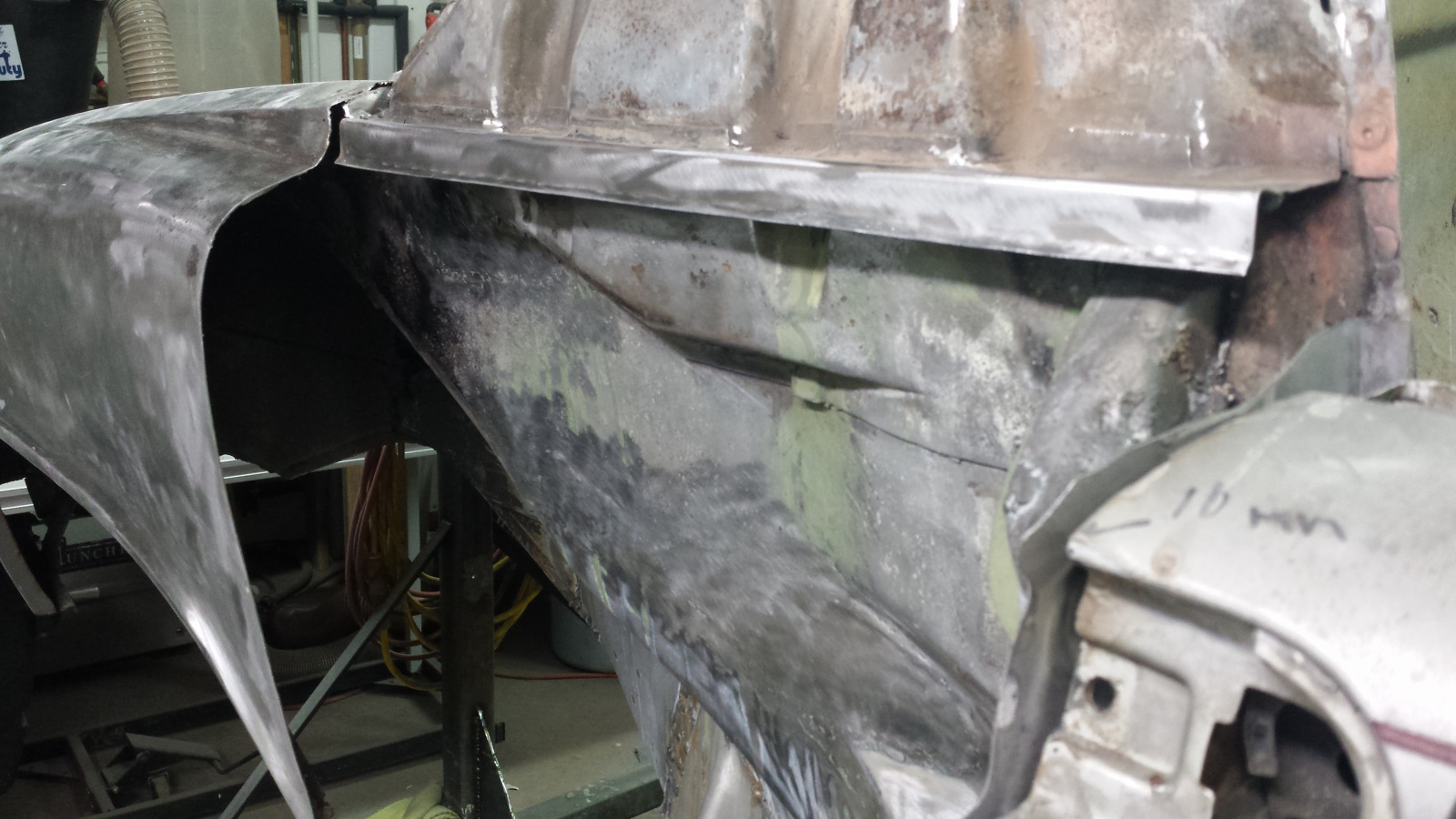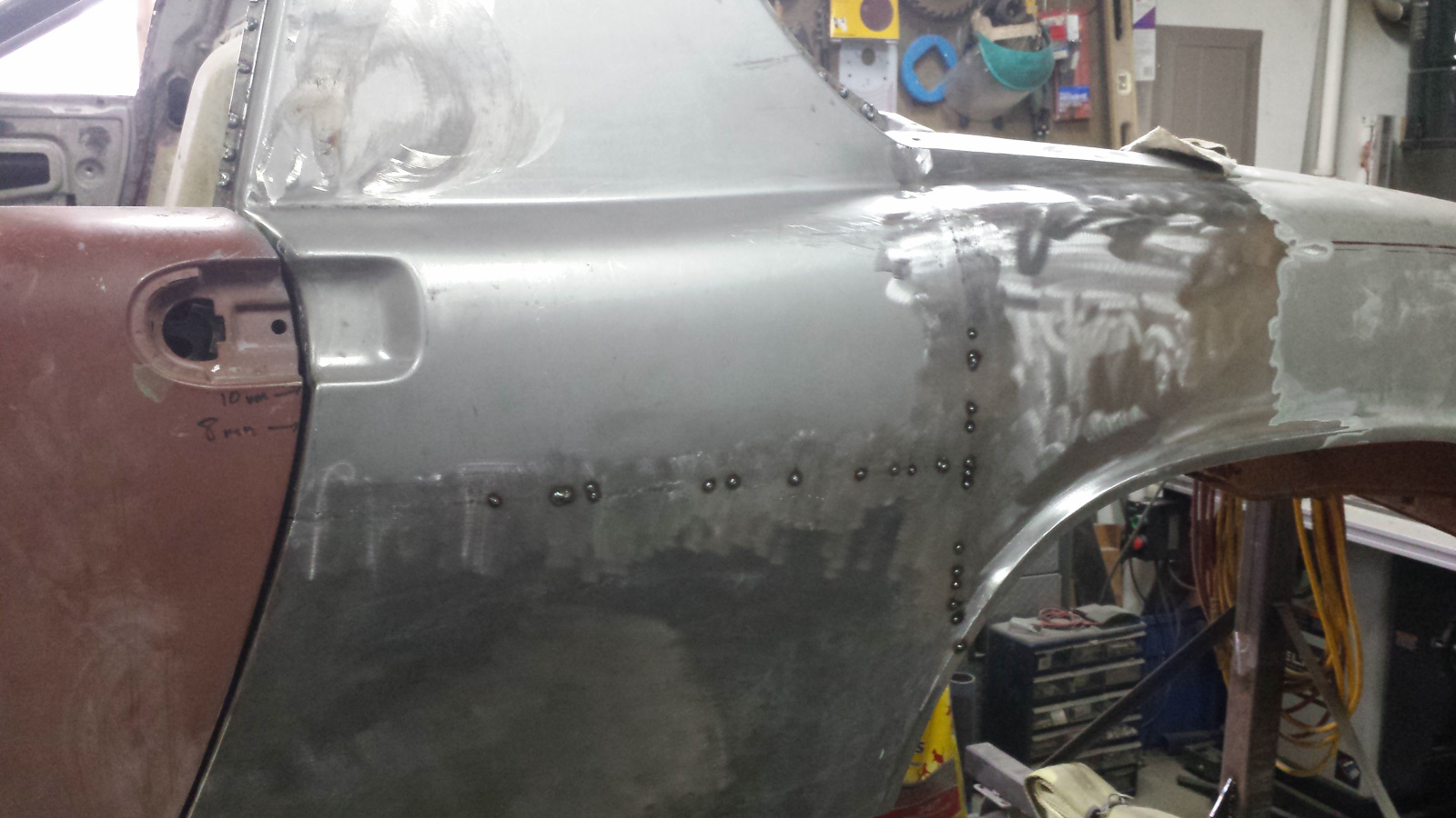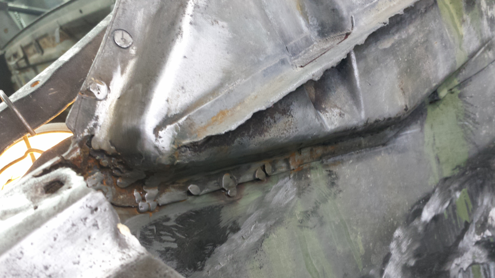 This weekend, Sebastian Cabot has popped into my head a few times. (IMG:style_emoticons/default/WTF.gif) Anyone remember him? Man, that dates back older than my car. (IMG:style_emoticons/default/blink.gif) The butler from family affair? Uh... startin to worry about you brother. It's that time of year here in Montana... cabin fever? or in your case garage fever?!? Go outside and take some deep breaths man, go for a long walk. your not getting your drinking water from the beaver pond are you? (IMG:style_emoticons/default/drunk.gif) I know, right? (IMG:style_emoticons/default/screwy.gif) (IMG:style_emoticons/default/lol-2.gif) I wish I could blame it on flashbacks, but I think I was the only kid in school not dropping acid. And yes, we are talking about the one and only Mr. French. How random is that? Now how about a mid-day update? More on the driver's quarter - knowing when to quit? Started this morning grinding the backsides of the welds in prep for plannishing with hammer and dolly. We never get to see the seamy underbelly of these patches, so here it is before grinding. Notice the plug welds inside the door jamb? Those were a PITA but I did it that way to leave nice, factory looking spots on the front. I think they look good anyway. (IMG:style_emoticons/default/shades.gif) This pic also shows an example of what I meant a few posts back when I said I needed to be careful not to get excited and skip a step. The step I skipped was trimming the weld flange on the RD sail panel to match the factory quarter. Would have been easy before the part was welded in, not it will require some delicate surgery with the Dremel. (IMG:style_emoticons/default/blink.gif) I'll weld that seam between flanges after the surgery. After grinding the backs of the welds and plannishing with hammer and dolly followed by just a touch of grinding with an 80 grit disc, I had the welds 98% invisible (sorry, forgot to snap a pic). Then I needed to fill pin holes. Zapped them with very quick bursts to keep the heat down. But dang if those didn't create a few boogers that don't seem to want to hammer and grind out. When cold hammering didn't work, I tried heating them to dull cherry with a MAP torch and hammering. It sort of worked, but I was stretching metal in areas I didn't want in addition to the booger spots. I don't know if it is because the MAP flame heats a wider area compared with O/A, or maybe I don't know what I'm doing. Anyway, if you run your hand along the seam, it feels like it has been hit by a bunch of golf balls. I think the magic shrinking disc will pull a lot of that out, and more hammer and dolly work will probably finish it up, but there is a good chance I'll need a thin skim of filler over the joints. Still, I'm pretty happy with where I left it. Now back to the shop to work on the passenger's side. |