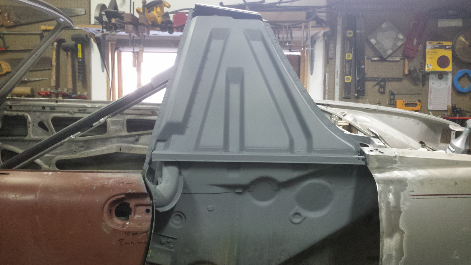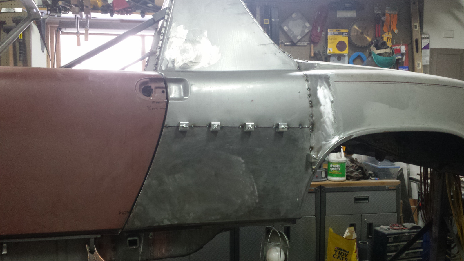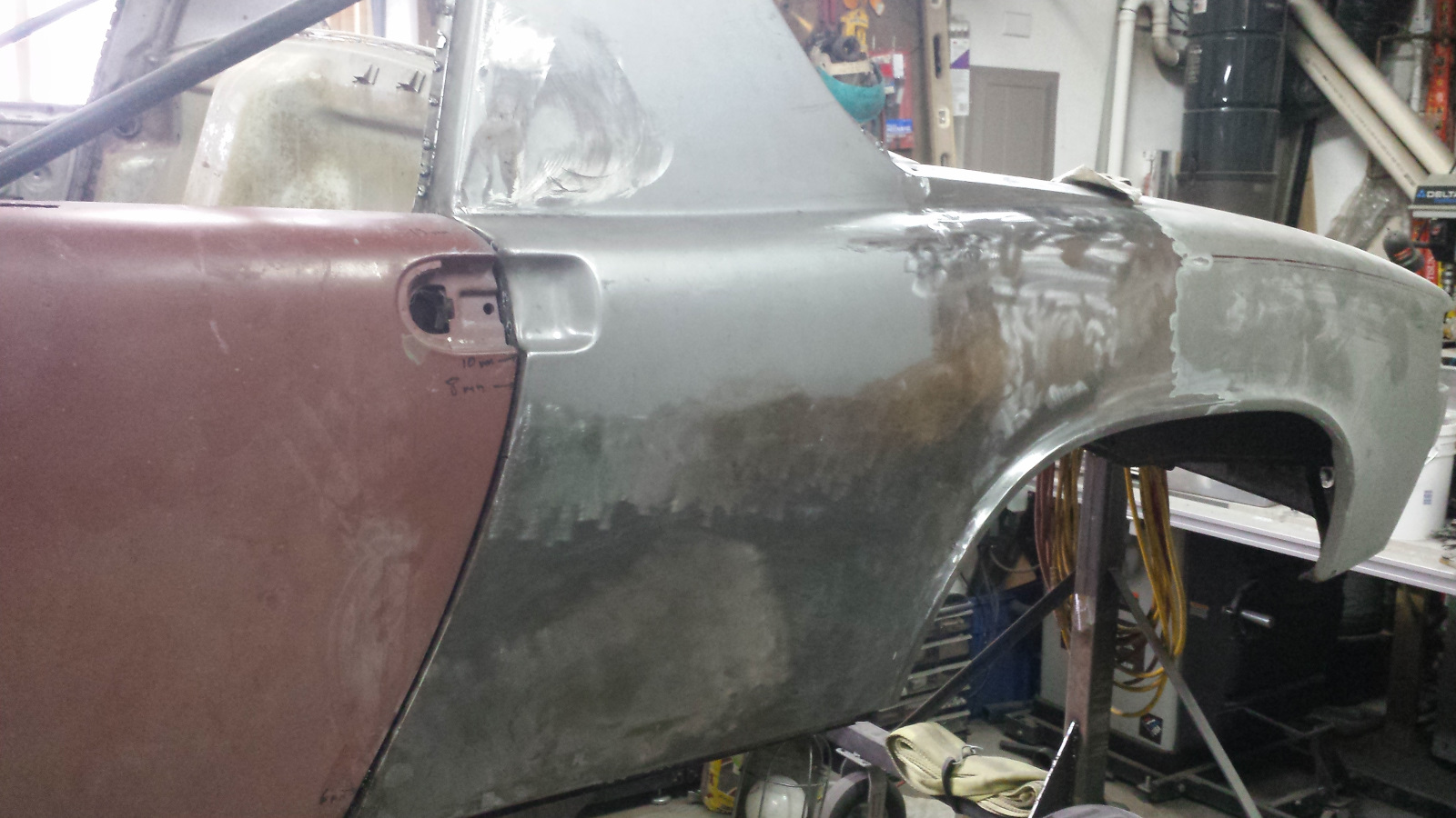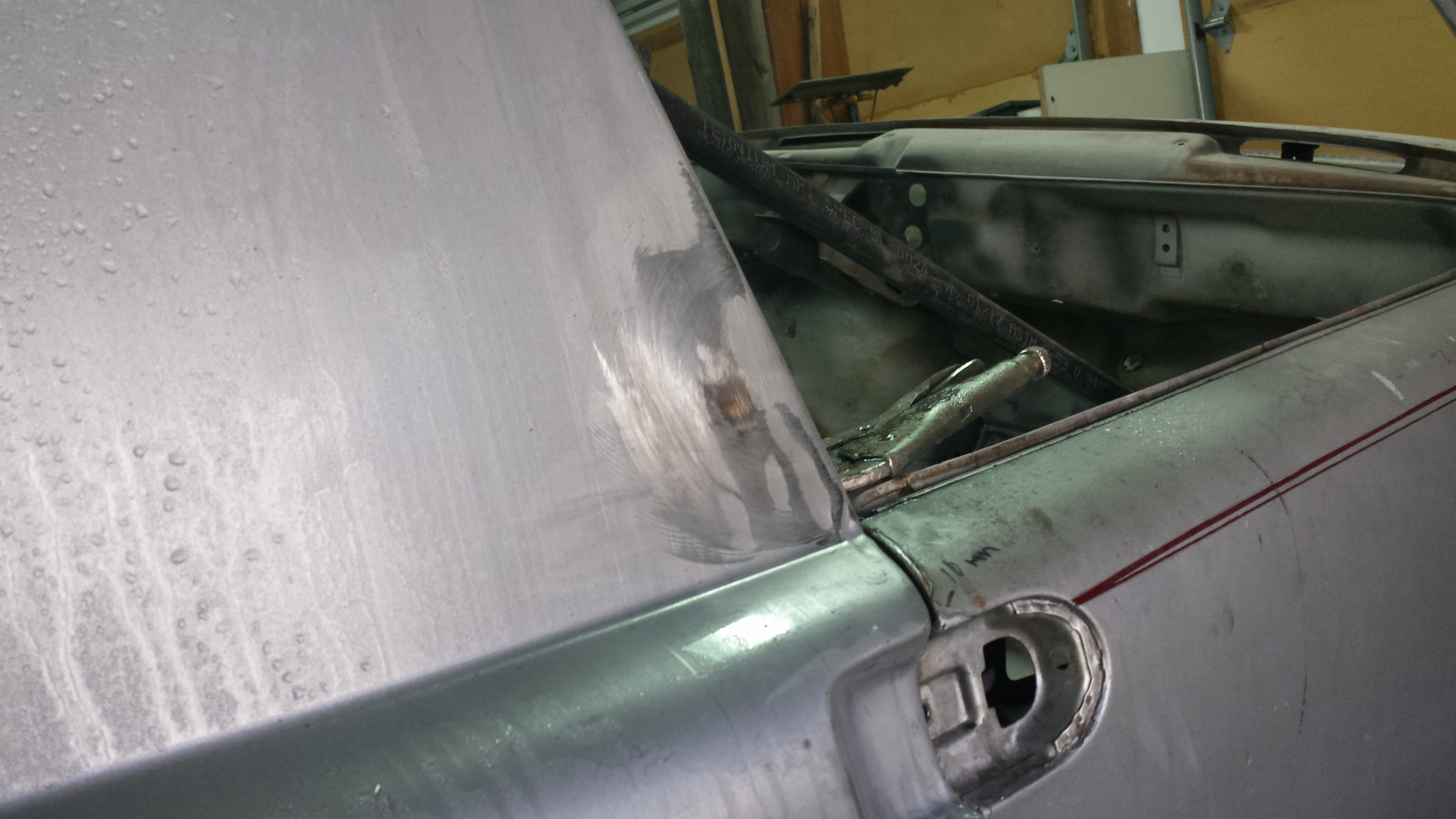 This weekend, Sebastian Cabot has popped into my head a few times. (IMG:style_emoticons/default/WTF.gif) Anyone remember him? Man, that dates back older than my car. (IMG:style_emoticons/default/blink.gif) The butler from family affair? Uh... startin to worry about you brother. It's that time of year here in Montana... cabin fever? or in your case garage fever?!? Go outside and take some deep breaths man, go for a long walk. your not getting your drinking water from the beaver pond are you? (IMG:style_emoticons/default/drunk.gif) I know, right? (IMG:style_emoticons/default/screwy.gif) (IMG:style_emoticons/default/lol-2.gif) I wish I could blame it on flashbacks, but I think I was the only kid in school not dropping acid. And yes, we are talking about the one and only Mr. French. How random is that? Now how about a mid-day update? More on the driver's quarter - knowing when to quit? Started this morning grinding the backsides of the welds in prep for plannishing with hammer and dolly. We never get to see the seamy underbelly of these patches, so here it is before grinding. Notice the plug welds inside the door jamb? Those were a PITA but I did it that way to leave nice, factory looking spots on the front. I think they look good anyway. (IMG:style_emoticons/default/shades.gif) This pic also shows an example of what I meant a few posts back when I said I needed to be careful not to get excited and skip a step. The step I skipped was trimming the weld flange on the RD sail panel to match the factory quarter. Would have been easy before the part was welded in, not it will require some delicate surgery with the Dremel. (IMG:style_emoticons/default/blink.gif) I'll weld that seam between flanges after the surgery. After grinding the backs of the welds and plannishing with hammer and dolly followed by just a touch of grinding with an 80 grit disc, I had the welds 98% invisible (sorry, forgot to snap a pic). Then I needed to fill pin holes. Zapped them with very quick bursts to keep the heat down. But dang if those didn't create a few boogers that don't seem to want to hammer and grind out. When cold hammering didn't work, I tried heating them to dull cherry with a MAP torch and hammering. It sort of worked, but I was stretching metal in areas I didn't want in addition to the booger spots. I don't know if it is because the MAP flame heats a wider area compared with O/A, or maybe I don't know what I'm doing. Anyway, if you run your hand along the seam, it feels like it has been hit by a bunch of golf balls. I think the magic shrinking disc will pull a lot of that out, and more hammer and dolly work will probably finish it up, but there is a good chance I'll need a thin skim of filler over the joints. Still, I'm pretty happy with where I left it. Now back to the shop to work on the passenger's side. |