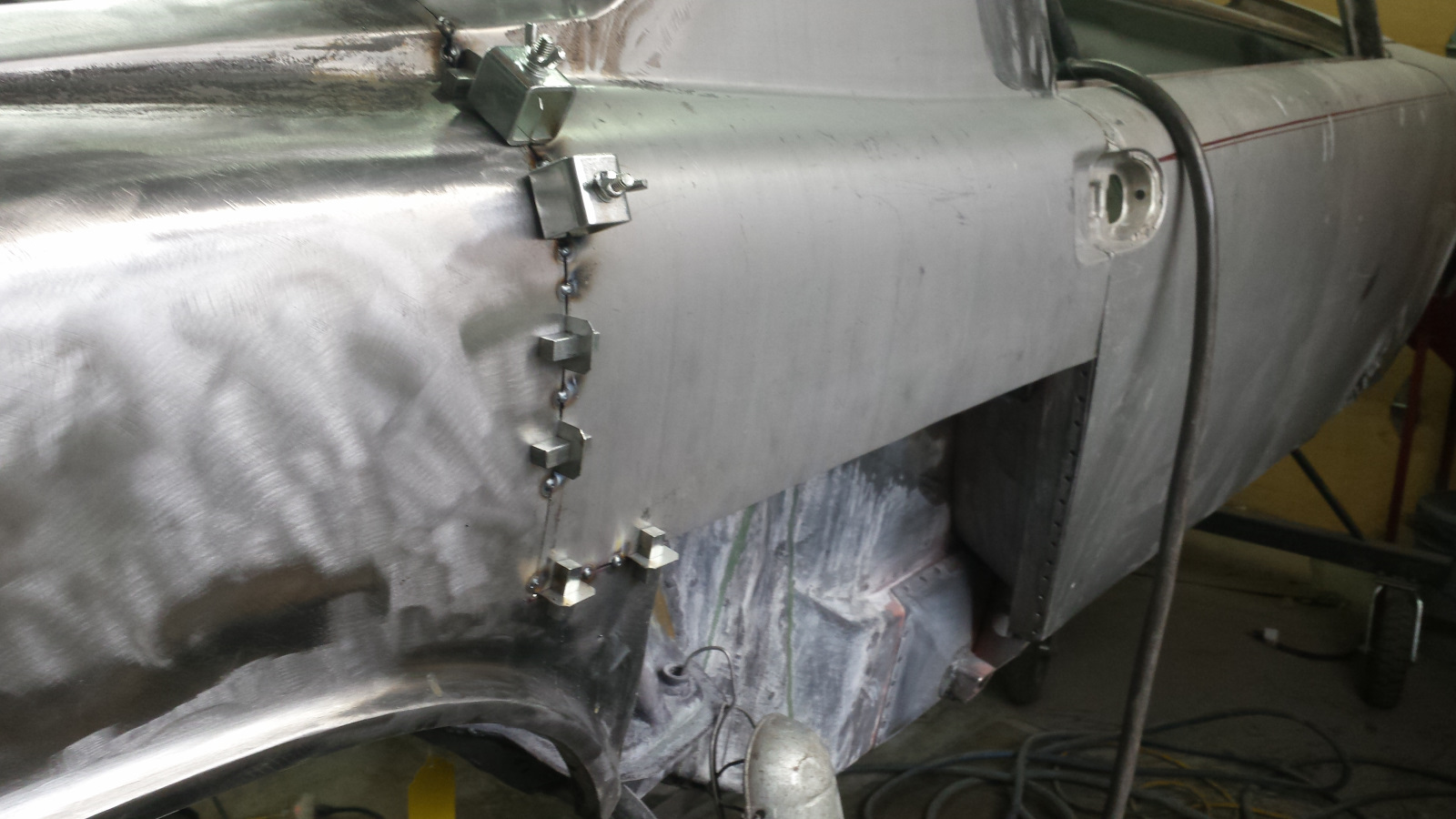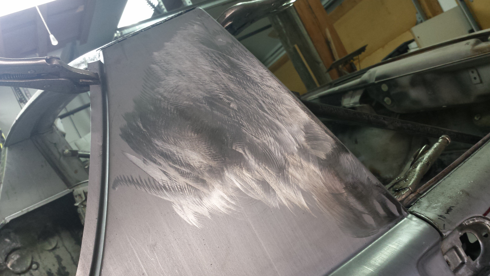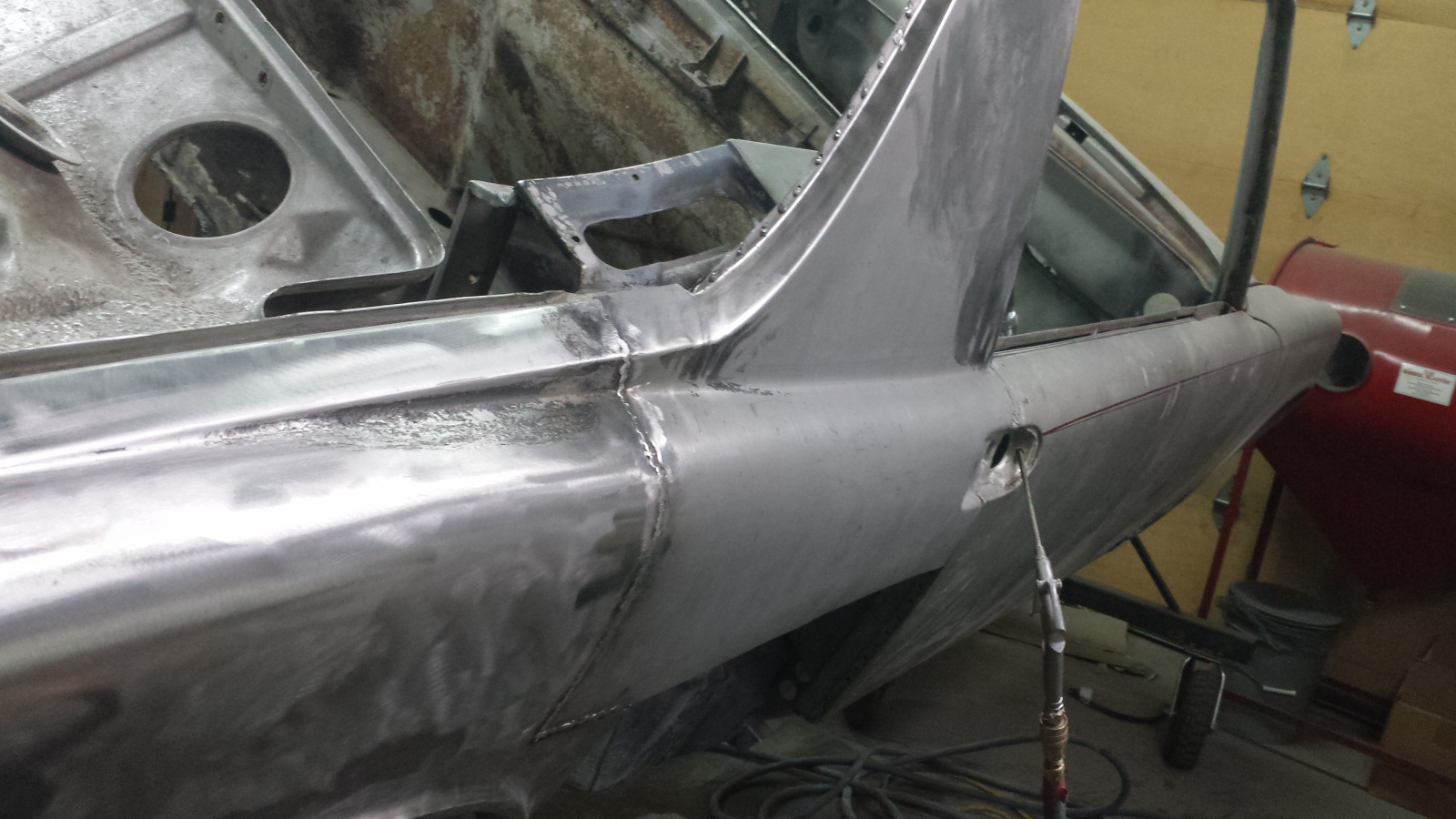 Been a busy week. Didn't receive data from a client when I had hoped, which left me with an unplanned fun day to work on the car. The extra day set me up for steady progress all week. First was trimming the sail panels for final fit. Once they were fit and clamped in place, I noticed they had some slight bulges from the stamping. I decided to shrink as much of those out before spraying primer. Doing it later would risk burning off primer inside the cavity where it couldn't be touched up. This is after 3-4 passes with the shrinking disc. You can see the high spots. At this stage, they've already shrunk out quite a bit. After about 45 minutes of working the shrinking disc countless times, the main high spot has shrunk down flat. There are still a few ripples in the front corner that will need some work and maybe a bit of filler, but much less than without the shrinker. In hind sight, I probably should have used hammer and dolly to flatten those ripples, but I was afraid of stretching the metal and introducing new warps into the panels that would affect the fit. Now I was ready to shoot some primer. Put a couple medium coats of PPG DP LF epoxy on all cavity surfaces and down quite a ways under the quarter panel. Having a full day to get the paint on set me up to make steady progress over lunch and evenings during the week. I started by doing the plug welds on both sail panels. That went smoothly. Now for the welds I've been practicing for With the plug welds done, I loaded a spool of EZ Grind wire for the butt welds. I don't know if it will make any difference. Some people say there is no benefit, others say it hammers out better than normal wire. I figured I could use every bit of help to achieve those invisible welds on these panels. Here's the passenger side clamped and tacked. About 3 hours later, I had the butt welds complete and rough ground with 36 grit just to take the weld down just proud of the parent material. I'll come back and grind a little more, work it with heat, hammer and dolly, and more grinding and blending later. On the driver's side, I had to use a little different approach. The lower edge of the sail panel had a bit of a wave in it. To avoid winding up with an oil can welded in, I trimmed, fit, and clamped the lower section of the quarter panel at the same time. I removed a couple clamps before remembering to snap a picture, but here it is tacked in with most of the clamps still in place. Then the long, slow process of zapping the butt welds shut. Another 3 hours for this. I came very close to getting 'er done before shutting down to go for a walk with the wife and dog and then movie night. I did not expect to start the weekend this far along. Should easily get the lower quarter on the passenger side welded in the morning and then work on grinding, hammering, and blending. Really hoping to get those invisible welds on this! |