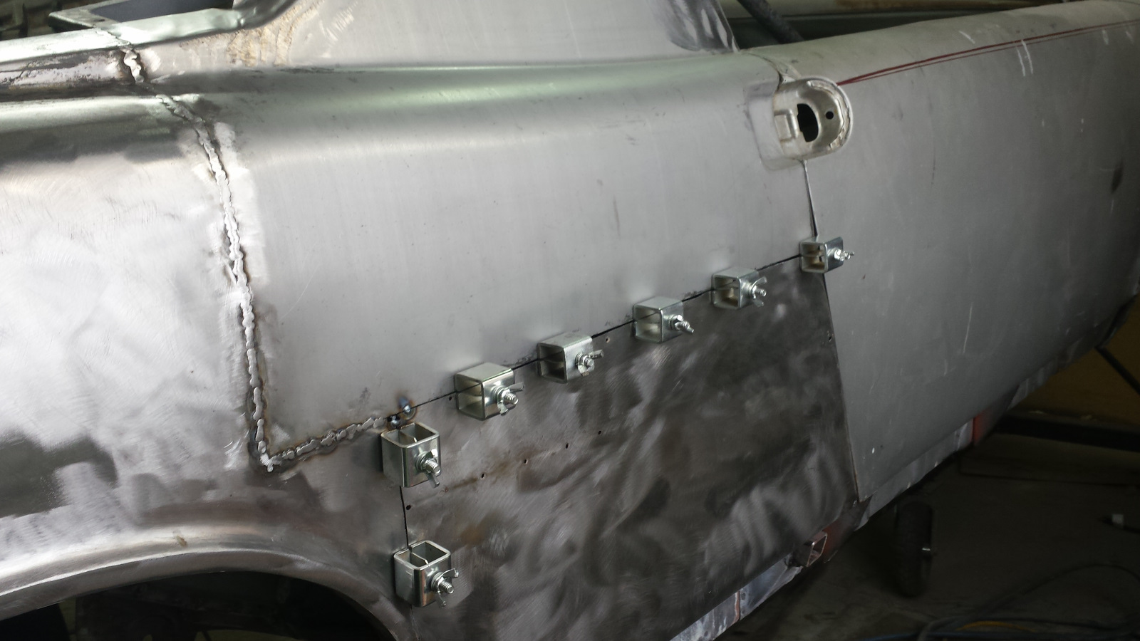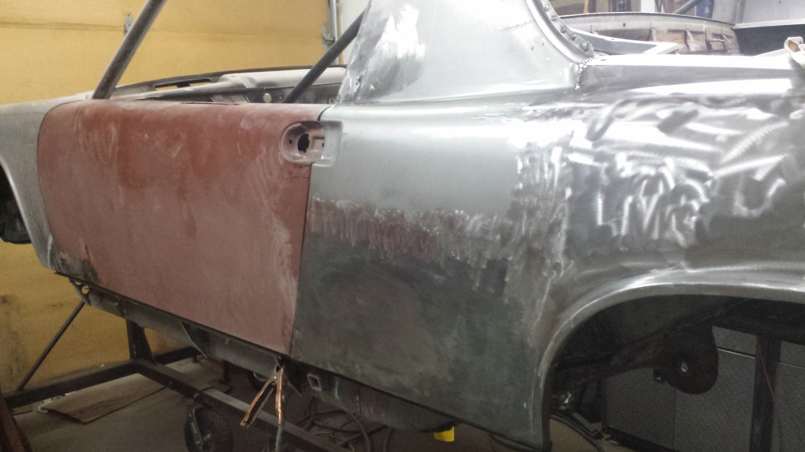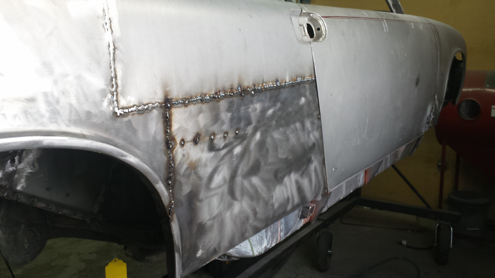 Been a busy week. Didn't receive data from a client when I had hoped, which left me with an unplanned fun day to work on the car. The extra day set me up for steady progress all week. First was trimming the sail panels for final fit. Once they were fit and clamped in place, I noticed they had some slight bulges from the stamping. I decided to shrink as much of those out before spraying primer. Doing it later would risk burning off primer inside the cavity where it couldn't be touched up. This is after 3-4 passes with the shrinking disc. You can see the high spots. At this stage, they've already shrunk out quite a bit. After about 45 minutes of working the shrinking disc countless times, the main high spot has shrunk down flat. There are still a few ripples in the front corner that will need some work and maybe a bit of filler, but much less than without the shrinker. In hind sight, I probably should have used hammer and dolly to flatten those ripples, but I was afraid of stretching the metal and introducing new warps into the panels that would affect the fit. Now I was ready to shoot some primer. Put a couple medium coats of PPG DP LF epoxy on all cavity surfaces and down quite a ways under the quarter panel. Having a full day to get the paint on set me up to make steady progress over lunch and evenings during the week. I started by doing the plug welds on both sail panels. That went smoothly. Now for the welds I've been practicing for With the plug welds done, I loaded a spool of EZ Grind wire for the butt welds. I don't know if it will make any difference. Some people say there is no benefit, others say it hammers out better than normal wire. I figured I could use every bit of help to achieve those invisible welds on these panels. Here's the passenger side clamped and tacked. About 3 hours later, I had the butt welds complete and rough ground with 36 grit just to take the weld down just proud of the parent material. I'll come back and grind a little more, work it with heat, hammer and dolly, and more grinding and blending later. On the driver's side, I had to use a little different approach. The lower edge of the sail panel had a bit of a wave in it. To avoid winding up with an oil can welded in, I trimmed, fit, and clamped the lower section of the quarter panel at the same time. I removed a couple clamps before remembering to snap a picture, but here it is tacked in with most of the clamps still in place. Then the long, slow process of zapping the butt welds shut. Another 3 hours for this. I came very close to getting 'er done before shutting down to go for a walk with the wife and dog and then movie night. I did not expect to start the weekend this far along. Should easily get the lower quarter on the passenger side welded in the morning and then work on grinding, hammering, and blending. Really hoping to get those invisible welds on this! |