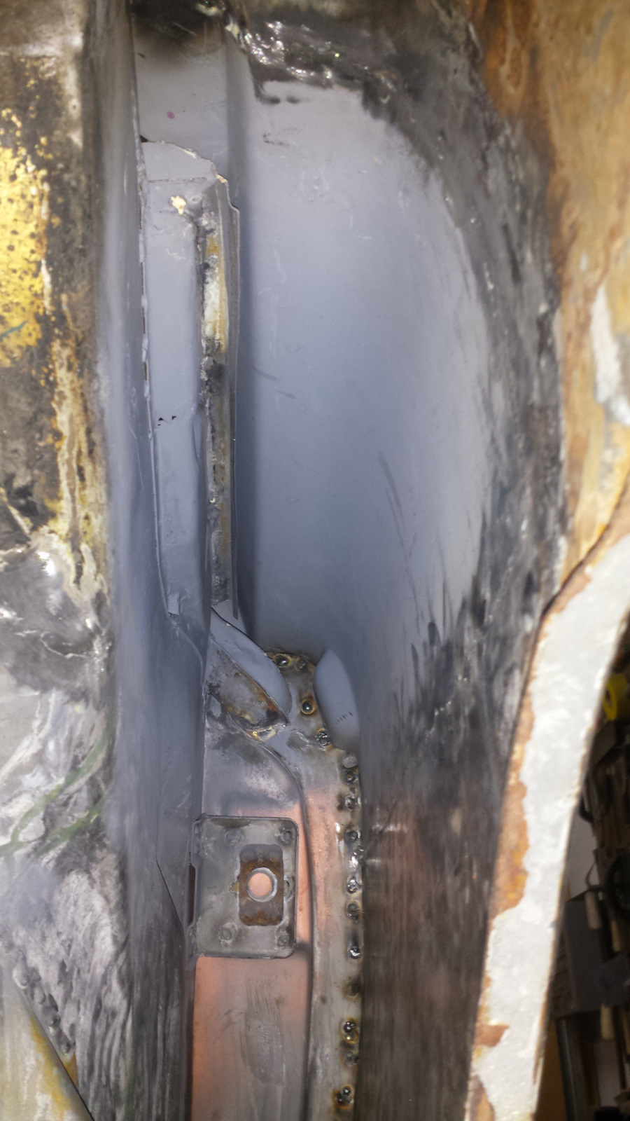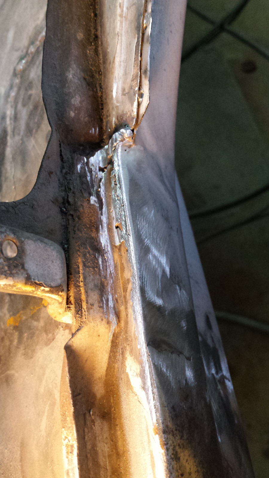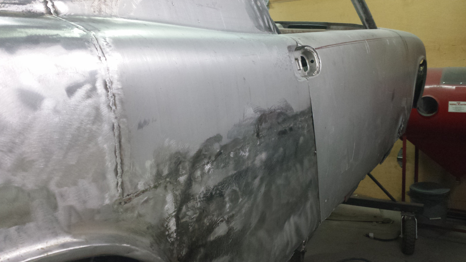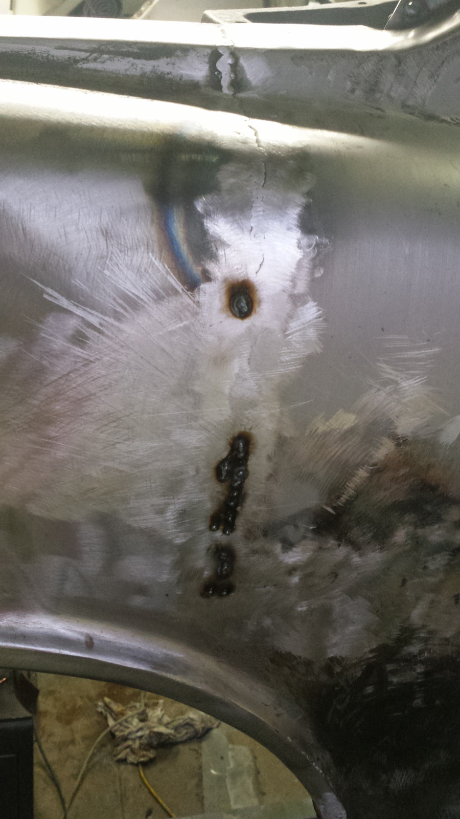 Looks good.. Was just talking with a world class triumph car restorer this morning about metal finishing. He echoed my concerns of thining the metal too much by making the weld disappear and said allot of times you take a panel which might be 18 or 19 GA and thin it to 22 or thinner in spots and thus cracking can occur.. I think the goal is to get as much warpage as possible out with the majority of the weld removed and let filler do the rest. The quality is so much better then what it was 20 years ago.. Your car will finish very nice.. Thanks Ben, that is very good to hear. The rule I've been trying to apply is that if I can feel that the weld is thicker than the parent material with my hands, then I grind some more. If not, I stop. I also do a lot of rapping on the panels with my knuckles. I don't know what that tells me but if it feels solid, it makes me happy. (IMG:style_emoticons/default/biggrin.gif) |