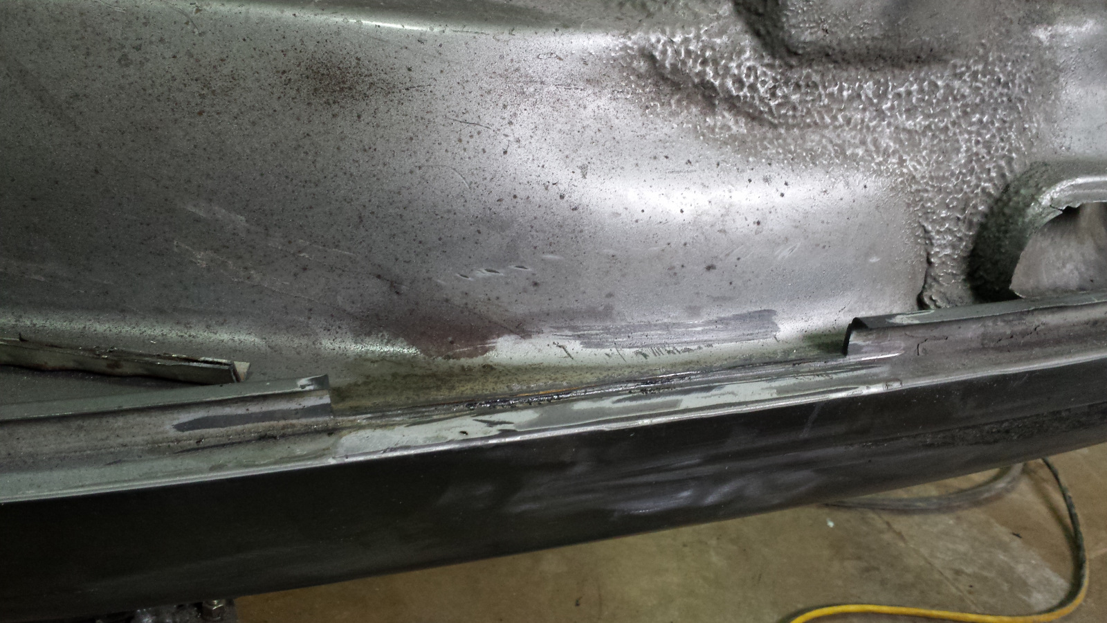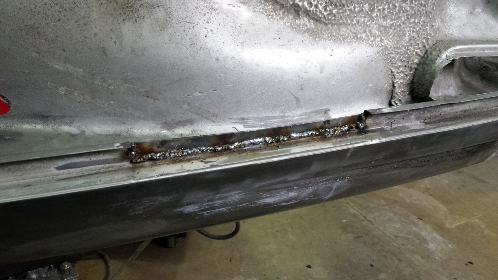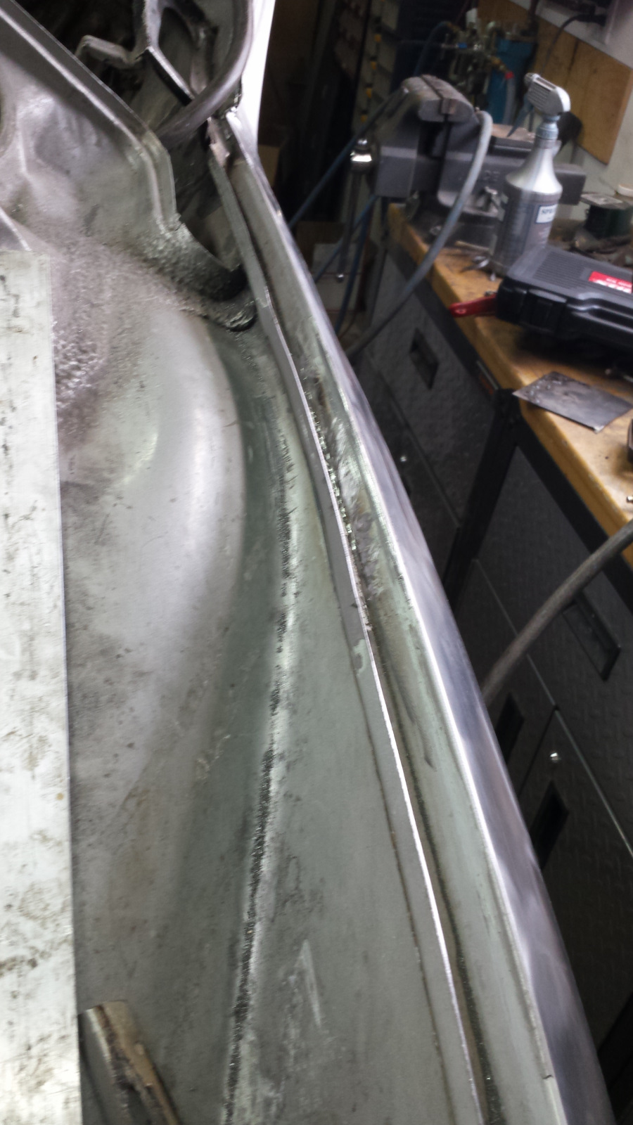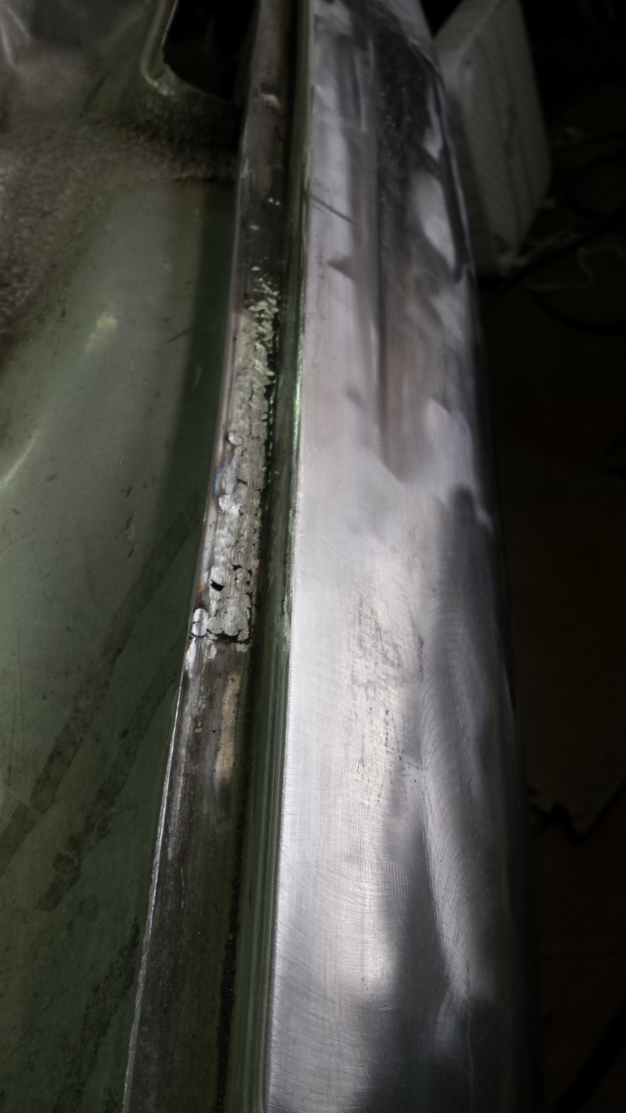 It's getting down to the wire on rust repair, so time to tackle seal channel repairs. There is only one spot in the rear trunk to fix so I started there. It's a frustrating one too because it doesn't look that bad at first glance. The corrosion was between layers of the channel and would only grow if not repaired. I cut it out and soaked Ospho into the seam overnight. The biggest reason I've been dreading channel repair is because I don't have a sheer and the channel edges need to be perfectly straight and square to look good. A vice and bastard file makes an acceptable poor man's sheer for short pieces like this. A more confident and competent fabricator could probably save time by fabbing both layers of the channel and plug welding them together before welding in place, but I had to tackle it one layer at a time. There is a gentle curve in the channel so I tacked the ends of the bottom layer first and then flexed the middle to match perfectly to the original curve before tacking the rest. A copper backing plate on the ends made filling those easy. Then zapped the rest in. You can see spatter in sections of this weld. That's because I just towel dried the seam after neutralizing the Ospho with water so there was steam coming out of areas of the weld. I wasn't worried about it because that seam will get a second pass when the top layer goes on. After this pic was taken, I ground the seam just enough to square up a shoulder for the next layer to butt up against. |