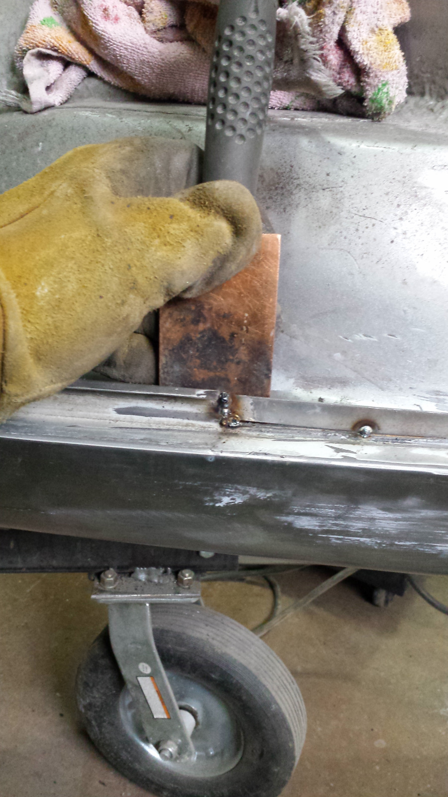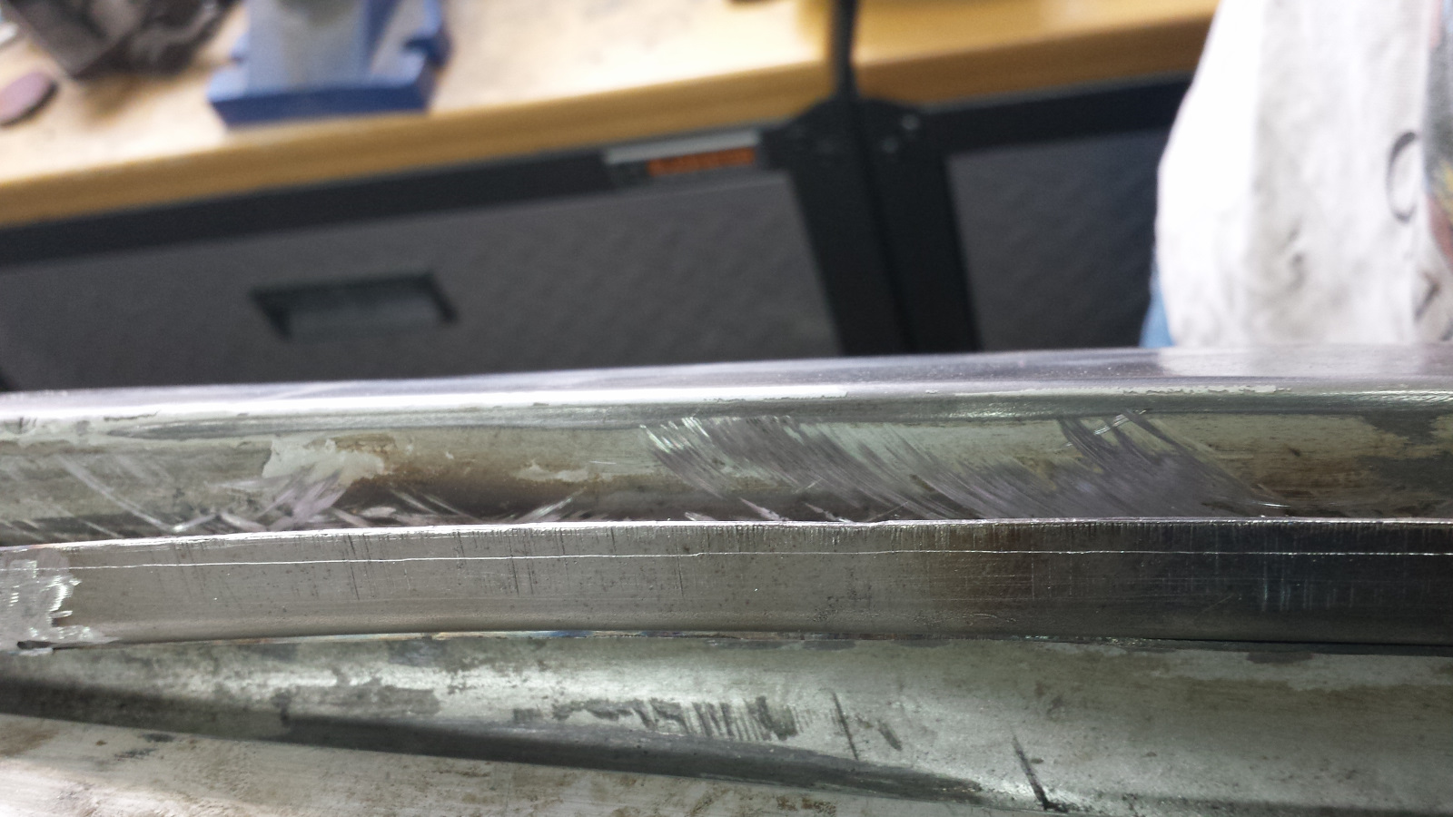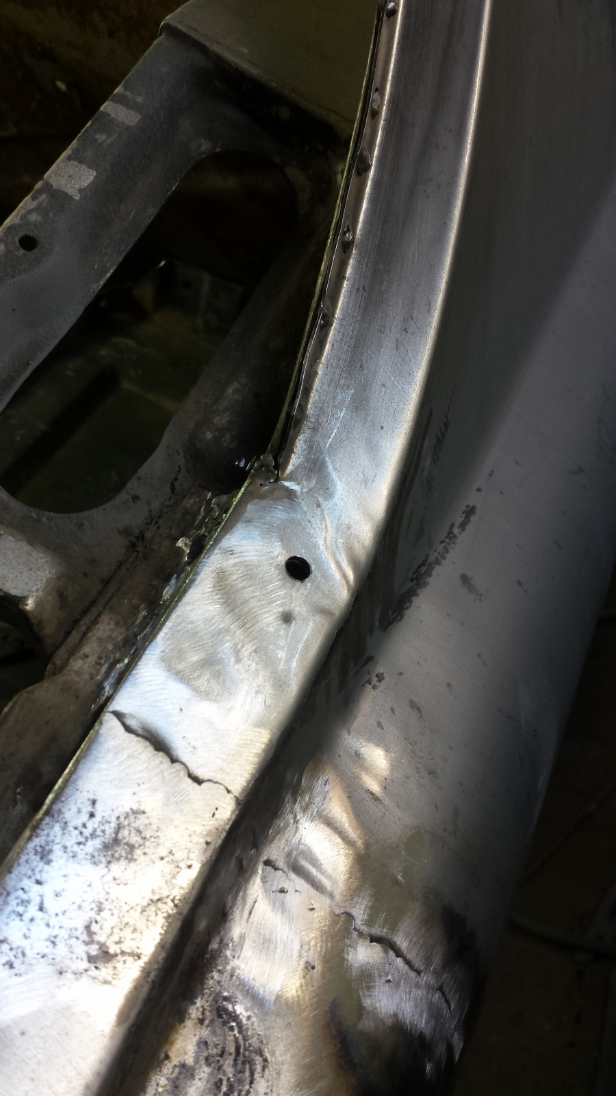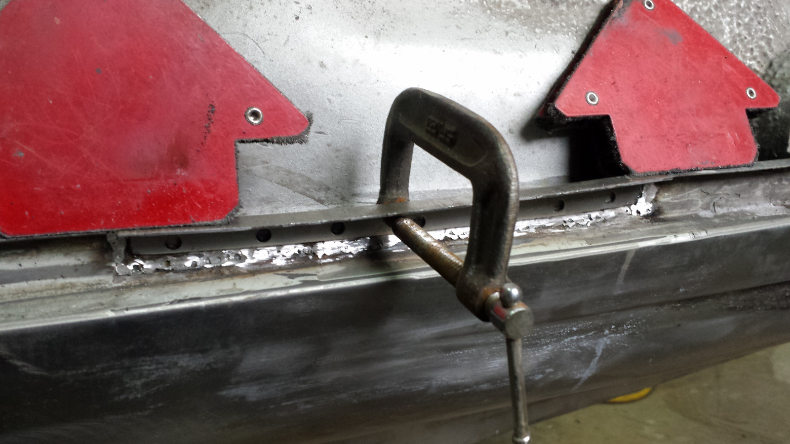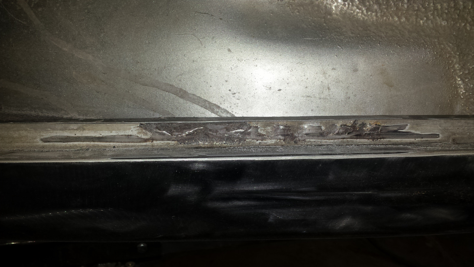 It's getting down to the wire on rust repair, so time to tackle seal channel repairs. There is only one spot in the rear trunk to fix so I started there. It's a frustrating one too because it doesn't look that bad at first glance. The corrosion was between layers of the channel and would only grow if not repaired. I cut it out and soaked Ospho into the seam overnight. The biggest reason I've been dreading channel repair is because I don't have a sheer and the channel edges need to be perfectly straight and square to look good. A vice and bastard file makes an acceptable poor man's sheer for short pieces like this. A more confident and competent fabricator could probably save time by fabbing both layers of the channel and plug welding them together before welding in place, but I had to tackle it one layer at a time. There is a gentle curve in the channel so I tacked the ends of the bottom layer first and then flexed the middle to match perfectly to the original curve before tacking the rest. A copper backing plate on the ends made filling those easy. Then zapped the rest in. You can see spatter in sections of this weld. That's because I just towel dried the seam after neutralizing the Ospho with water so there was steam coming out of areas of the weld. I wasn't worried about it because that seam will get a second pass when the top layer goes on. After this pic was taken, I ground the seam just enough to square up a shoulder for the next layer to butt up against. |