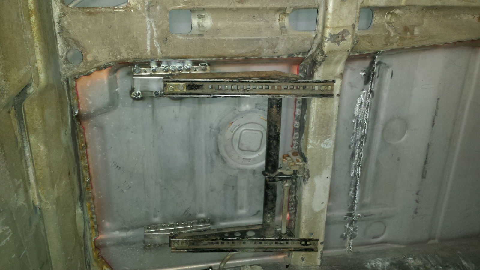 Did a bunch of grinding today. Not exciting. Then I decided to finally fix that cock-eyed seat mount that I've been putting off. I decided to cut it out from the back using the good 'ol Rotobroach. That way, all the ugliness will be under the car and covered by undercoat. I don't know what the deal was with that bracket, but it kept wanting to go in cattywampus like it did the first time. I wound up having to screw down and weld one side before screwing down and welding the other, but I got it done. This should hide under the undercoat. Mucho mejor - |