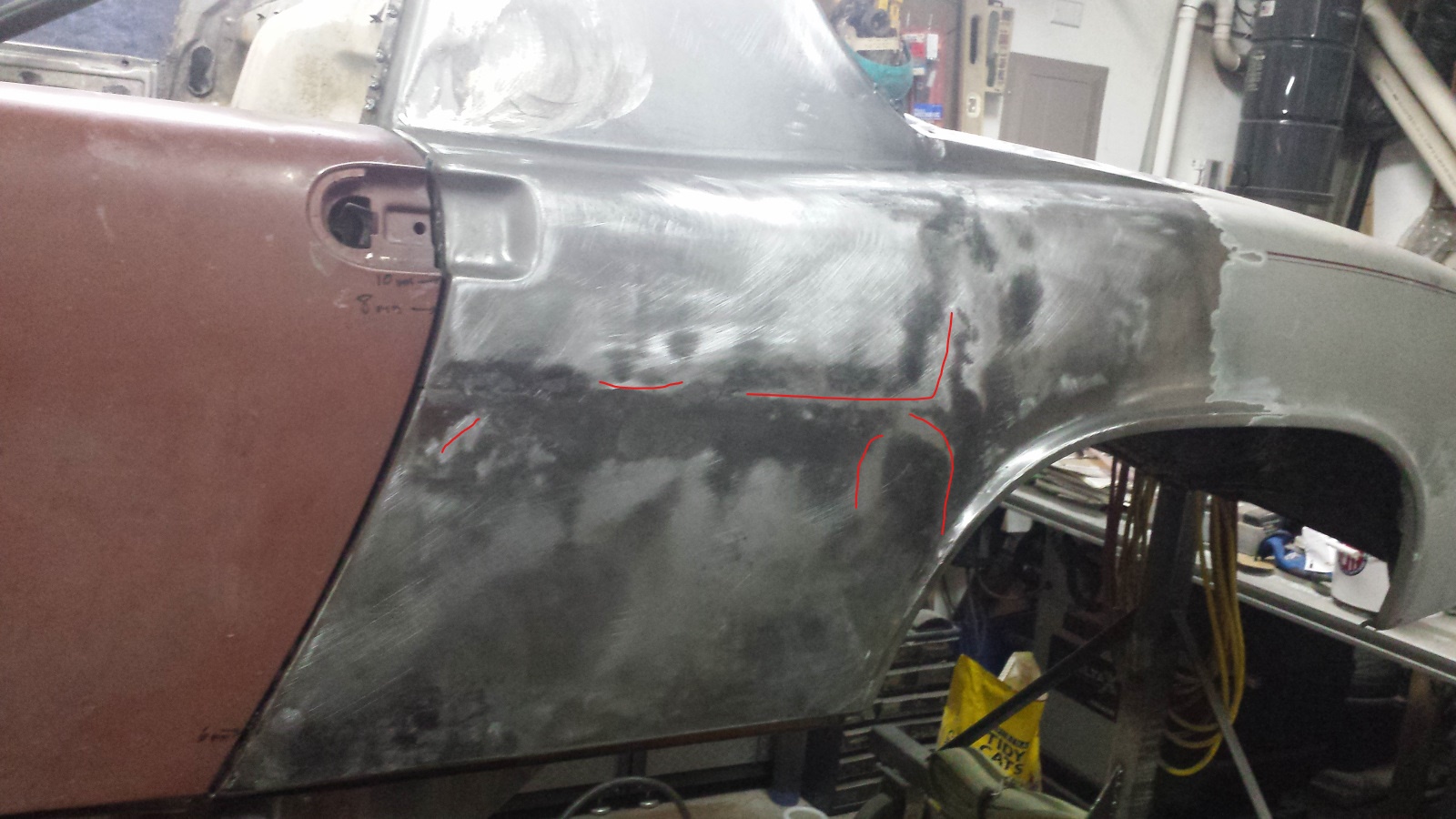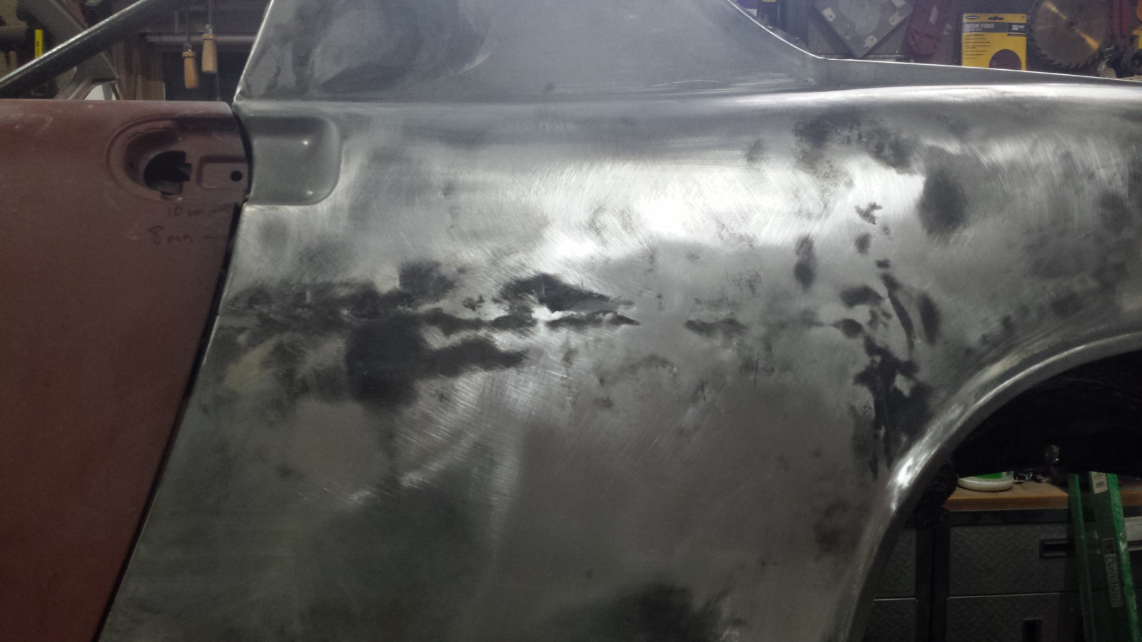 We had dinner guests, so not much progress yesterday. But I couldn't resist sneaking out to the shop briefly after company left. I couldn't dig into anything too dirty and have been dying to try out my Durablock set and do some metal bumping. So I dusted the left quarter with guide coat and blocked it with 80g just to see what I would be dealing with. It was actually a bit worse than this pic shows because I bumped out about four low shots before grabbing the camera.