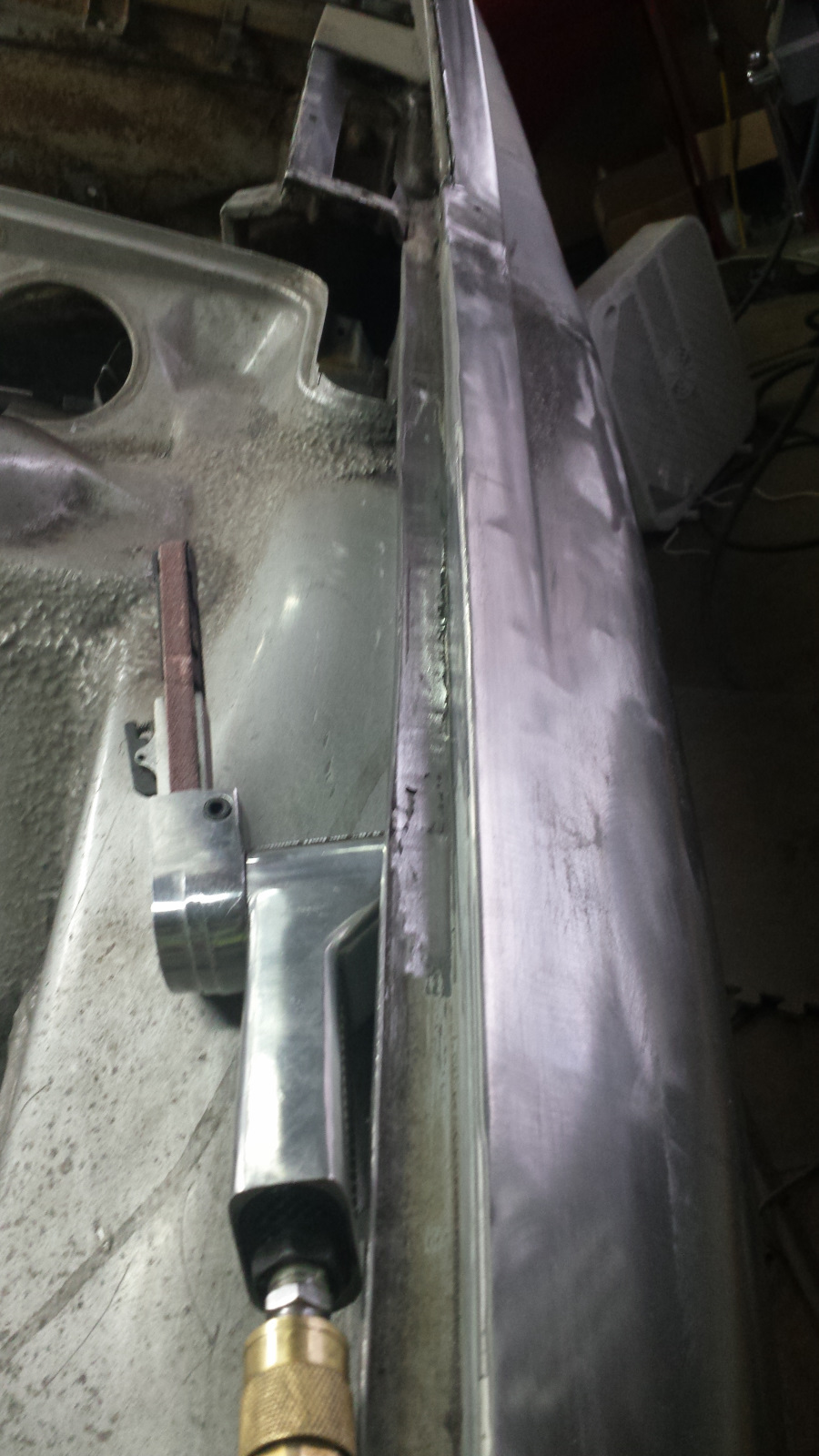 I've marked out the spots that will need additional shrinking I think. Then I'll see what remains of low spots and try to raise them. I picked up a HF door skin kit last week to add a slapper and a couple more dollies to the collection, but the hammer has already found a use too. I really don't know what I'm doing but this is fun! (IMG:style_emoticons/default/clap56.gif) We'll come back to that later to see how I do. Same Bat Channel Again... I have a slow work day today, so stole a little extra time this morning to finish up the trunk channel. The cheapo air sander I picked up at HF for about 20 bucks is just the ticket for smoothing welds inside those channels. I knocked down the high spots with the edge of a 14" bastard file (I just like saying "bastard") and then finished with 60g and 80g paper. I need to order better sanding belts. HF abrasive products are pure (IMG:style_emoticons/default/stromberg.gif). But it worked, and with a teeny bit of filler, we'll never know we were there. What Hump? Warning: the following contains graphic detail and nit-pickery and is not intended for sane audiences. Viewer discretion is advised. Okay, here's where I could really use some advice. Maybe I'm getting way too picky, but I've come close to cutting this channel repair out and starting over. When I said "light touch" on the stretcher to match the trunk arch, I really meant it. Even my light touch overdid it a scosche and wound up with an arch that is slightly off from the original curve. The bottom of the channel is double-walled at this point so pretty stubborn, but I used a piece of bar stock and hammer to tap it down closer to the original curve. That caused the overstretched wall to curve inward over the channel, so I hit them with the shrinking disc which helped, but it was hard to build enough heat and the going was slow, so I reverted to the MAPP torch to heat the walls and quench them to shrink them back down, followed by working the top edge a little more with the body file to get the profile adjusted. That helped, and eventually I got things pretty close, but not perfect. After staring at it for way too long, I realized that a lot of the arch mismatch was an optical illusion because my bending brake left a slightly larger radius on the bend than the original channel. That was causing a shadow line that made the arch look higher than it was. I hit it with a little primer to see how it might look after painting. I might be able to live with that, but I'm still on the fence about it. What say ye? (IMG:style_emoticons/default/confused24.gif) |