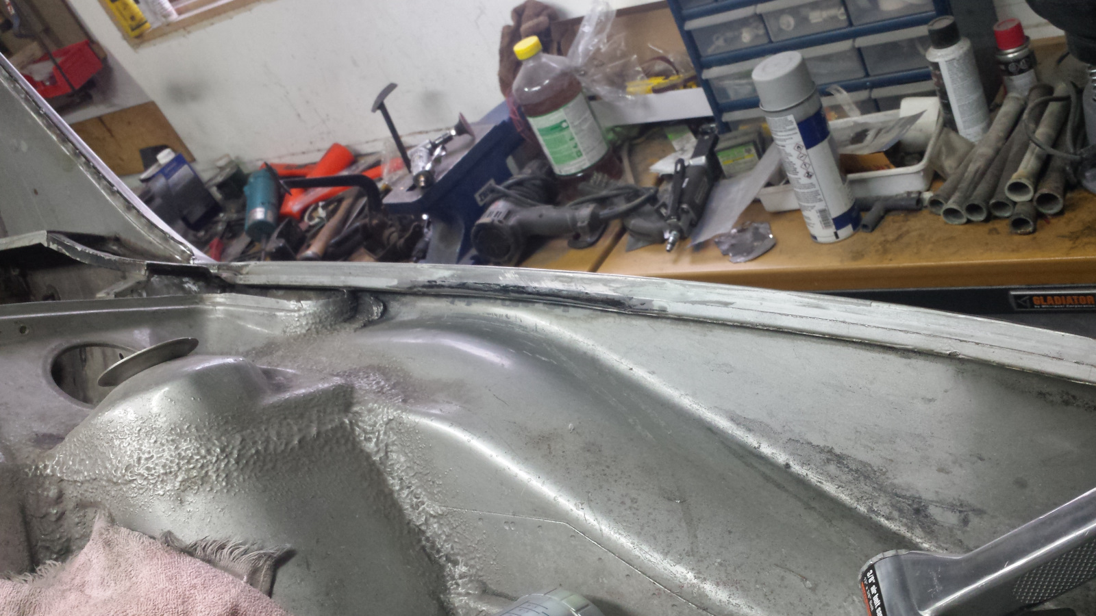 I found that metal bumping is the perfect task when Mr. Magoo to putter on the car without getting dirty. I bumbled around for about 3 hours today with the shrinking, slapper, and hammer. I have no clue what I'm doing, but think I'm making progress. Here's where I started: