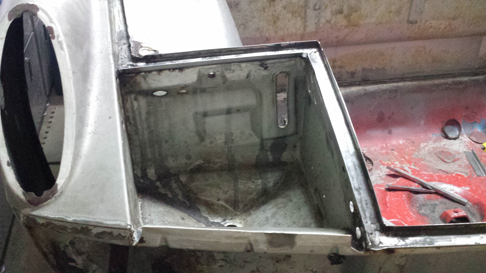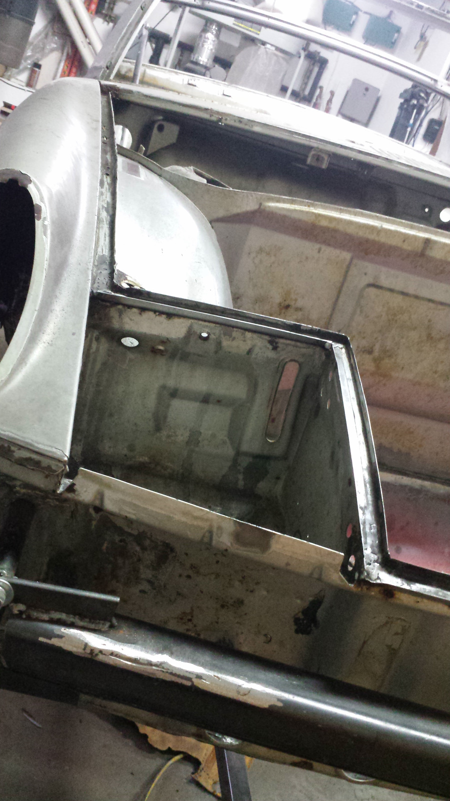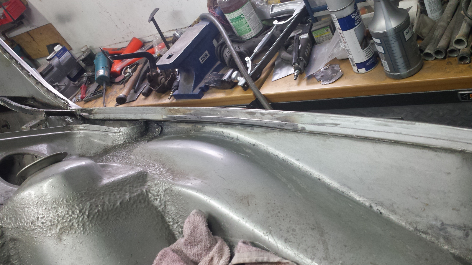 We had dinner guests, so not much progress yesterday. But I couldn't resist sneaking out to the shop briefly after company left. I couldn't dig into anything too dirty and have been dying to try out my Durablock set and do some metal bumping. So I dusted the left quarter with guide coat and blocked it with 80g just to see what I would be dealing with. It was actually a bit worse than this pic shows because I bumped out about four low shots before grabbing the camera. I've marked out the spots that will need additional shrinking I think. Then I'll see what remains of low spots and try to raise them. I picked up a HF door skin kit last week to add a slapper and a couple more dollies to the collection, but the hammer has already found a use too. I really don't know what I'm doing but this is fun! (IMG:style_emoticons/default/clap56.gif) We'll come back to that later to see how I do. Same Bat Channel Again... I have a slow work day today, so stole a little extra time this morning to finish up the trunk channel. The cheapo air sander I picked up at HF for about 20 bucks is just the ticket for smoothing welds inside those channels. I knocked down the high spots with the edge of a 14" bastard file (I just like saying "bastard") and then finished with 60g and 80g paper. I need to order better sanding belts. HF abrasive products are pure (IMG:style_emoticons/default/stromberg.gif). But it worked, and with a teeny bit of filler, we'll never know we were there. What Hump? Warning: the following contains graphic detail and nit-pickery and is not intended for sane audiences. Viewer discretion is advised. Okay, here's where I could really use some advice. Maybe I'm getting way too picky, but I've come close to cutting this channel repair out and starting over. When I said "light touch" on the stretcher to match the trunk arch, I really meant it. Even my light touch overdid it a scosche and wound up with an arch that is slightly off from the original curve. The bottom of the channel is double-walled at this point so pretty stubborn, but I used a piece of bar stock and hammer to tap it down closer to the original curve. That caused the overstretched wall to curve inward over the channel, so I hit them with the shrinking disc which helped, but it was hard to build enough heat and the going was slow, so I reverted to the MAPP torch to heat the walls and quench them to shrink them back down, followed by working the top edge a little more with the body file to get the profile adjusted. That helped, and eventually I got things pretty close, but not perfect. After staring at it for way too long, I realized that a lot of the arch mismatch was an optical illusion because my bending brake left a slightly larger radius on the bend than the original channel. That was causing a shadow line that made the arch look higher than it was. I hit it with a little primer to see how it might look after painting. I might be able to live with that, but I'm still on the fence about it. What say ye? (IMG:style_emoticons/default/confused24.gif) I will say that no one will know notice it once everything is 1 color. |