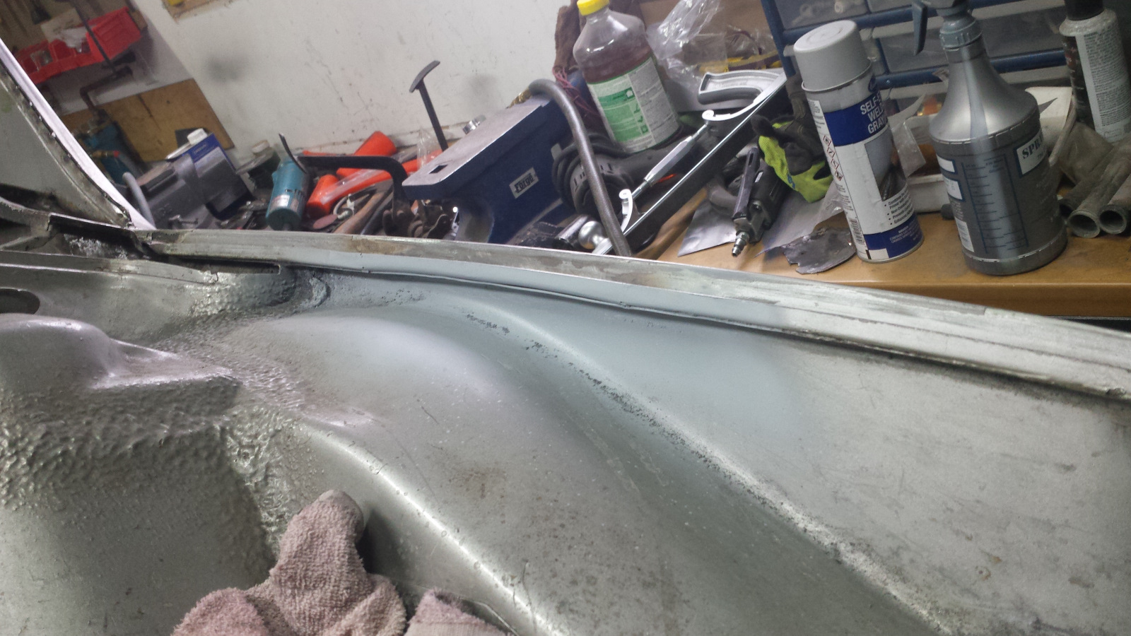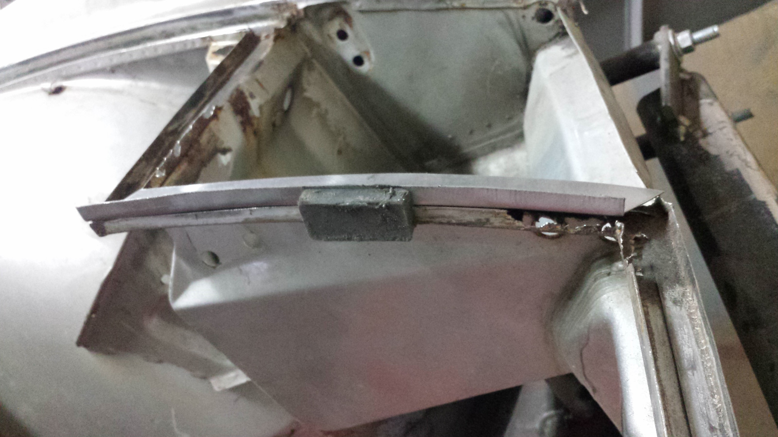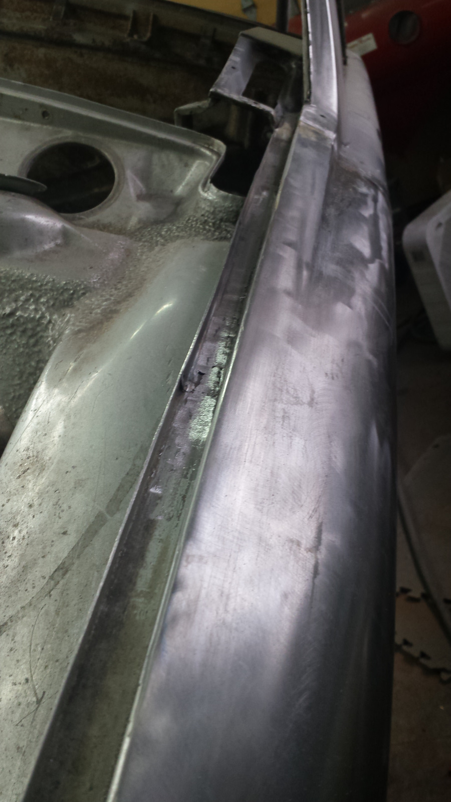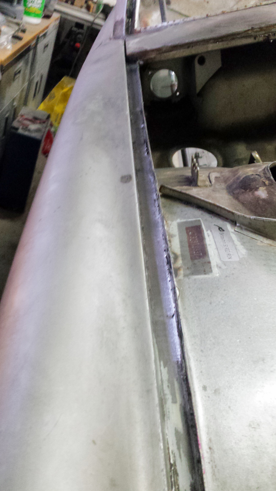 And here's the same deal on the bottom. I've just knocked off the tops of the turds here. And the final cleanup. A bit of FG filler on the top, seam sealer on the bottom, and we'll never know it was patched. Probably won't get much done this week. Got to travel out of town for the project from hell. |