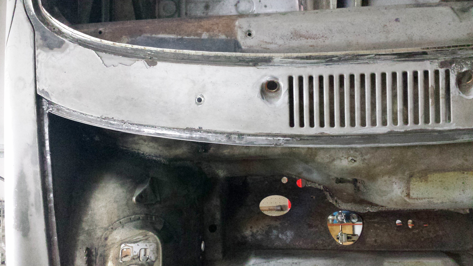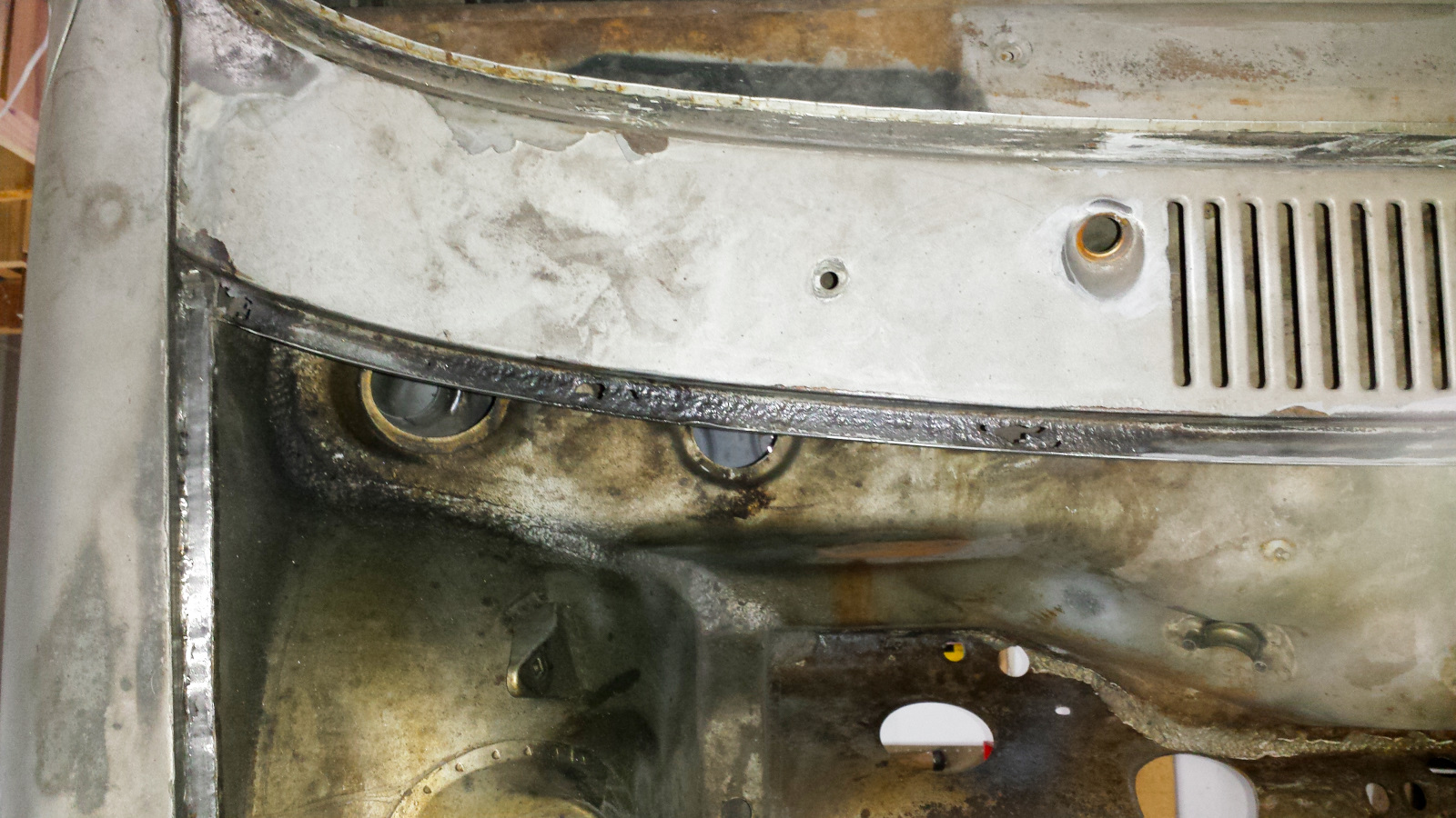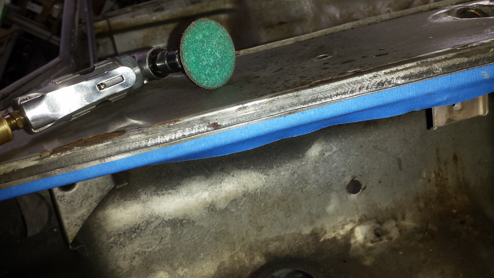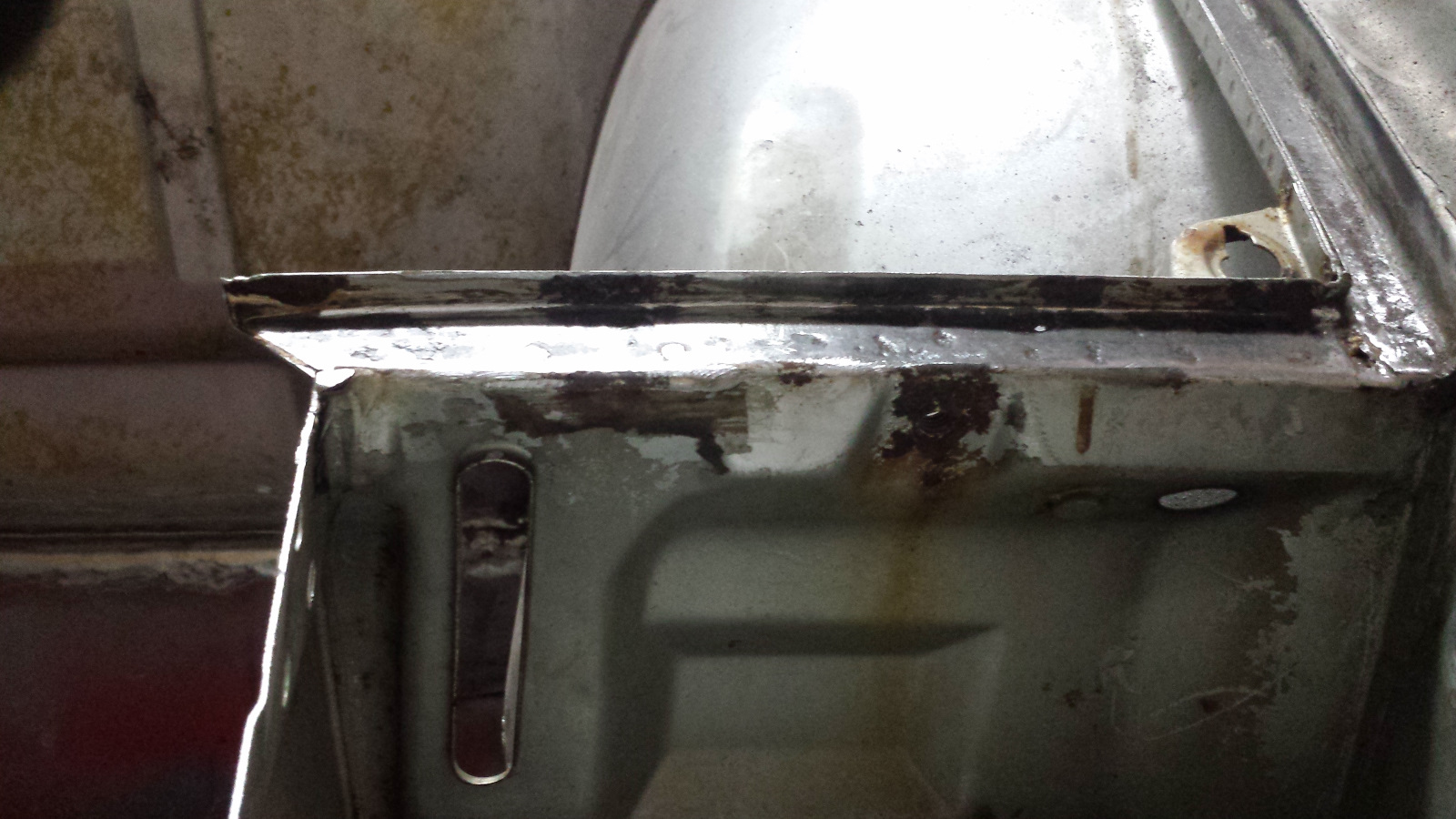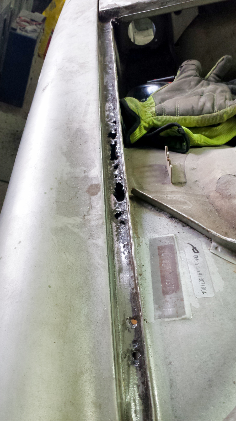 And here's the same deal on the bottom. I've just knocked off the tops of the turds here. And the final cleanup. A bit of FG filler on the top, seam sealer on the bottom, and we'll never know it was patched. Probably won't get much done this week. Got to travel out of town for the project from hell. |
