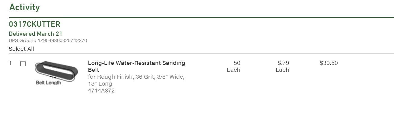 I forgot to mention that I picked up a box of these sanding belts for my air file at the local paint supply for $20. I was going to try the McMaster-Carr belts Cary is using but didn't want to wait. These belts are WAY more economical than HF POS belts. HF belts are ~$1/belt but come as an assortment including belts you rarely need. 3M are $2/belt but you get 10 of the grit you want and each belt lasts 5-10 times longer than junk HF. I've used the crap out of my first belt and it is still serviceable. Well worth the $.