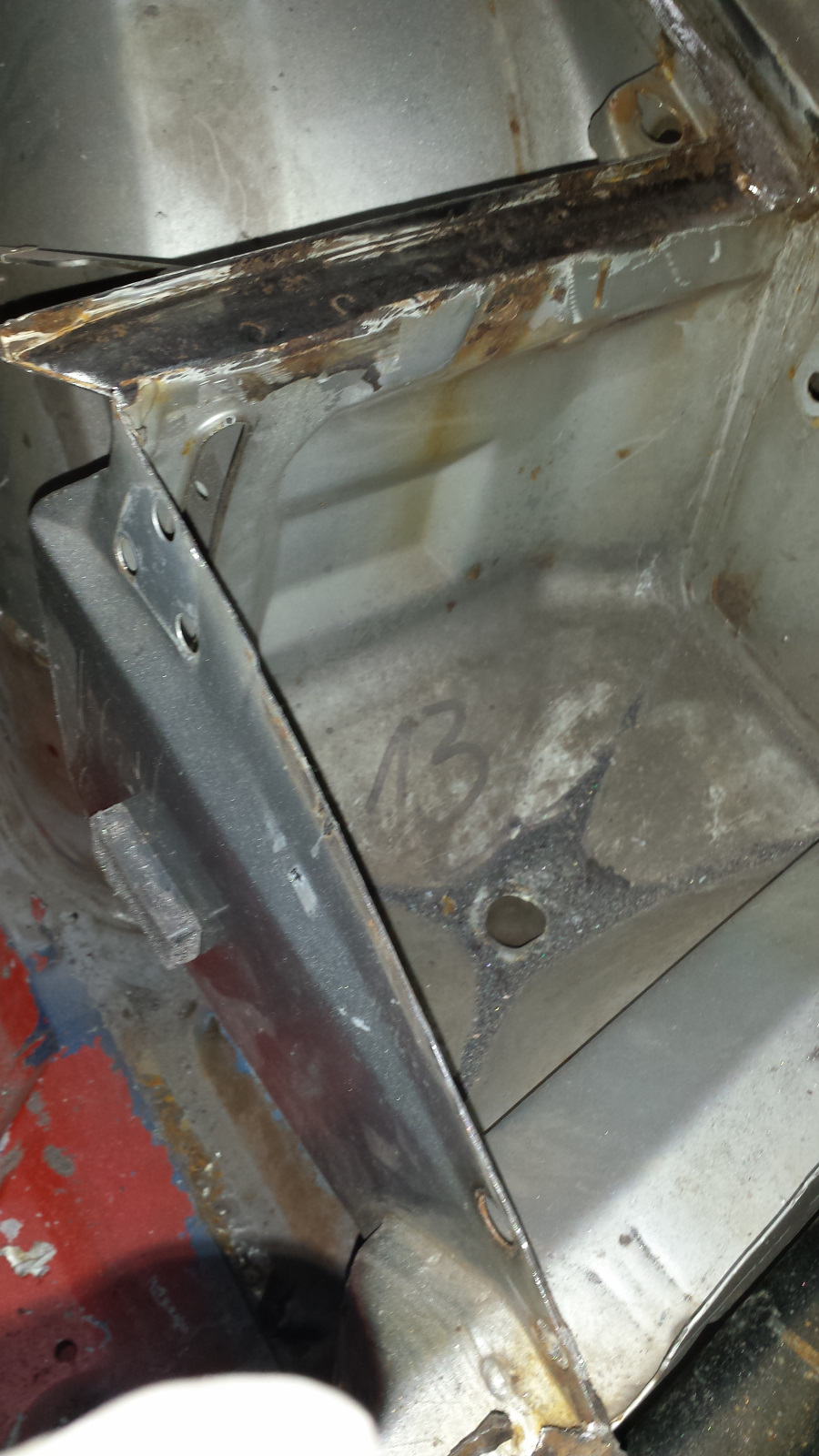 I tried to weld as much as I could from the bottom side because the channel interfered with the welder nozzle and there as too much stick out. That's where my inexperience showed. I had to crank up the welder wicked hot to get a good stick with the nozzle out that far. The upshot was mostly really clean looking welds interspersed with turkey shit. Here's the top side after rough grinding just part of it with a cutoff wheel. Notice the clean, unground welds on the outer edge. The Turkey shit starts on the inner edge just beyond the ground stuff. That's where the bulge blocks access from the bottom.