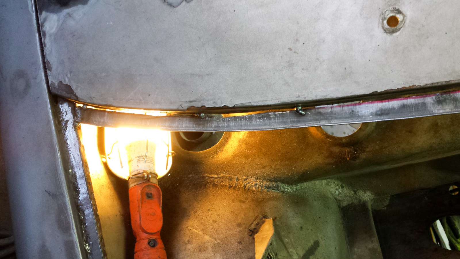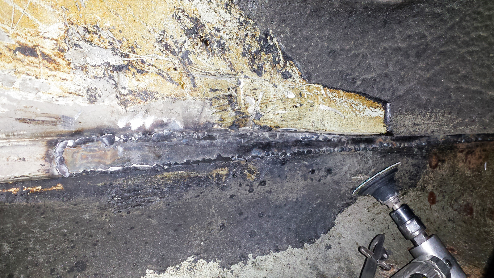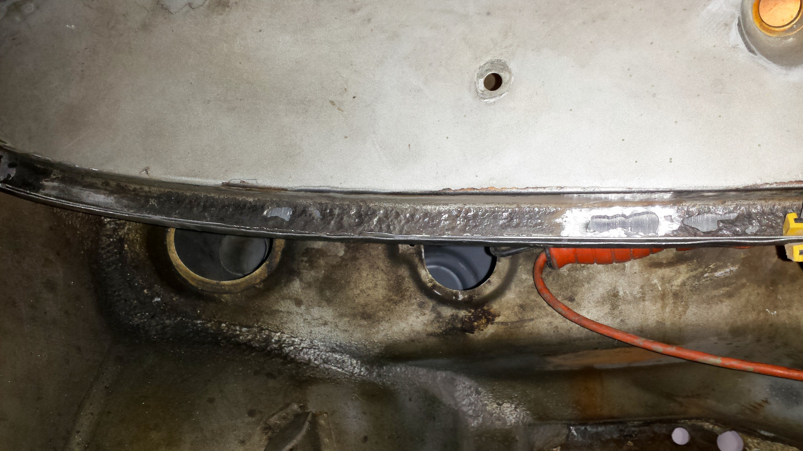 I used a copper spoon and tried to weld as much as possible from the back side because it would be easier to grind. No easy, just easiER. Man what a horrible place to work. Barely enough room to fit your head with a welding helmet on and twisted in the most godawful contortions. At one point, I managed to weld a big booger onto the copper spoon, effectively sticking it into the gap. I didn't even know that was possible and had a helluva time getting it loose. I was genuinely in a foul mood. Eventually, I got the damn thing welded in.