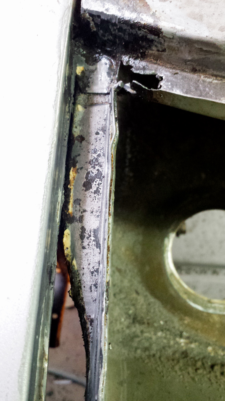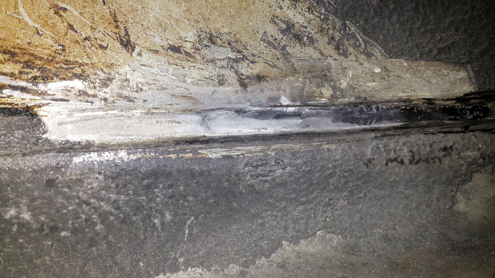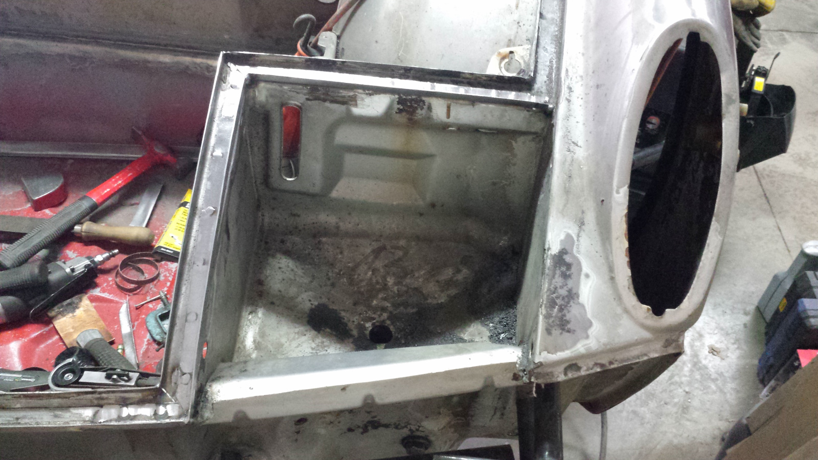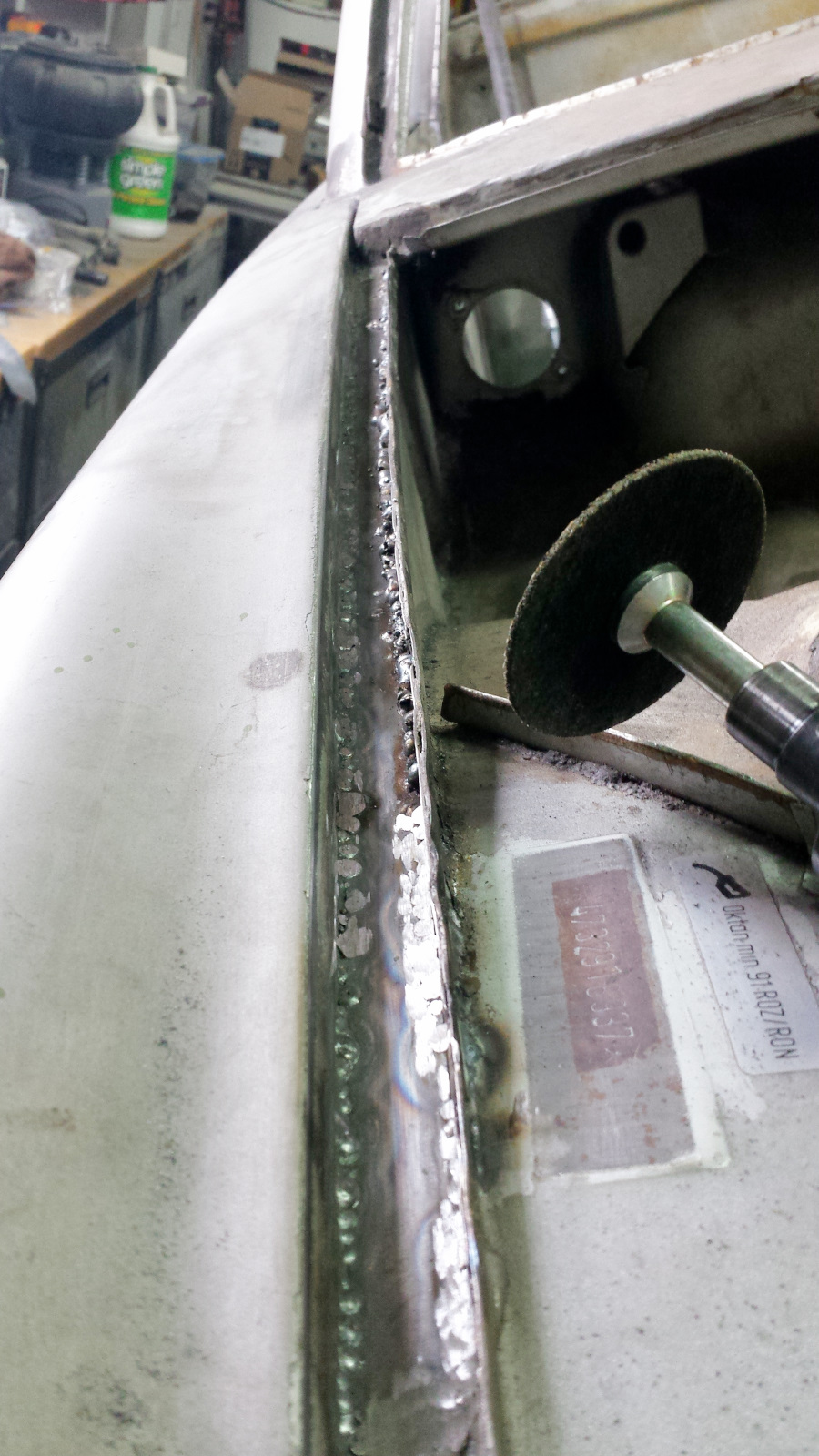 I used a copper spoon and tried to weld as much as possible from the back side because it would be easier to grind. No easy, just easiER. Man what a horrible place to work. Barely enough room to fit your head with a welding helmet on and twisted in the most godawful contortions. At one point, I managed to weld a big booger onto the copper spoon, effectively sticking it into the gap. I didn't even know that was possible and had a helluva time getting it loose. I was genuinely in a foul mood. Eventually, I got the damn thing welded in.