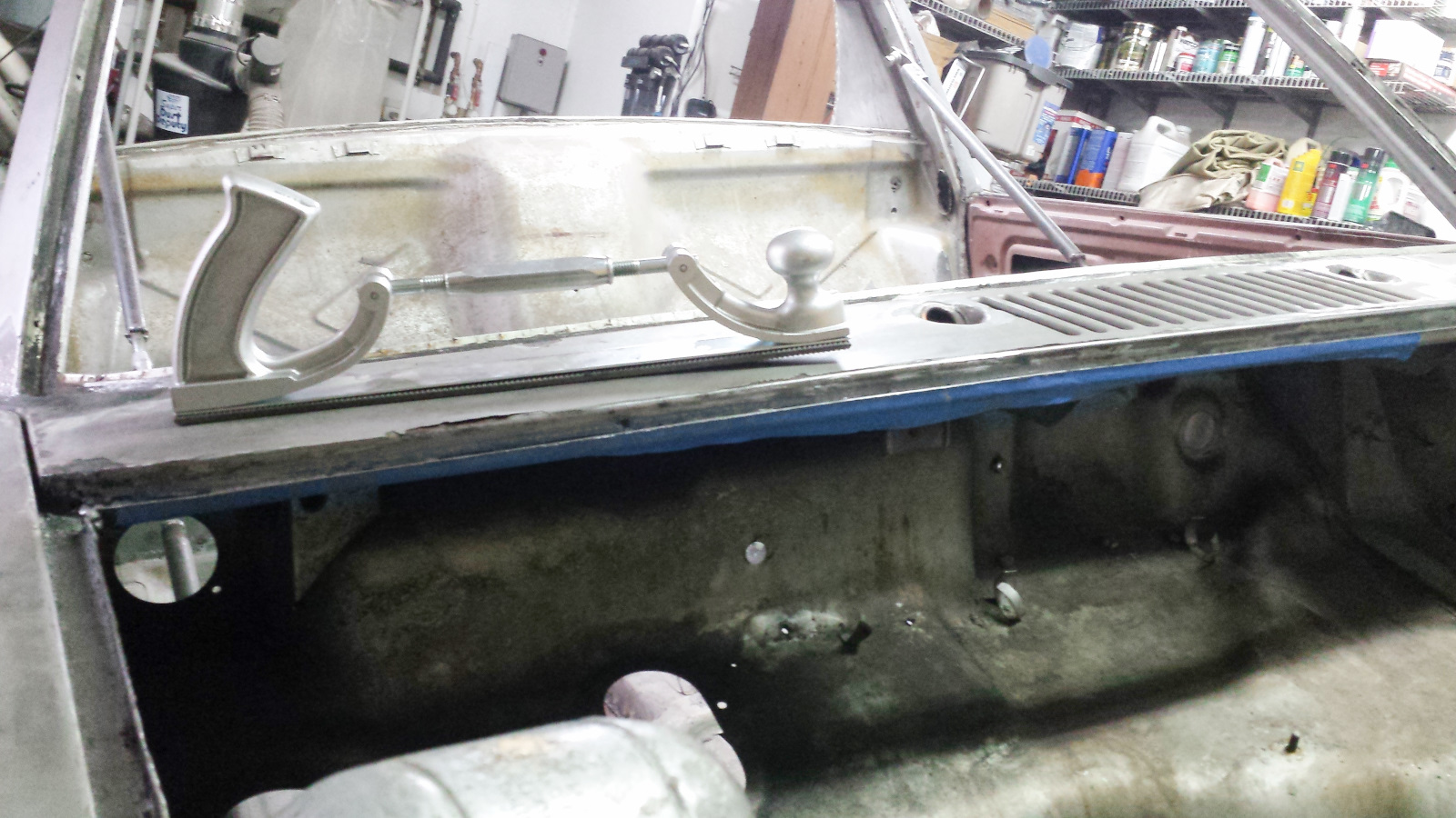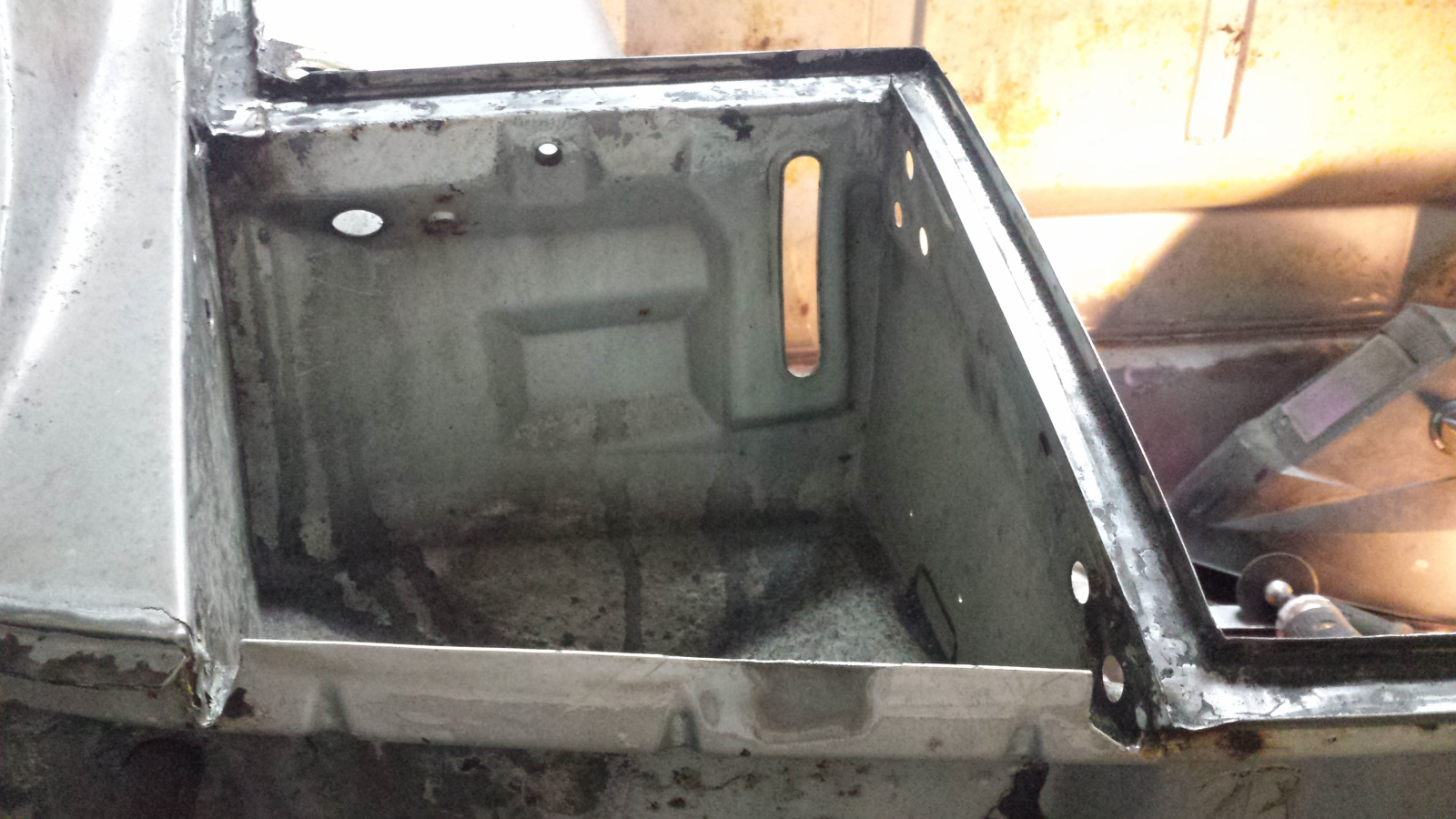 The gods seem to be conspiring against me for car progress. Thursday morning I was looking at bare gravel on my driveway and the birds were declaring spring had arrived. Perfect time to get the tent garage erected over the weekend and get some serous blasting done. I managed to squeeze in time to fab and weld in the little reinforcements for the rear sway bar and do a fair amount of grinding on the trunk butt seam while I was back there. Cut these out of 16 gauge with aviation snips. Thanks to Steve for getting me the correct thickness and dimensions. You need a strong grip to cut that thick of steel with hand snips. Luckily, I have a freakishly strong grip. No, not because of THAT (IMG:style_emoticons/default/mad.gif) It's actually more weird. I spent many days since childhood flipping over huge rocks looking for critters. Yeah, this is the sign of a true nerd. ![]() Oh yeah... the reinforcement. Here you go. ![]() Then Friday morning, we had this... It was a bit of a Donner Party situation. Only the 3rd time in 15 years up here that the roads were impassable with 4WD and a good set of snow tires. It took until about 1 pm to dig out enough that I could hook up the plow and clear a path so Elizabeth could get to work. Believe it or not, I was able to plow without putting chains on. Barely, but I got it done. Blizzak are amazing tires. April in Montana - gotta love it. Come on out Dion, it's a paradise! Needless to say, the tent plans were foiled. And more obstacles. A work project from hell kept me chained to my desk most of the weekend. I was able to sneak down to the car a few hours at a time while my computer was busy churning data. Back to the seal channel repairs. Here's what I tackled this round: The channel walls looked good, so I decided to just cut out the bottom. That way, the repairs will be buried under the seal and everything visible will remain factory fresh. There's a bulge in the fuel compartment where it meets the cowl that creates a double-walled affair under the channel. Giant PITA for welding in a new bottom. |