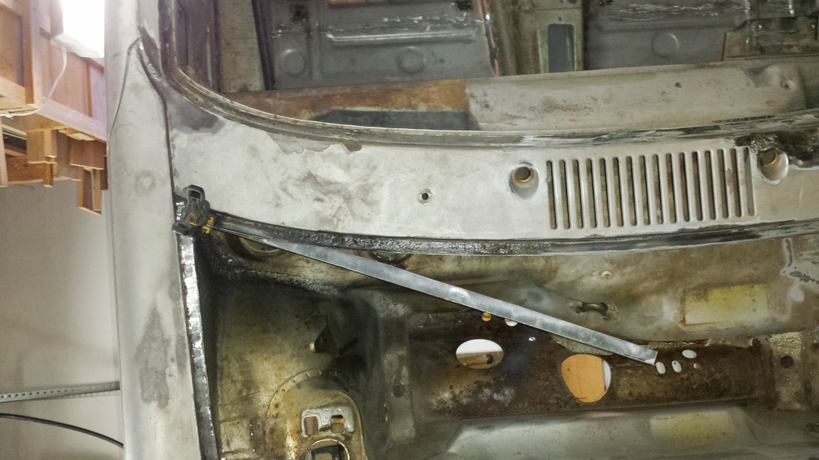 I'll spare the details. Here is it after cleanup and repair. Like the other side, the top layer of the horizontal was toast. Actually, it was pretty much gone. That was pretty easy to replace. There's more rot up that side channel and below the cowl. Stay tuned... |