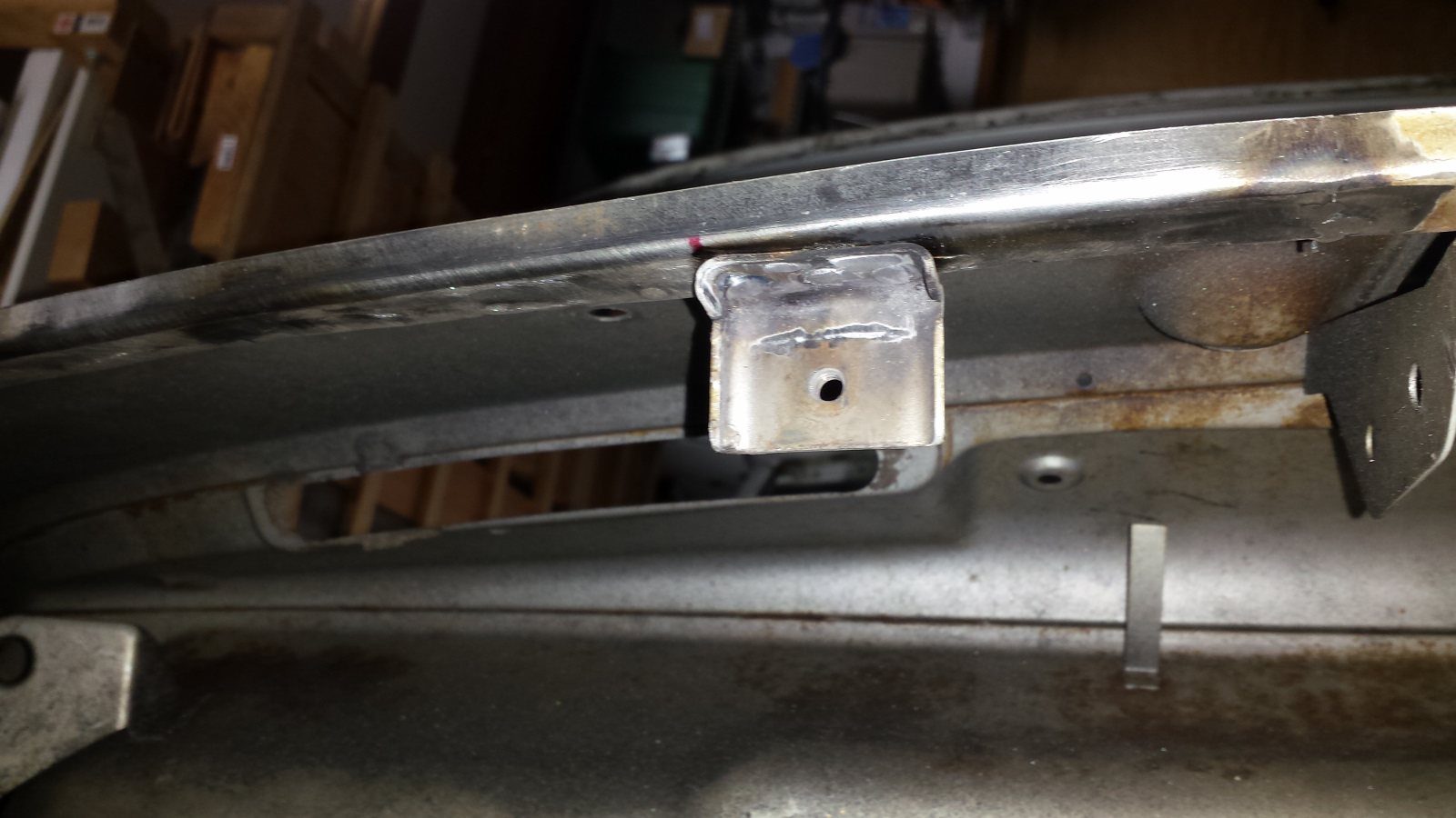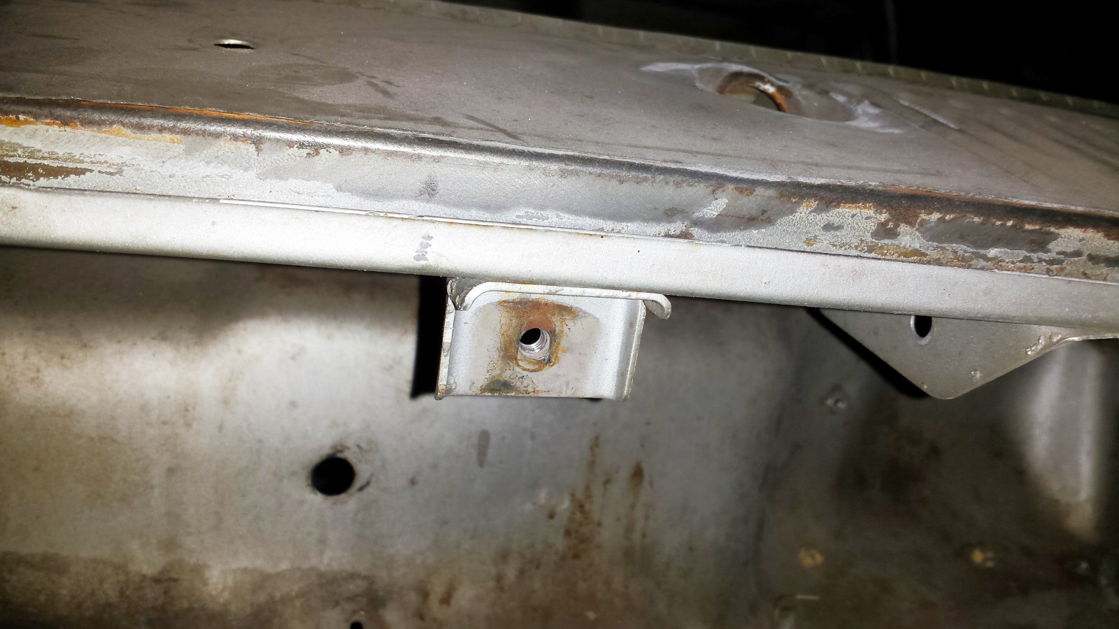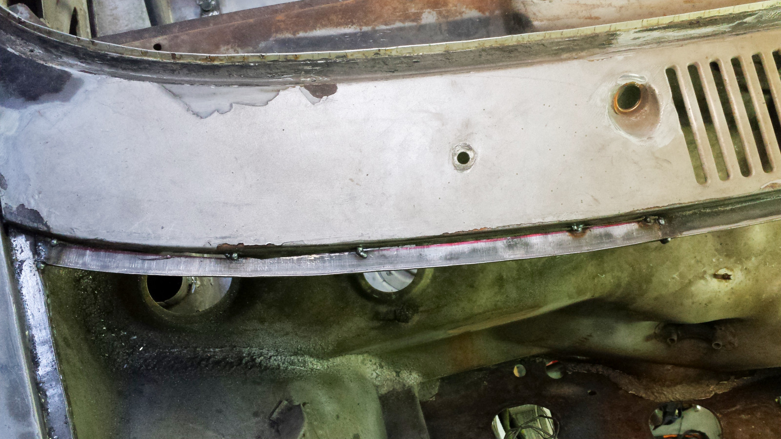 I had one more large section of channel to repair in the front trunk - the passenger side under the cowl. Severe pitting and many holes. I'm not gonna lie, this piece was a giant B. First I had to remove the little bracket under the cowl. Bent a piece of angle and took it to the shrinker. It really didn't take long to get from this. to this (you might have to look close to see the patch piece is nested under the original. Then the cursing started. Bending the piece caused the 90 degree bend to flatten to more like 80 degrees. That wasn't hard to bend back, but doing so introduced a twist that made fitting and trimming the piece a real PITA. I had to tack the end toward the middle and work my way out toward the end, tacking as I went and making sure the channel width was correct. It was an f'ing pain. By the time it was tacked in place, I had gaps the size of the Grand Canyon to fill. |