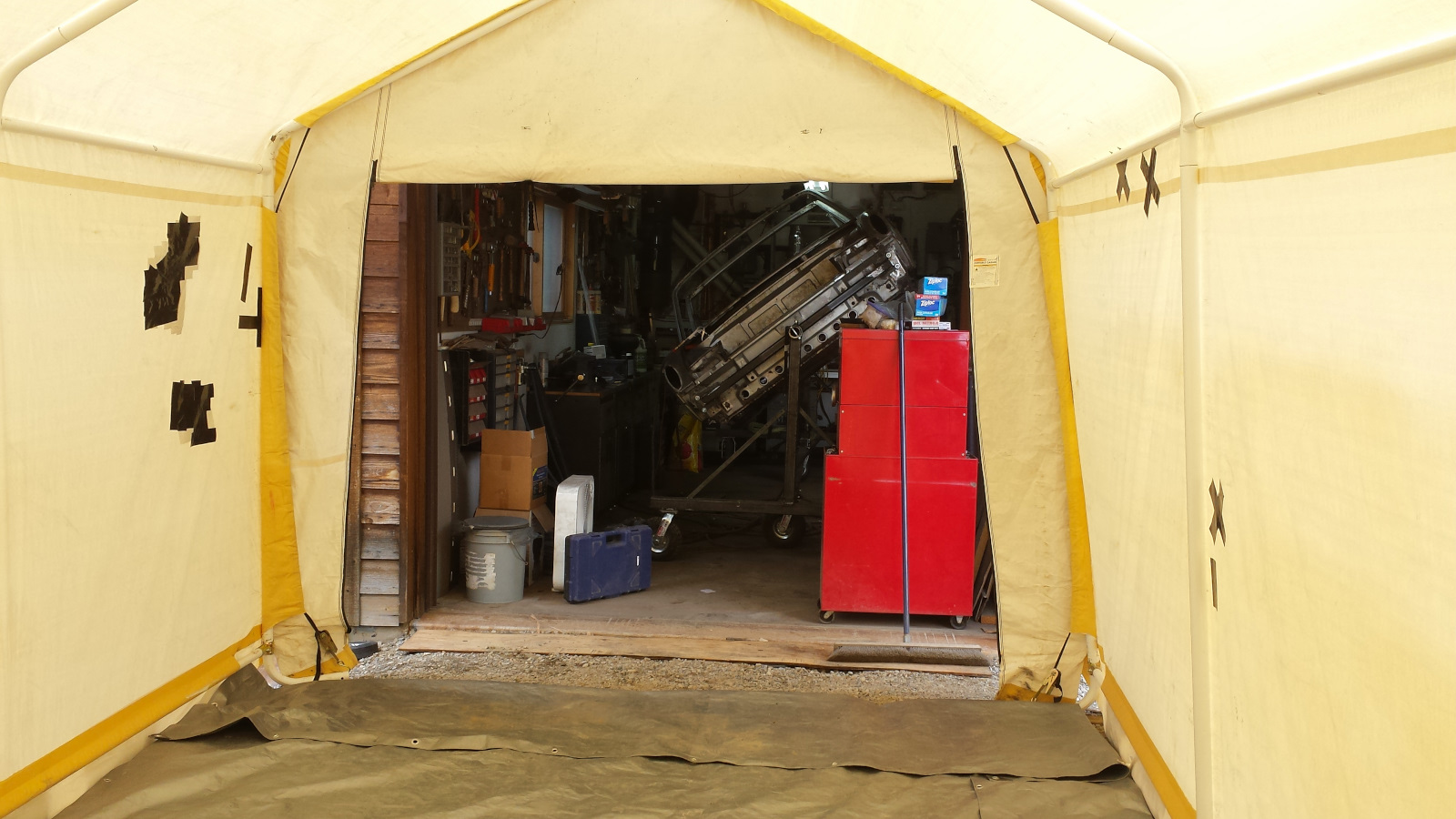 What a difference a week makes. Last weekend we were under two and a half feet of snow. This weekend, our side of the mountain was bare. After taking Ibuprofen to kill the pain from the contortions of yesterday, I set up the tent garage. Just getting that blasting cabinet out of the garage has helped free up space. While I was enjoying the sunshine, my neighbor across the road on the north facing side got his pickup buried in at least 4 feet of snow. I would have helped, but I don't own any equipment big enough to help unstick that. Even another neighbors tractor couldn't pull it out. I'm glad I live on this side. |