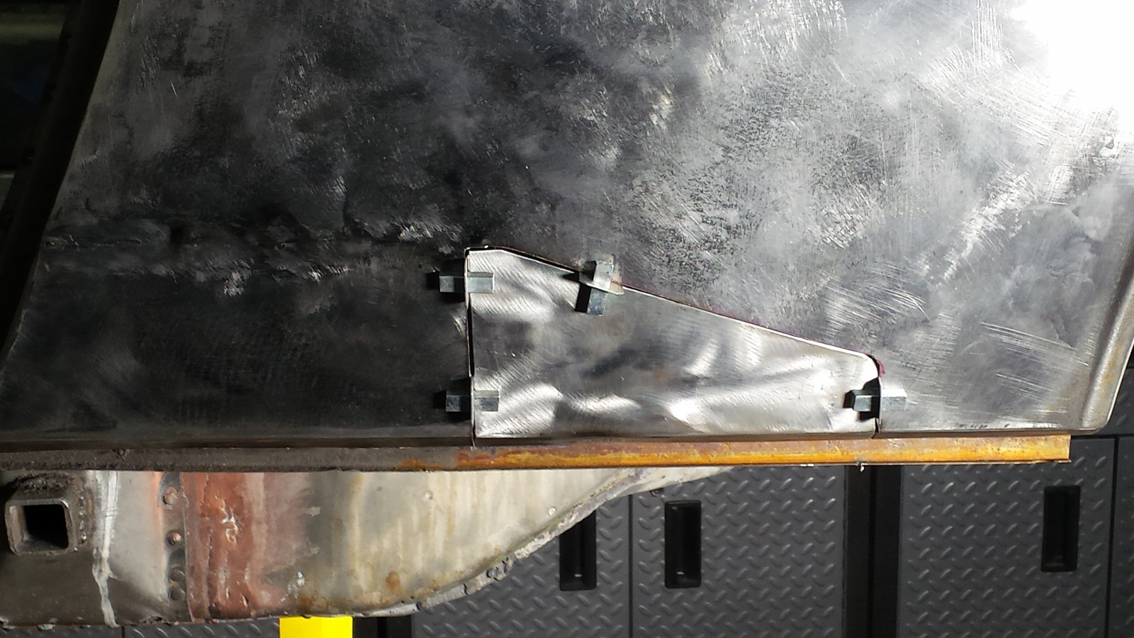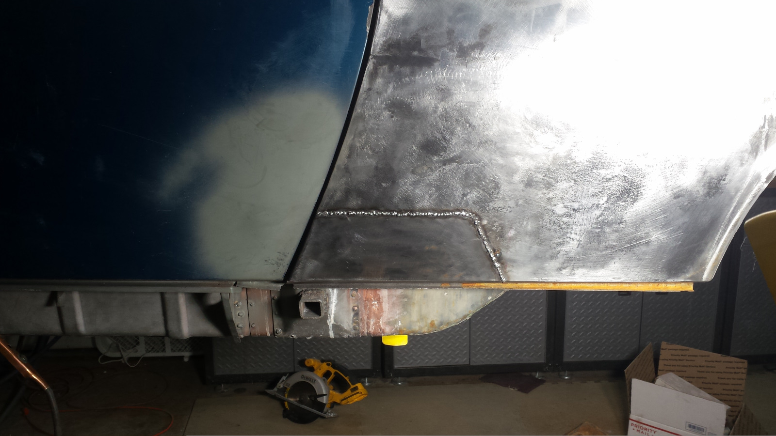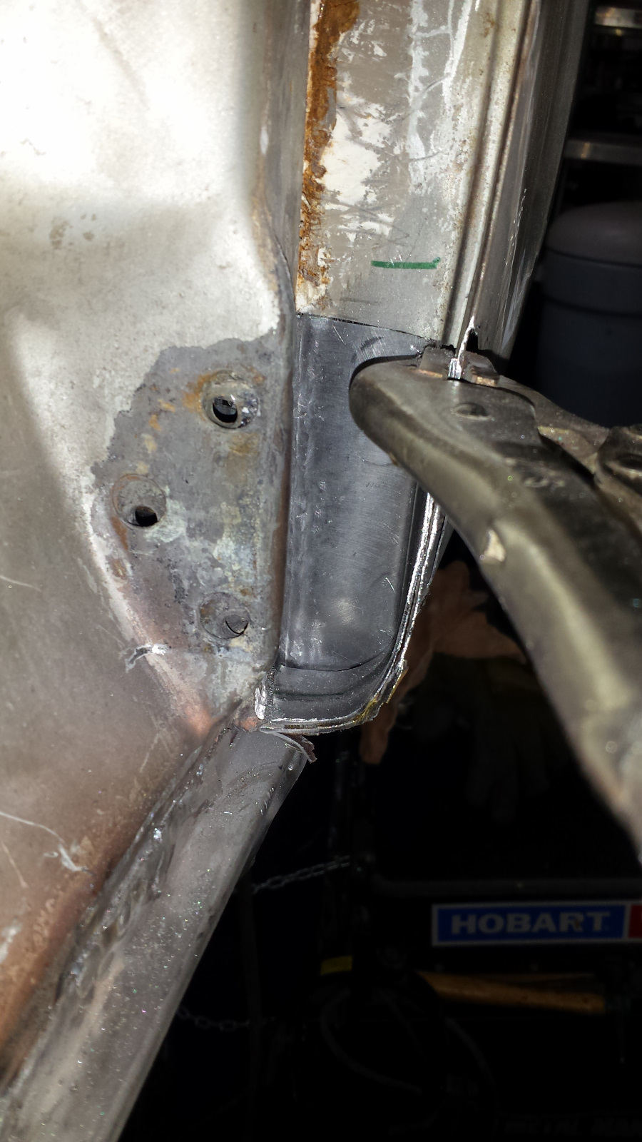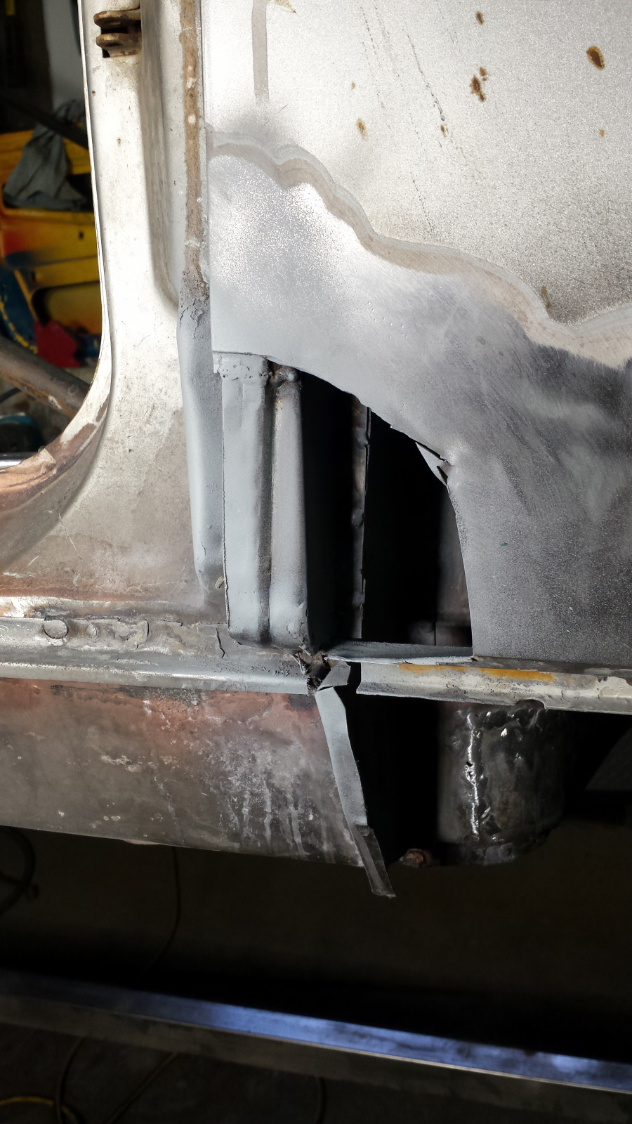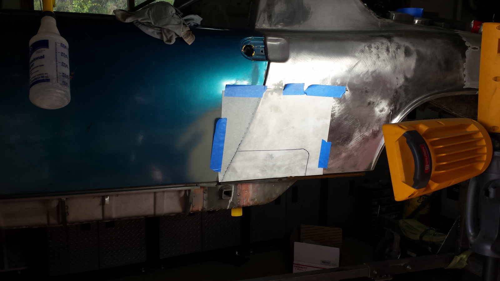 When I got home, I had a lot of other chores to attending to that kept me away from the car and enjoying the nice Montana weather. This Poor Frankenpanel Finally, I was able to get back to the Porsche around mid-day last Sunday. Some days you go to the shop and everything just seems to click. Last Sunday was not that day. I dug into repairing the lower portion of the left rear quarter. First I made a template tracing the rear door edge so I could match the contour for a perfect match with the patch. Cut the patch from the old door and clamped it in. Looks pretty good. Welded it in and that's when things started going sour. It looks pretty good here. But the bend at the lock post wasn't as crisp as the original and I had pretty good luck sharpening the RD panels up with a body hammer. So I tried that on the bottome and totally F@##d up the gap. (IMG:style_emoticons/default/headbang.gif) I think I can fix it without cutting but it will require a long, thick piece of bar stock that I didn't have on hand so will have to wait. The other problem is that I started getting nasty blowout on the vertical section of butt seam. When I cut that opening, the metal looked nice and solid all around the edge, but after the blowout, I peaked around back to find lead spatter out around pitted metal. Just a reminder, this was the panel I farted around with body solder to fill, smooth, and strengthen some moderately pitted areas. The damn stuff sure works because when I inspected to size the patch, it looked like clean, smooth, shiny sheet metal back there. That is - until the welder hit it. (IMG:style_emoticons/default/headbang.gif) That meant yet another patch had to go in to this poor quilt of a panel. I was really starting to envy those who can just RR the whole quarter with NOS. |