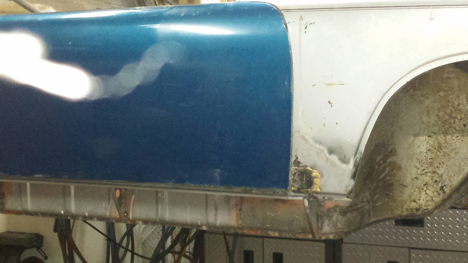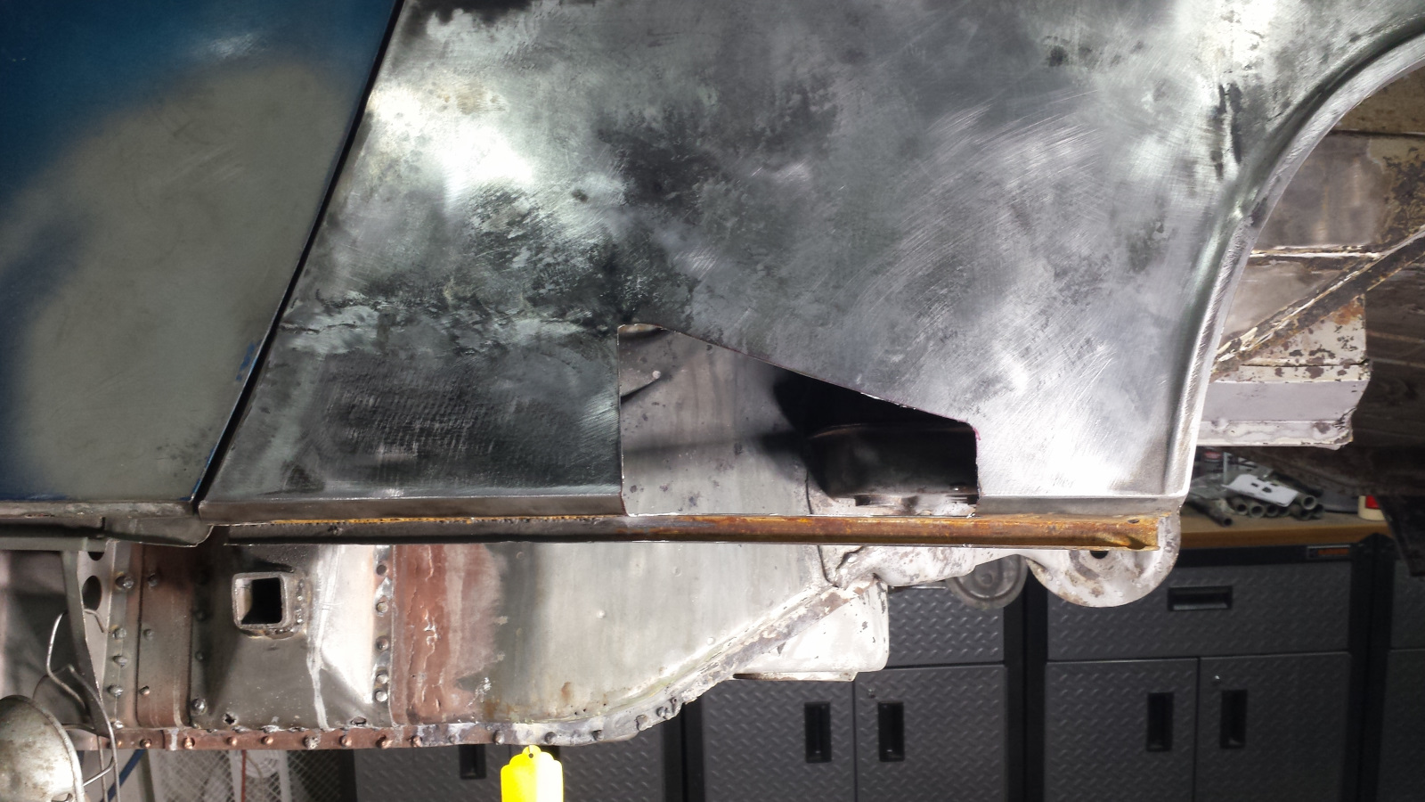 I could have easily clamped the patch in to match, but I could feel a couple of bulges in the quarter so I pulled out the good 'ol shrinking disc. After a few passes with the disc, the patch aligned perfectly. There was still a bulge above the first patch that wouldn't shrink out, so I had to make a relief cut in the seam for the first patch. Then the shrinking disc was able to to do it's magic before the switch on my grinder suddenly quit. (IMG:style_emoticons/default/headbang.gif) But today I was able to finish the patch work with a lot of tweaking and cussing. It's still a work in progress as that panel needs a lot of work to straighten it out. I'm pretty sure it will need a bit of bondo, but I'll get it as close to straight as I possibly can. |