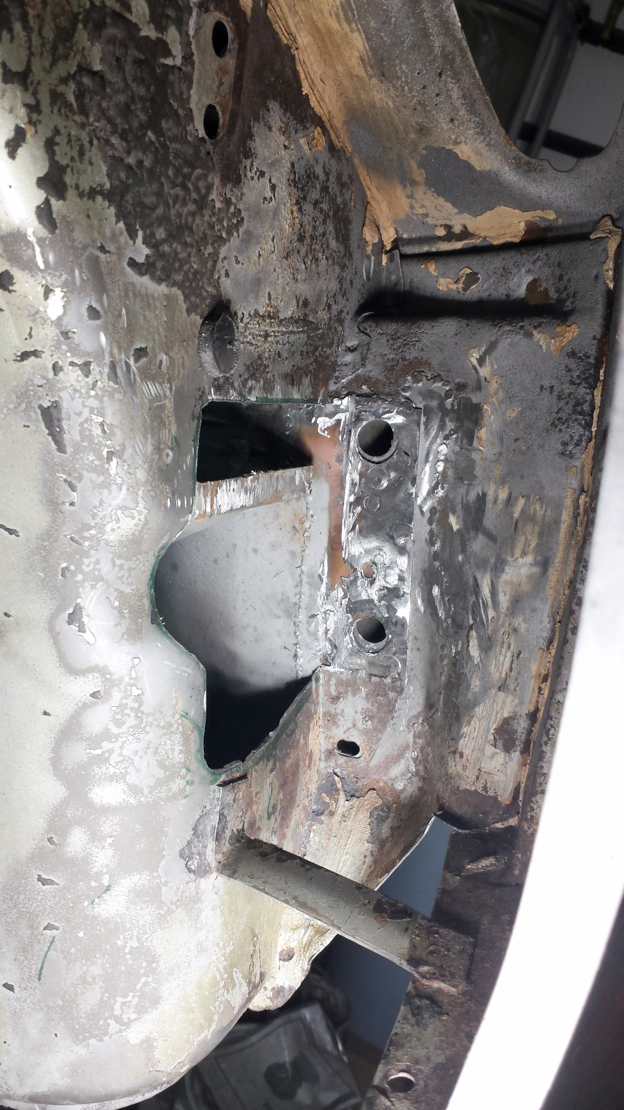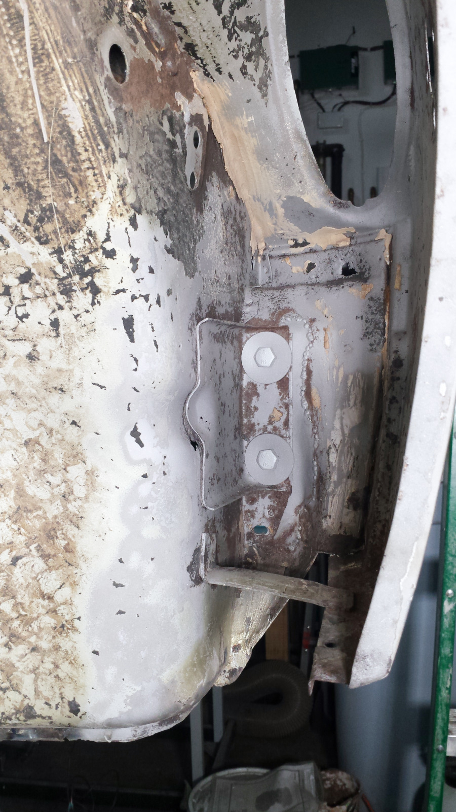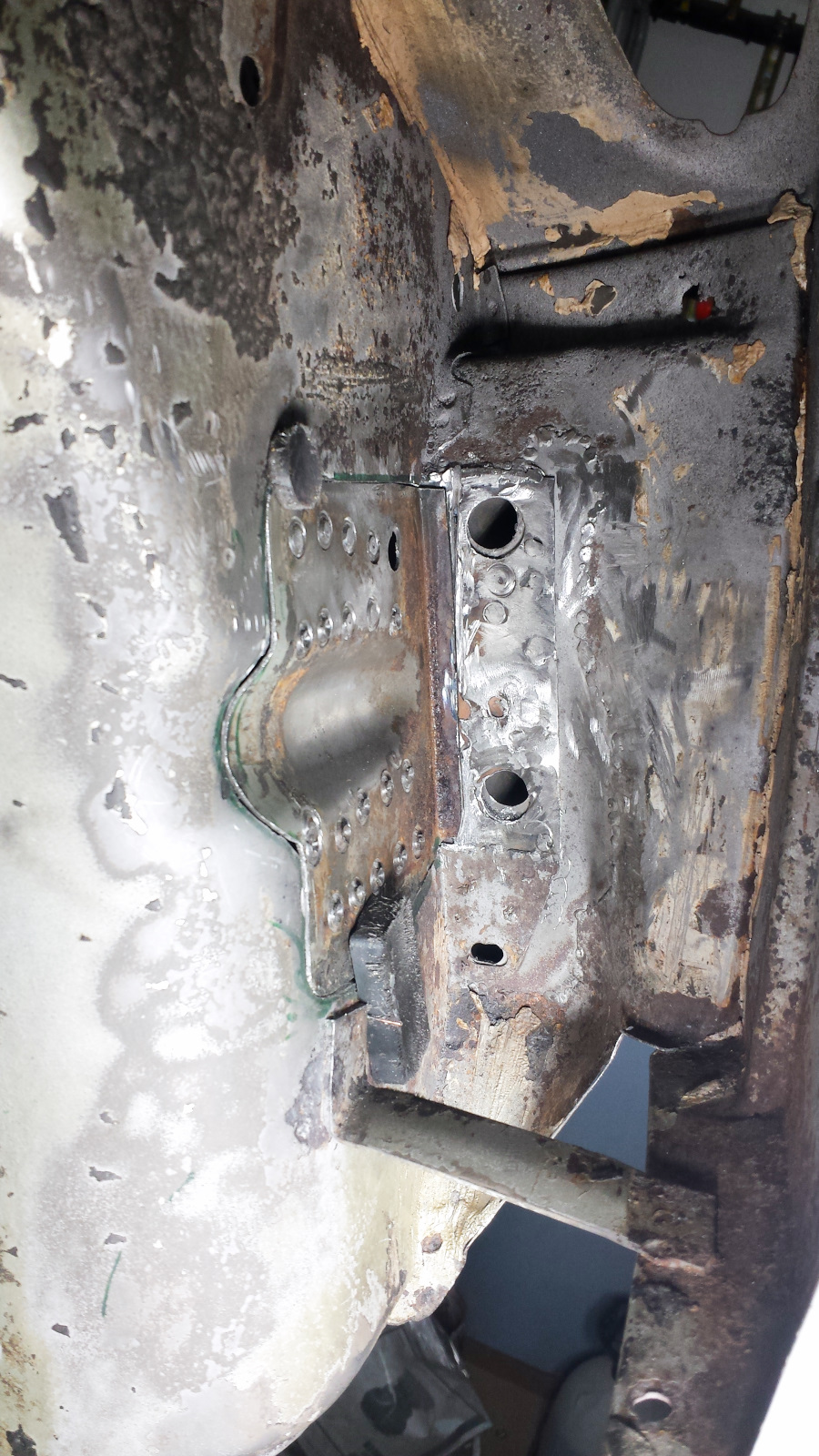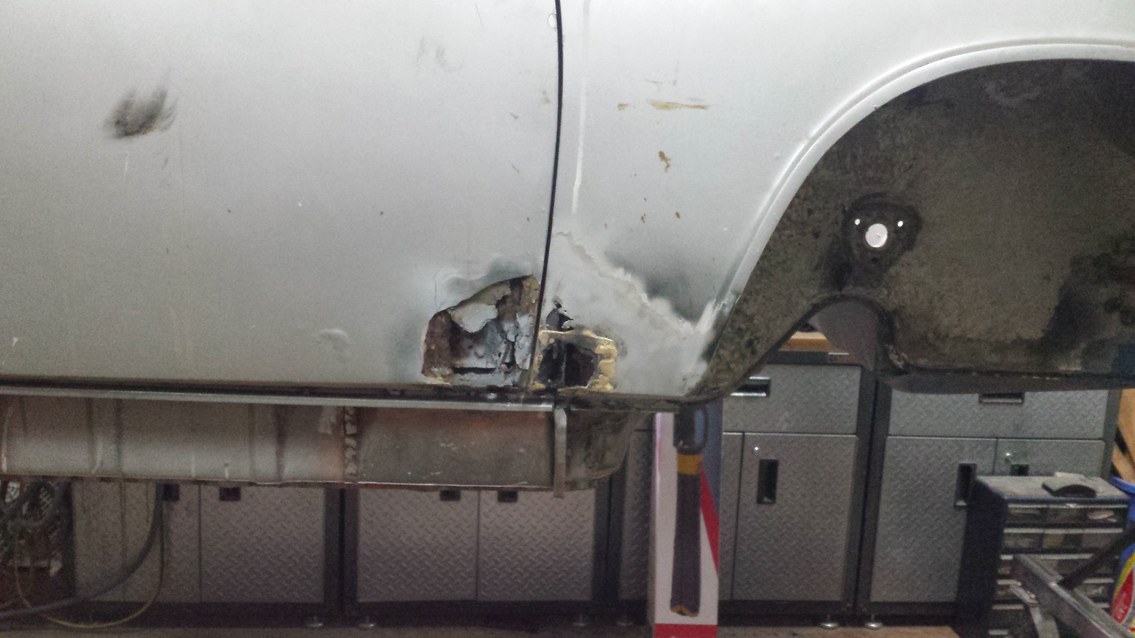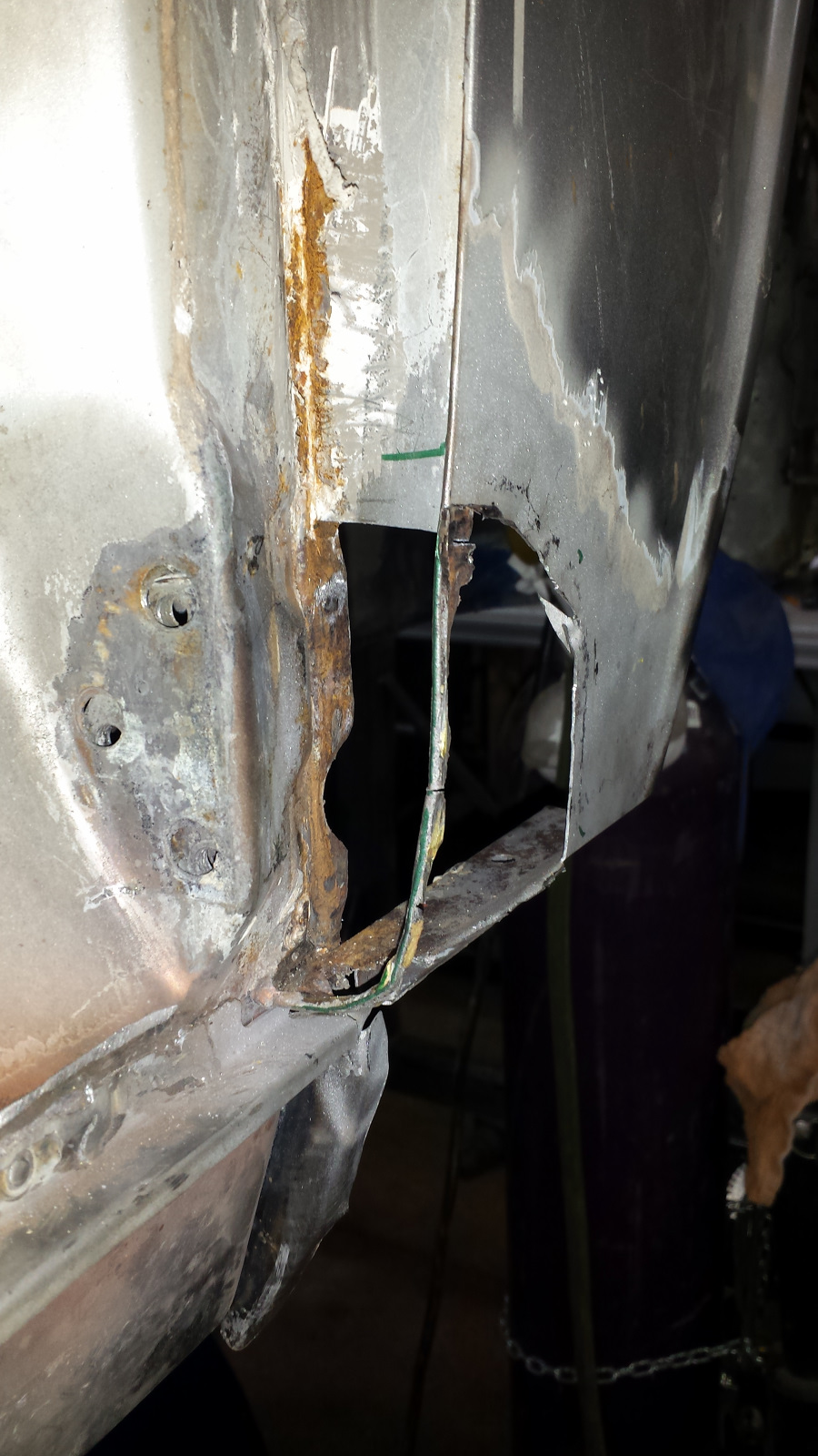 I also forgot to mention that I started last Sunday by replacing the diodes (and both capacitors) on my welder for a second time. It is a total PITA job that set me in a foul mood before diving into that rear quarter bottom. No doubt that contributed to stupid mistakes. (IMG:style_emoticons/default/beer3.gif) Made a little progress today. First I flipped the car around in the shop which isn't easy, but gives me better access to the passenger side. Time to dive into this mess. Nasty rot at the bottom of the door and fender. Somebody has been in there before to braze in patches (there was one on the door too but it is gone now). Let's see what I can do with that door rot first. Well that was easy! Thanks to Marc O. (IMG:style_emoticons/default/av-943.gif) A couple bolts and even the gaps and alignment look good. (IMG:style_emoticons/default/cheer.gif) |