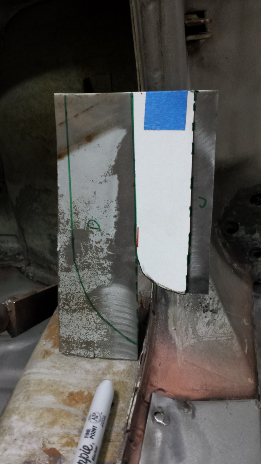 Had some distractions be finished up the fender patch this evening. It was largely just a repeat of what I did on the other side so I'll try not to repeat, but the lower hinge post repair was more extensive so I'll give a little detail how I approached it. That little piece is quite a complicated affair. there is a flat area that fills the space between the fender wall and inner hinge post with a flange that spot welds to the chassis inside the fender, then there is a little bead around the perimeter that makes a little step out to the outer flange where the fender skin crimps on. The step is shallow in depth at the top but tapers to deeper at the bottom, and the whole affair curves around at the bottom to follow the fender contour. That area is not visible with the doors on, even when they are open, so I wasn't concerned with getting an absolutely exact match. I just wanted to match the structural function but get as close to the original as possible. It took some time to figure out how to tackle this with my caveman set of tools. It started with making a cardboard template of the inner flat area. The template was transferred to a metal blank and then the bend line for the spot weld flange was marked and the piece was trimmed leaving plenty of extra metal for the step bead and crimp flange. Then the line for the step bead was marked. It looks goofy here but will make sense later. Next, I dusted off the old hammer form used for fabbing the inner long bottoms and banged out the step. Then into the brake to form the outer wall with step bead and flange. Finally, the bottom was rolled to form the piece. After bending the spot weld flange in the vice, it was ready for trimming. The tricky part was removing the original material but leaving enough of an outline to serve as a kind of wire frame for final fitting and trimming. Then I could clamp the patch in place and use the frame to mark trim lines. Final trim was done but grinding away the original door skin that remained on the wire frame with the patch clamped in place. That brought the edges of the new crimp flange exactly to the depth of the originals. too be continued... |